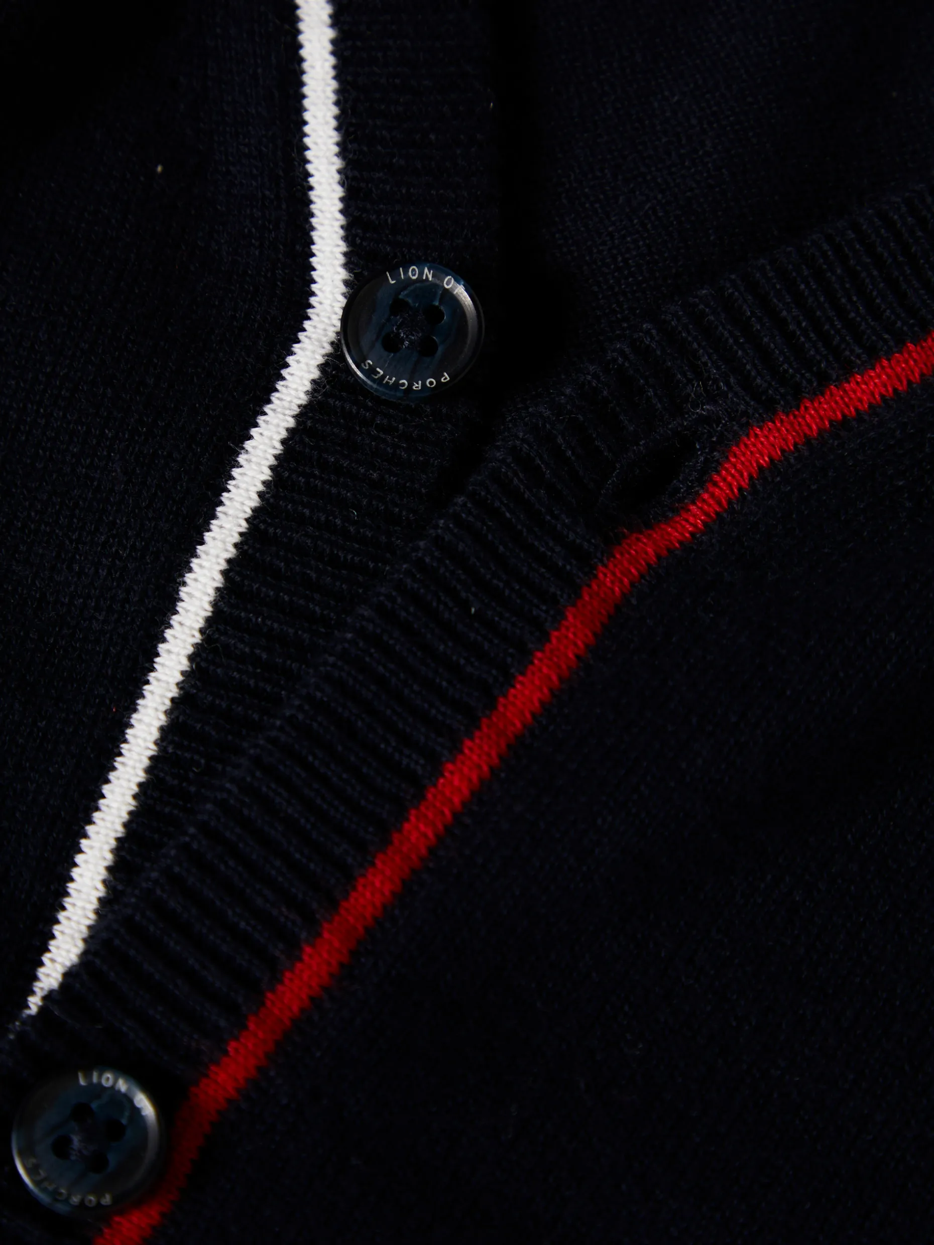 Casaco de malha com botões e decote V. Pormenor diferenciador de riscas em contraste à volta do decote e por toda a carcela. Base, punhos e gola canelados. Finaliza com etiqueta leão da marca em contraste de cor no peito.