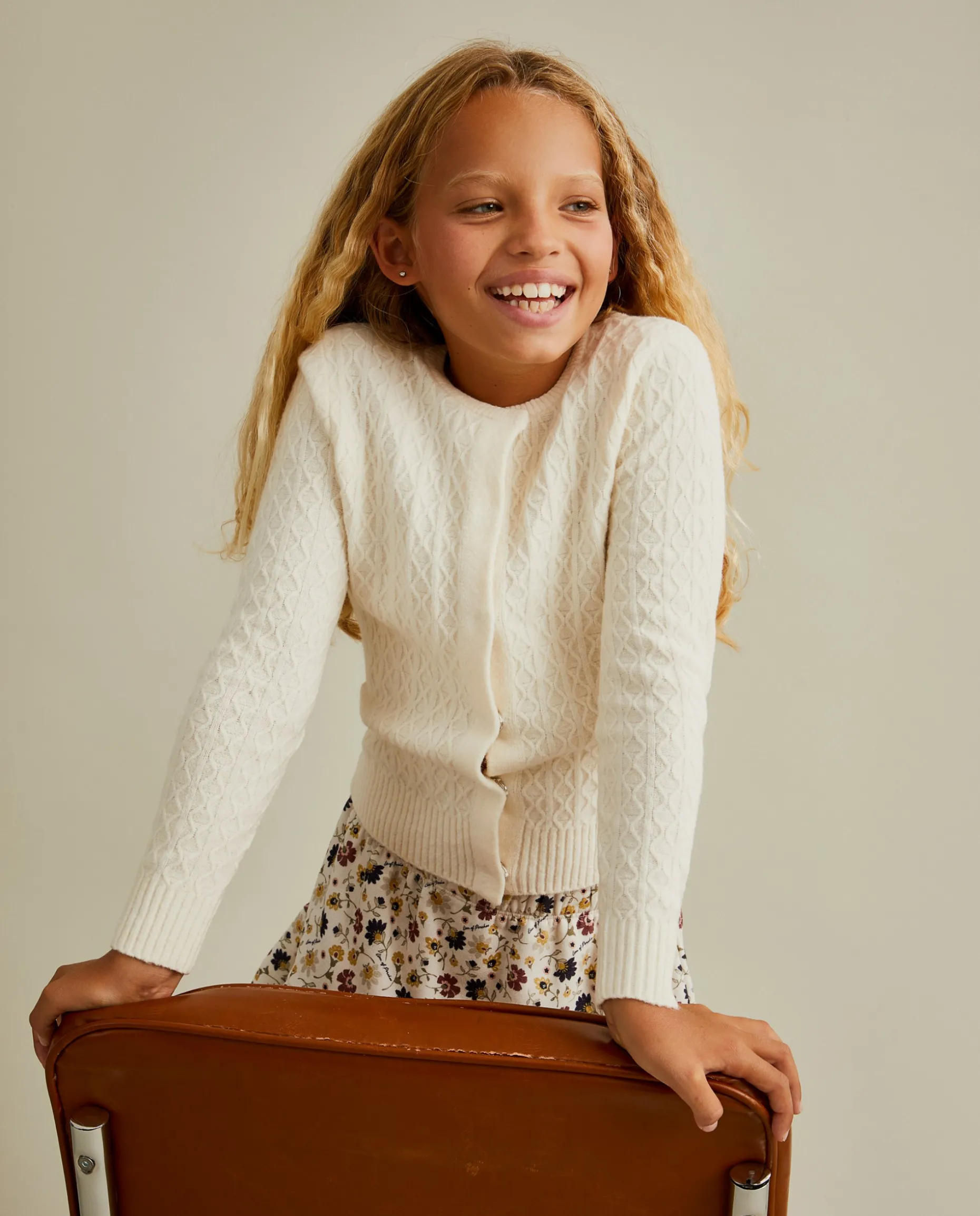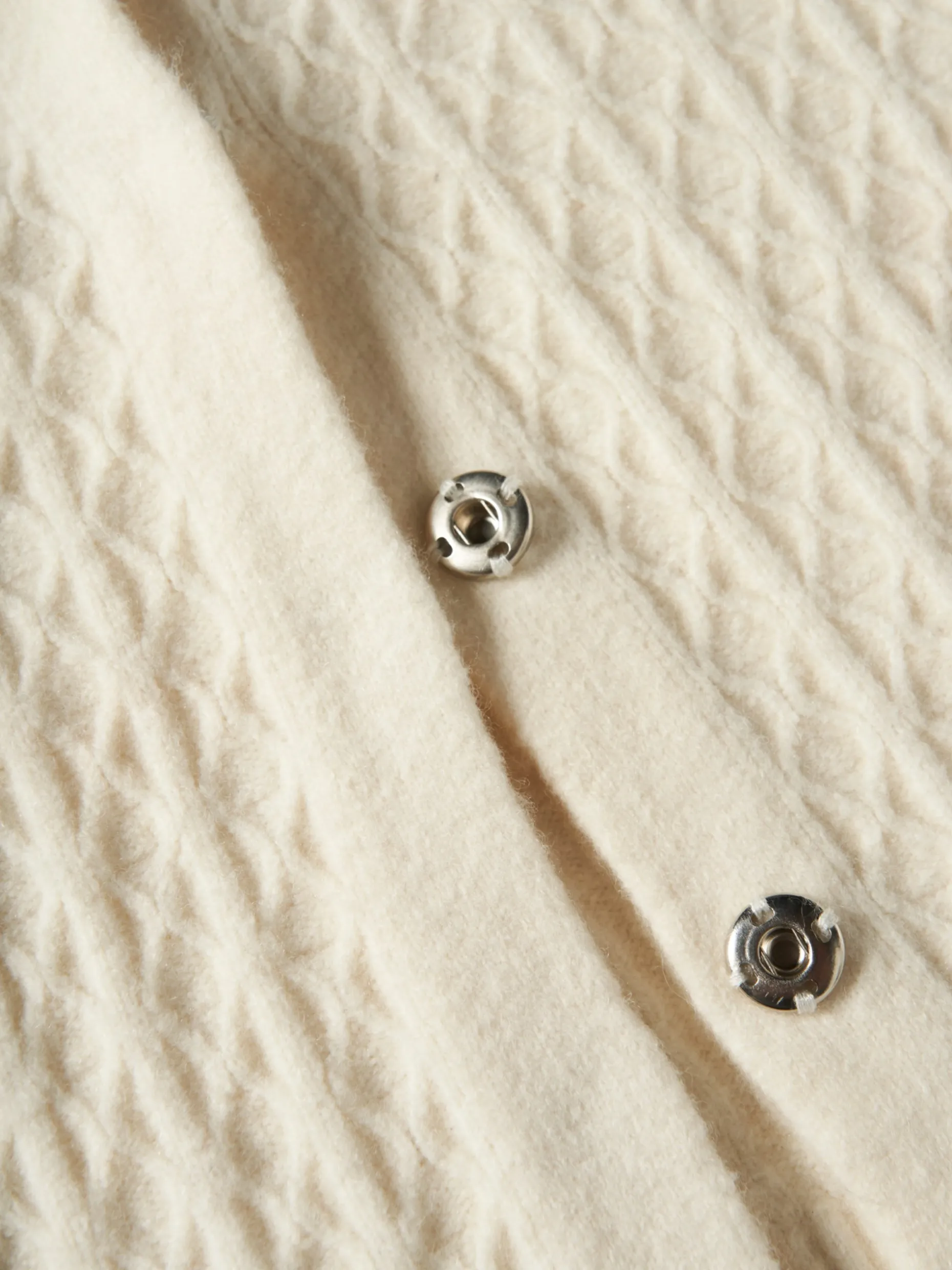 Casaco de malha quentinho e confortável, com manga comprida e textura ondulada. Aperta na frente com molas escondidas e finaliza com canelado na base, gola e punhos. Placa Lion no fundo.