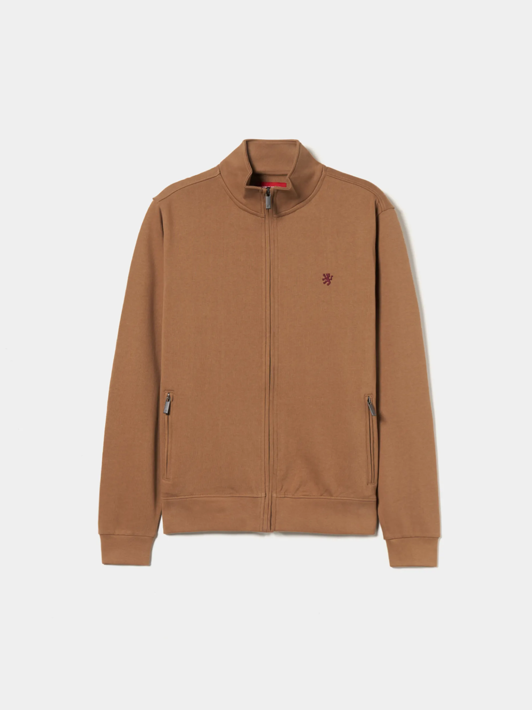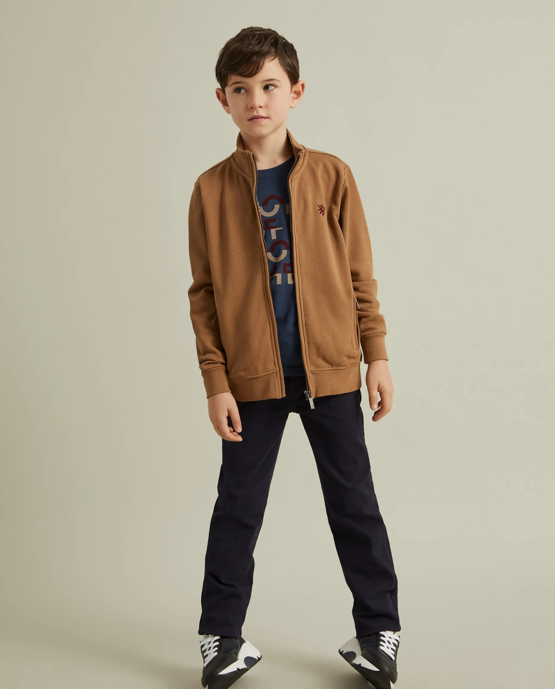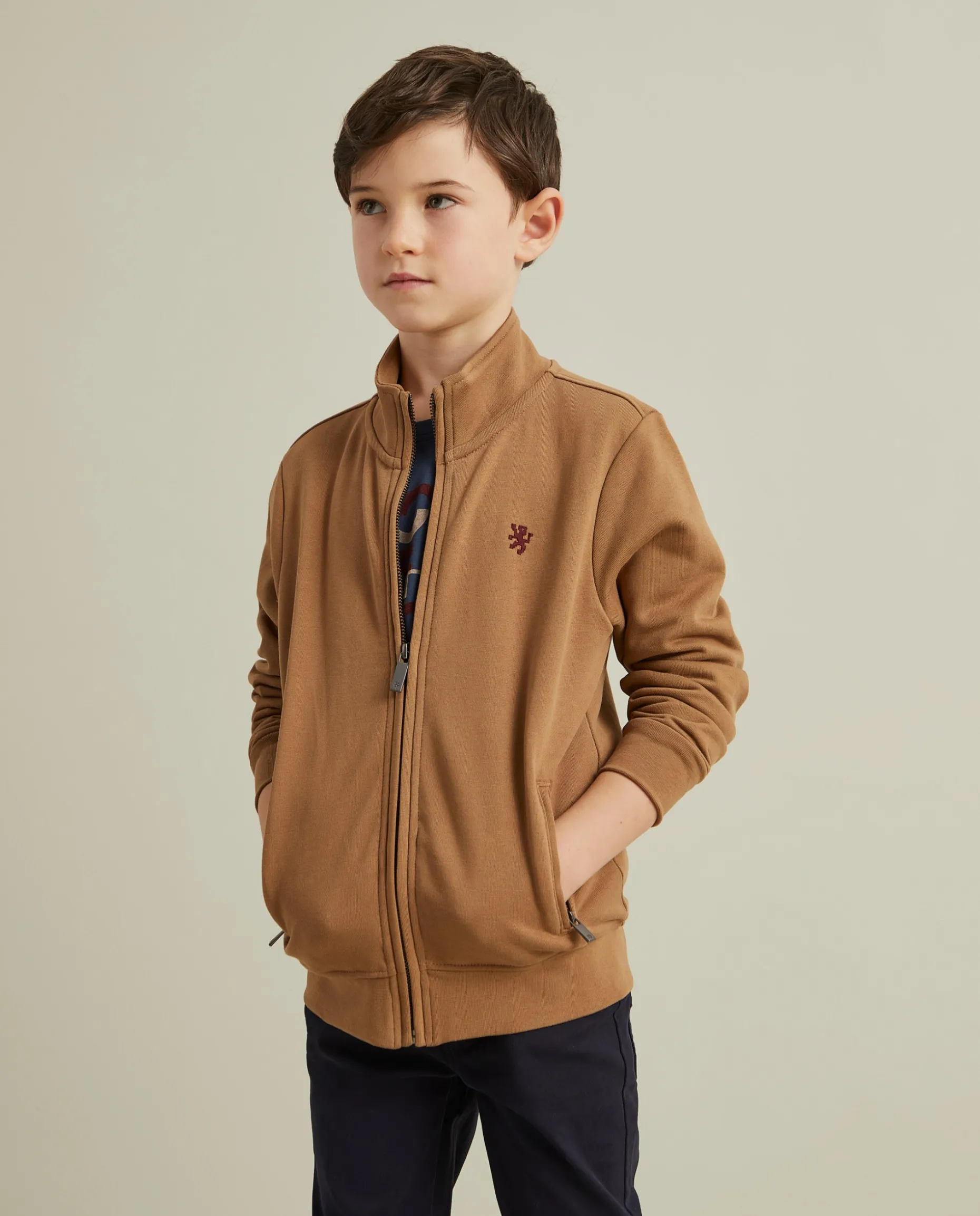Casaco de manga comprida em malha com fecho de duplo cursor. Bolsos laterais com fecho zíper. Leão da marca em contraste no peito. Interior em xadrez em contraste.