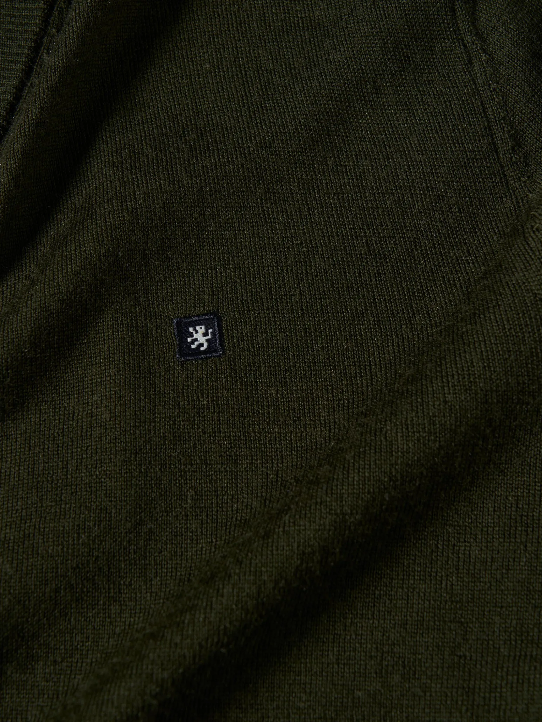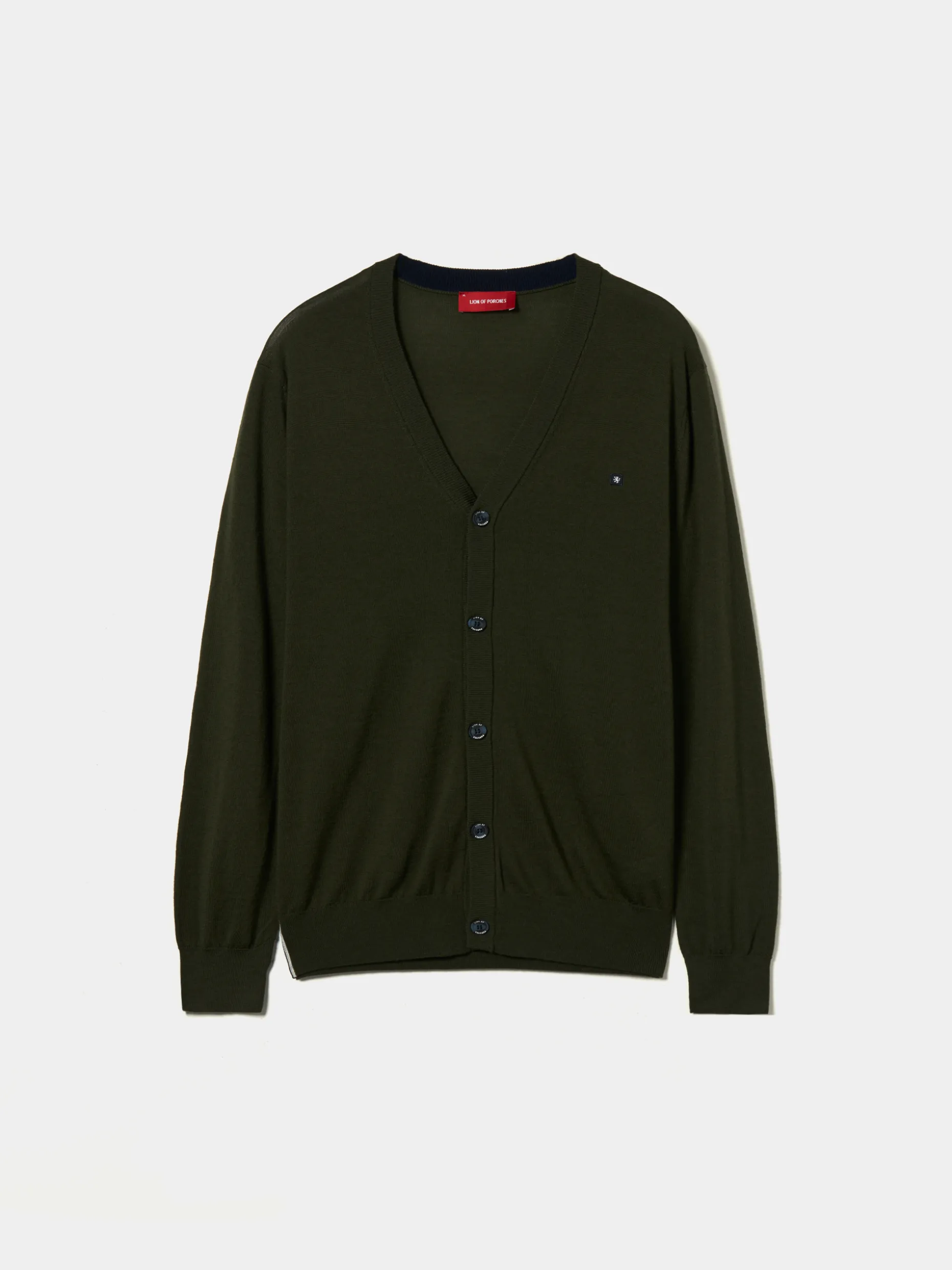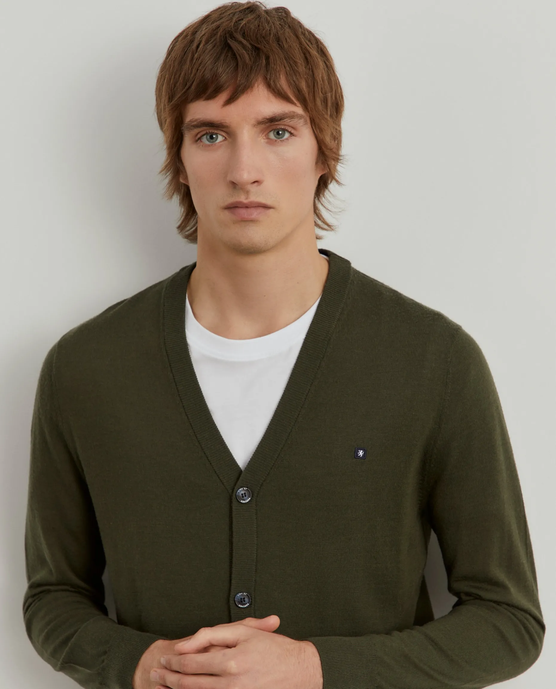 Casaco manga comprida com etiqueta leão no peito. Riscas tricolor no fundo. Interior da gola em contraste. Botões personalizados em contraste.
