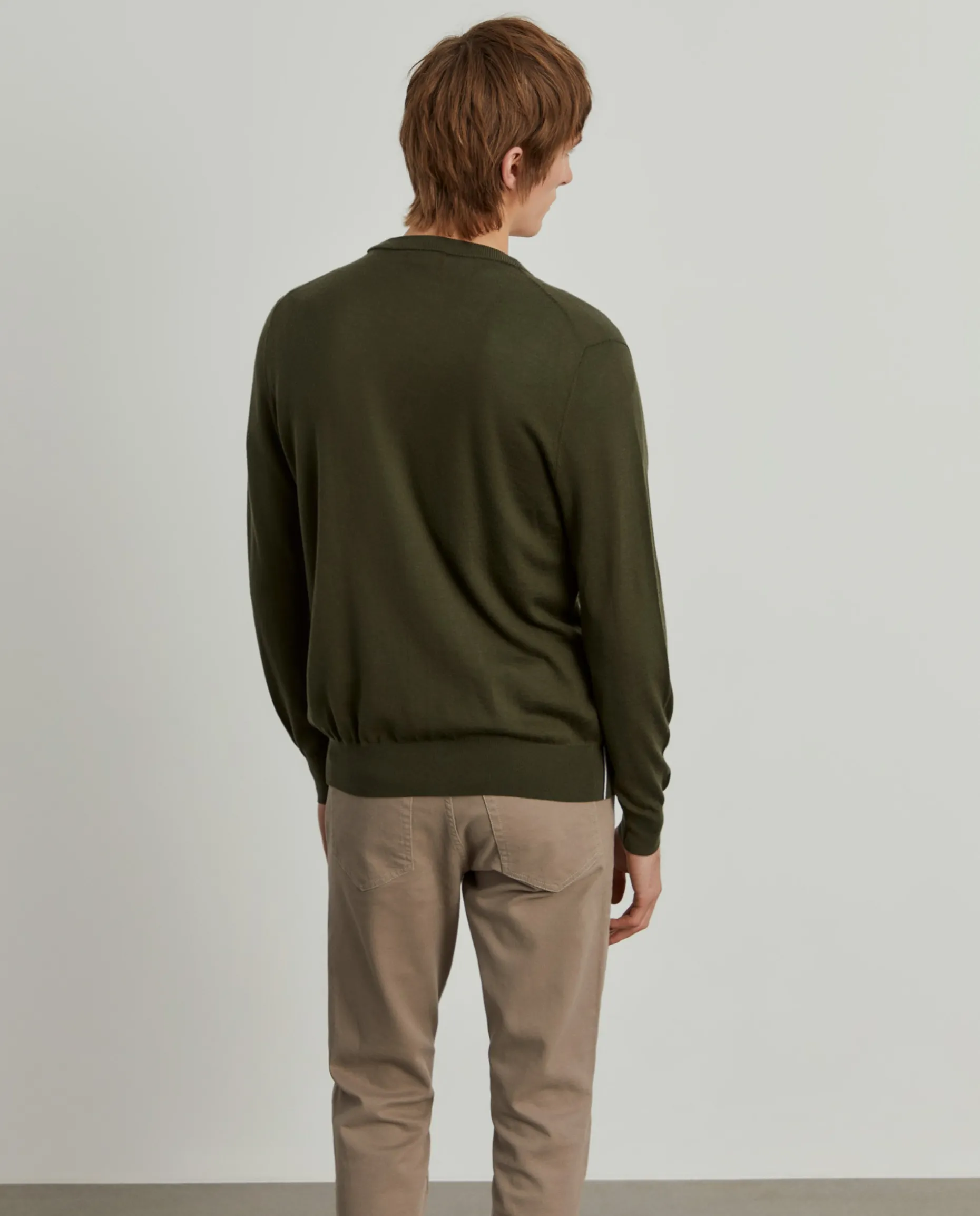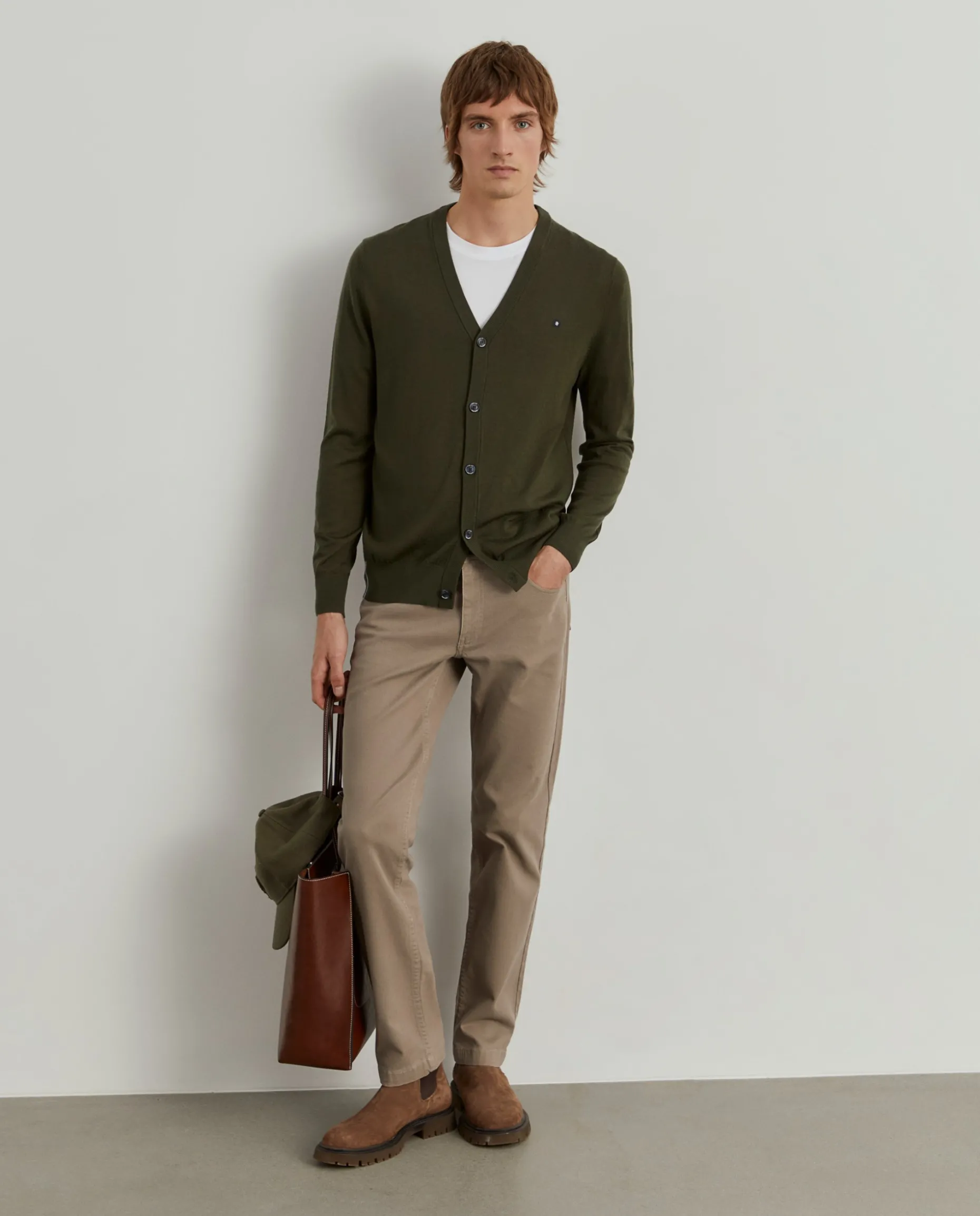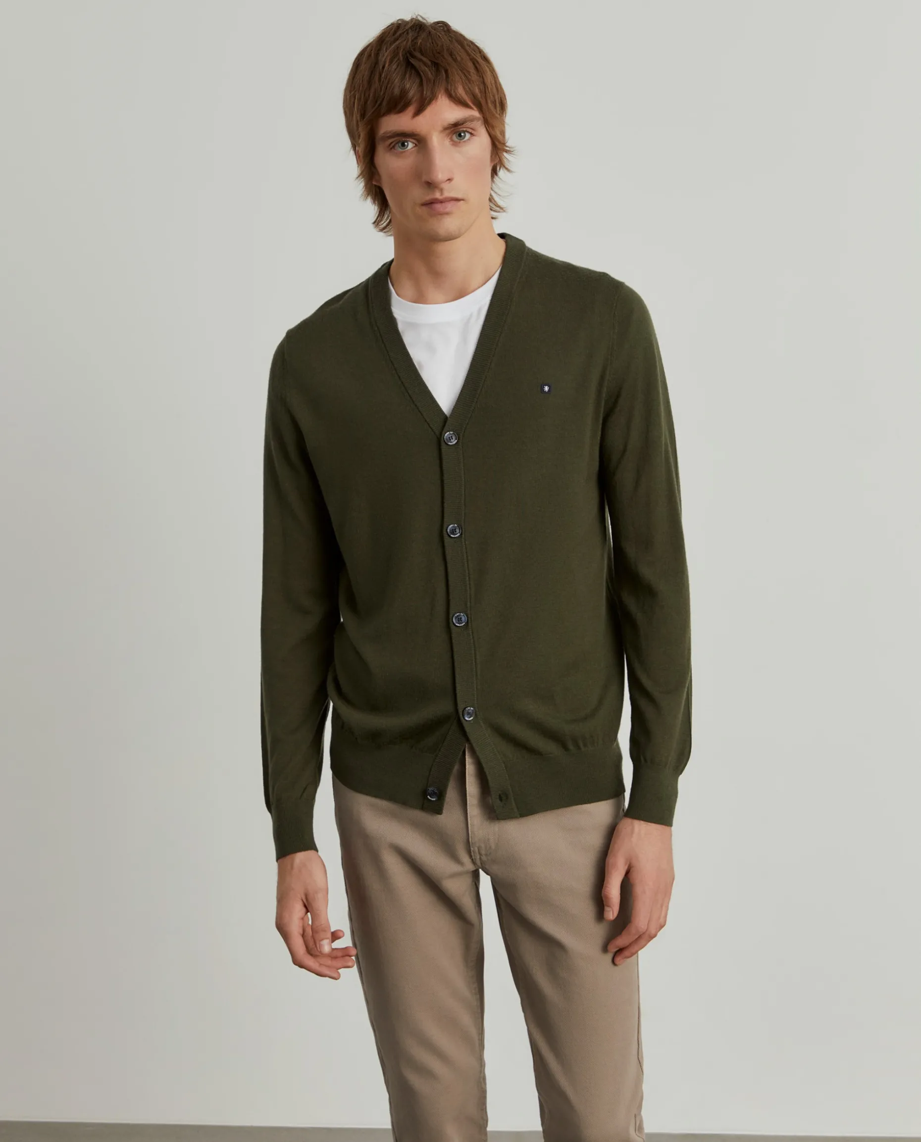 Casaco manga comprida com etiqueta leão no peito. Riscas tricolor no fundo. Interior da gola em contraste. Botões personalizados em contraste.
