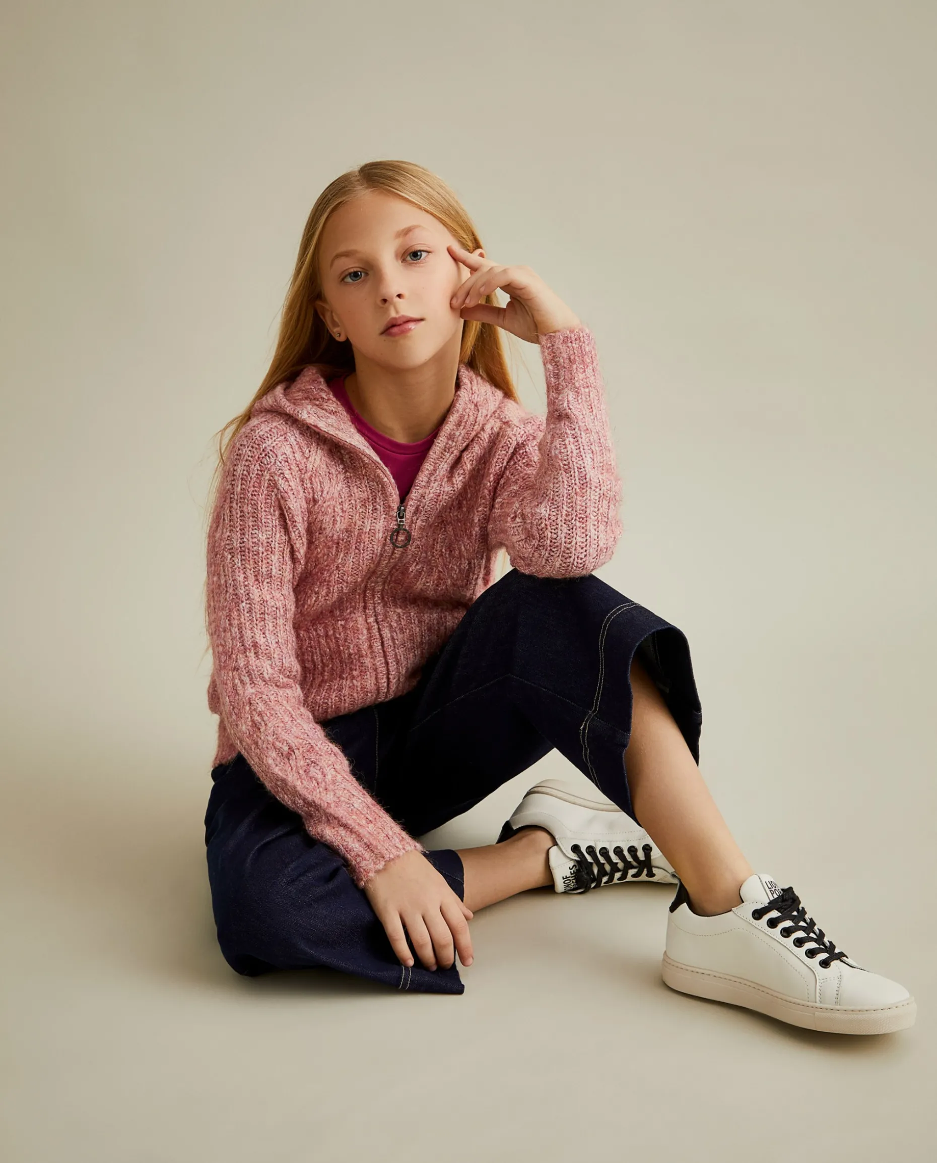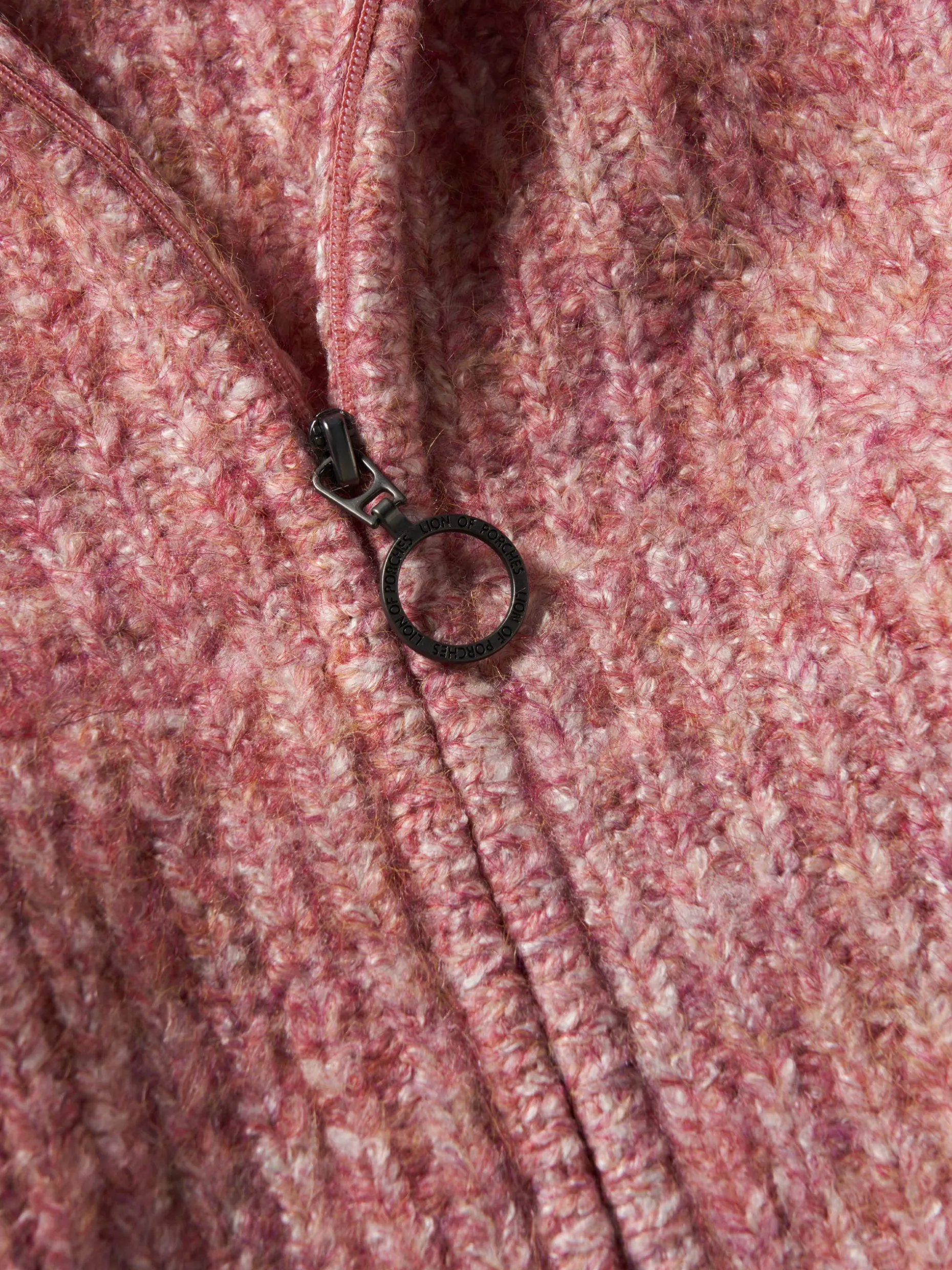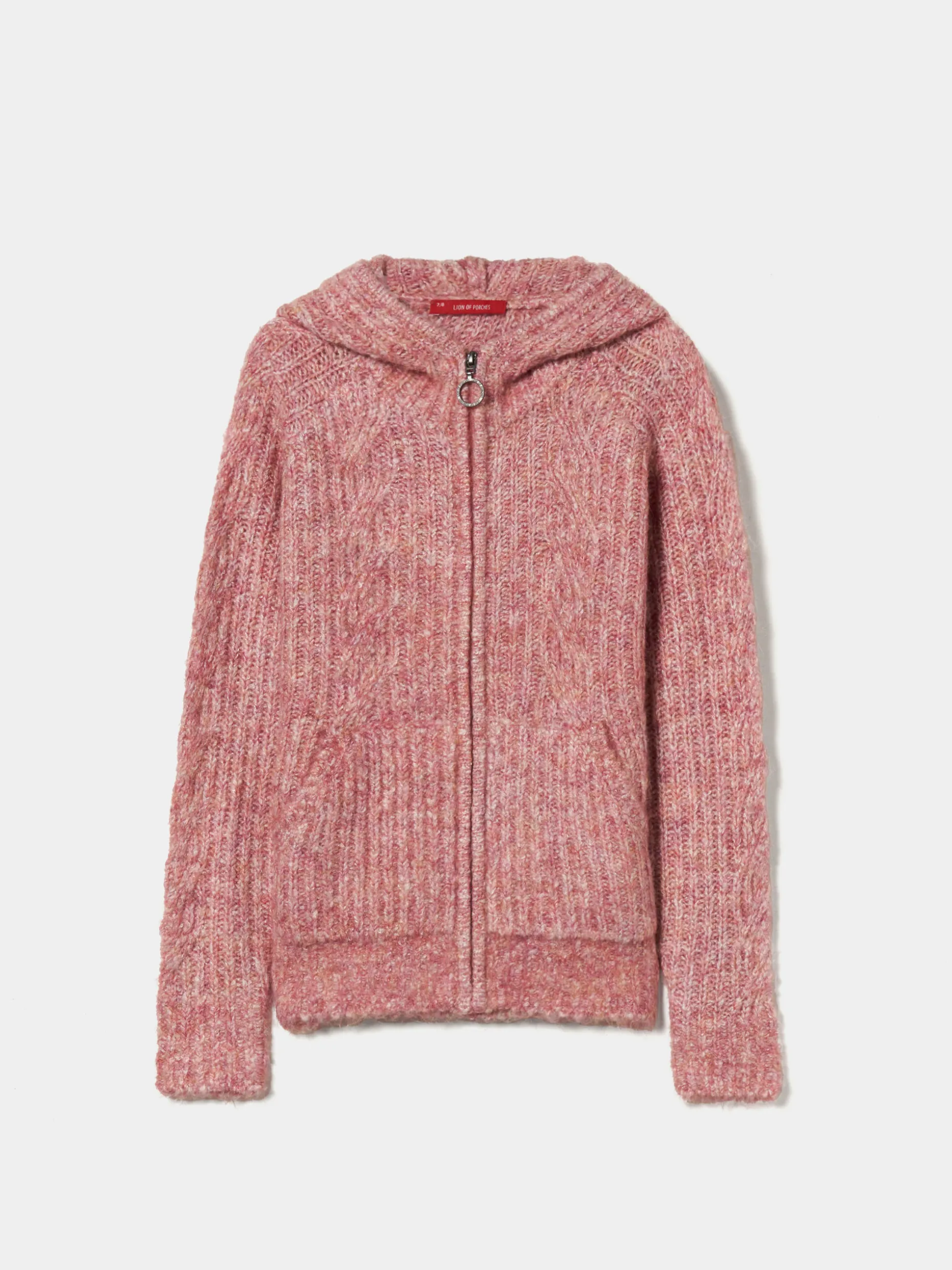 Casaco de malha tricotada com capuz, perfeito para garantir conforto nos dias mais frios. Aperta na frente com fecho de cursor personalizado e finaliza com bolsos na frente.