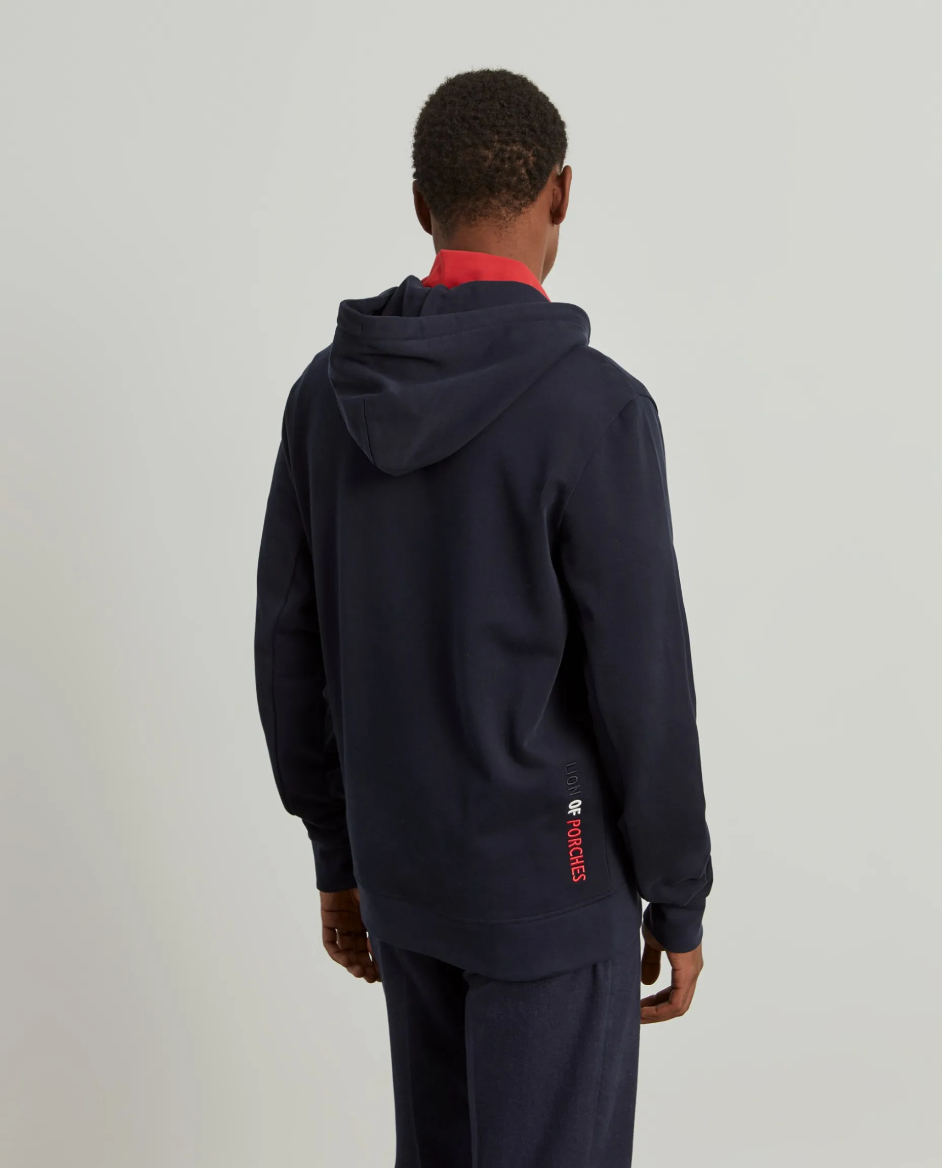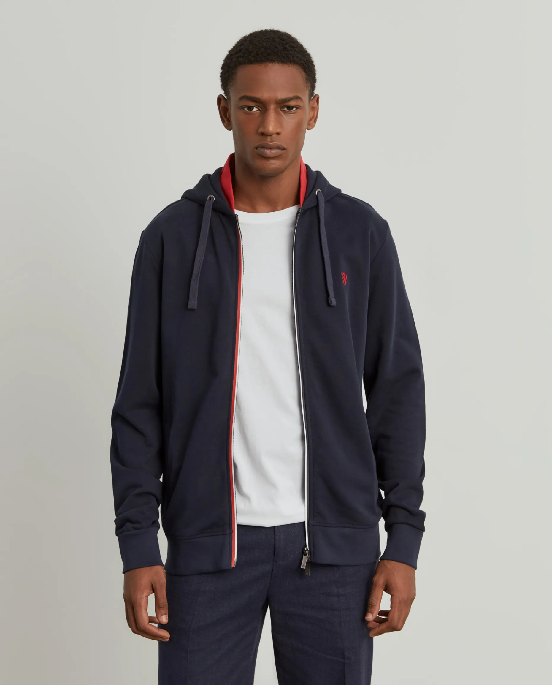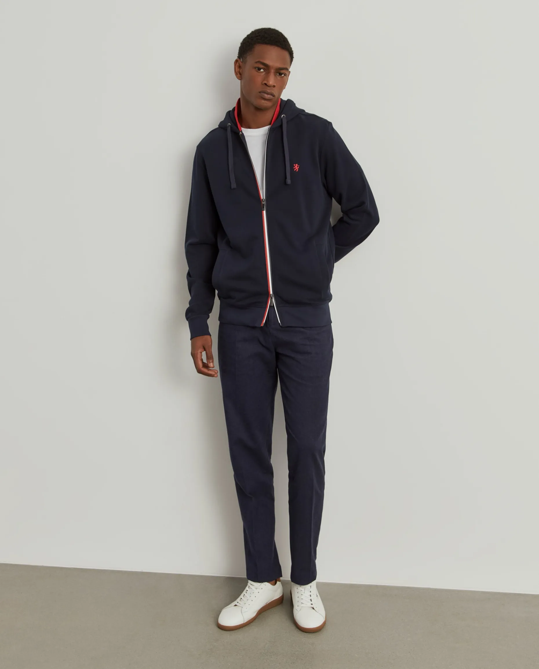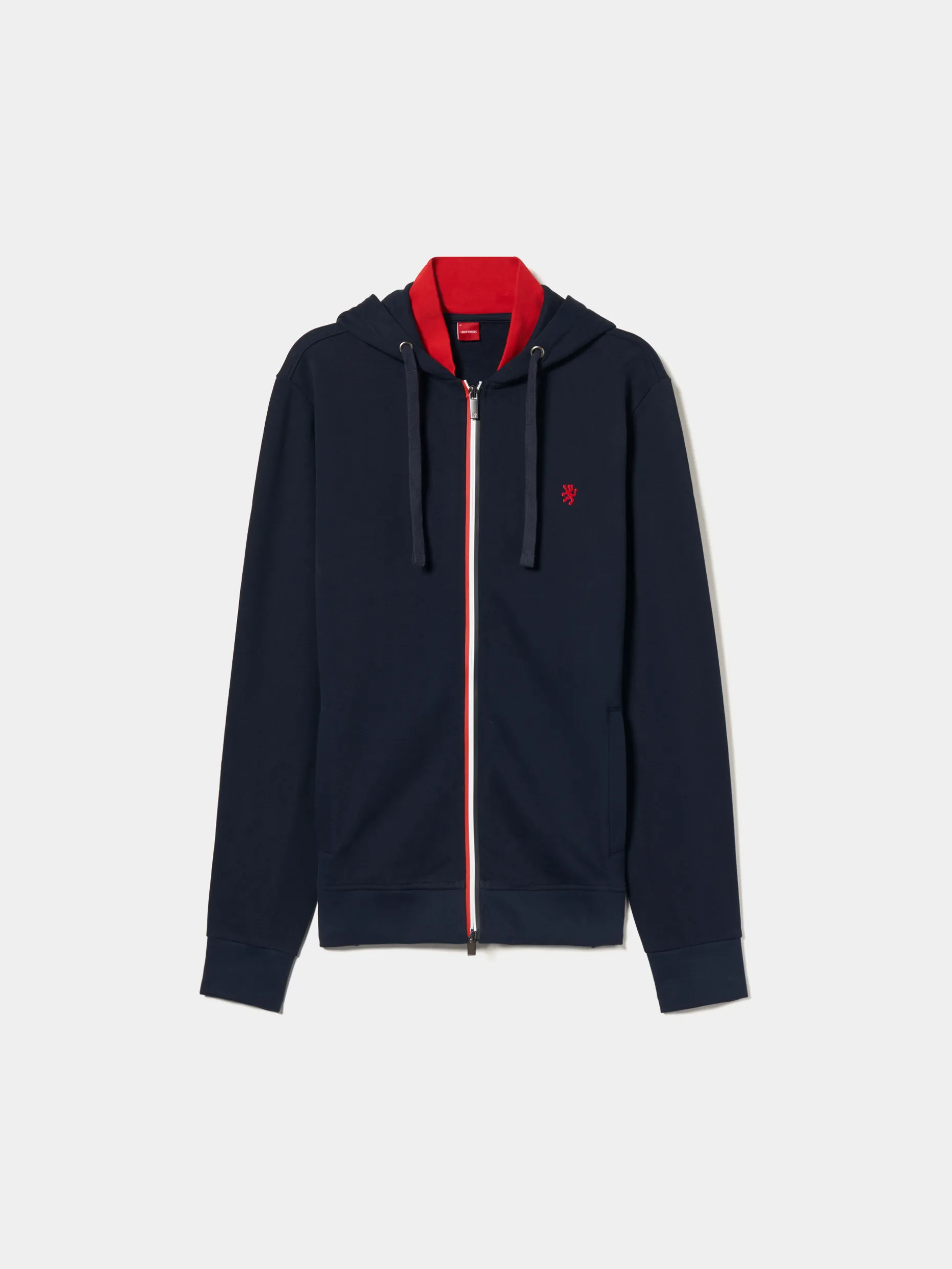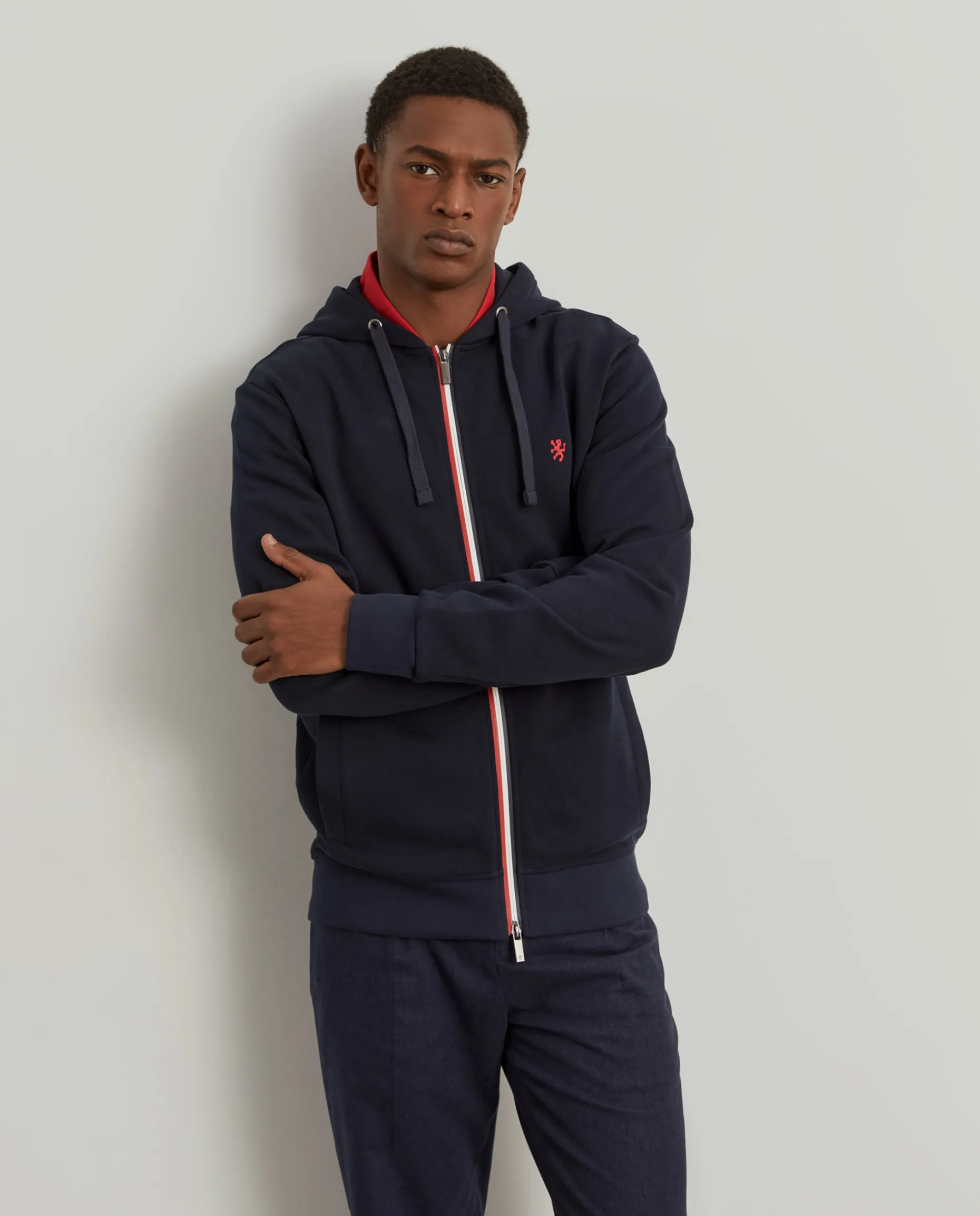 Para os dias leves e descontraídos, opte por este casaco de malha, de manga comprida, com capuz. Com capuz ajustável e gola alta, no seu interior, em contraste de cor. Aperta através de fecho zíper de duplo cursor com riscas em contraste. Pequeno leão da marca no peito.