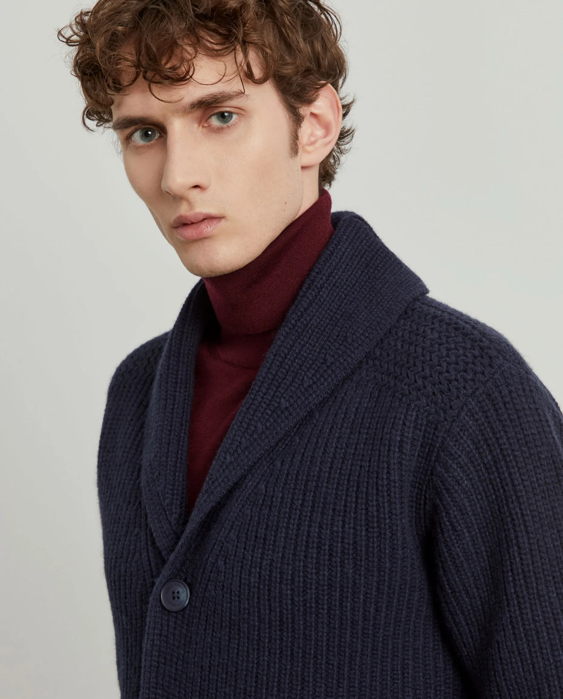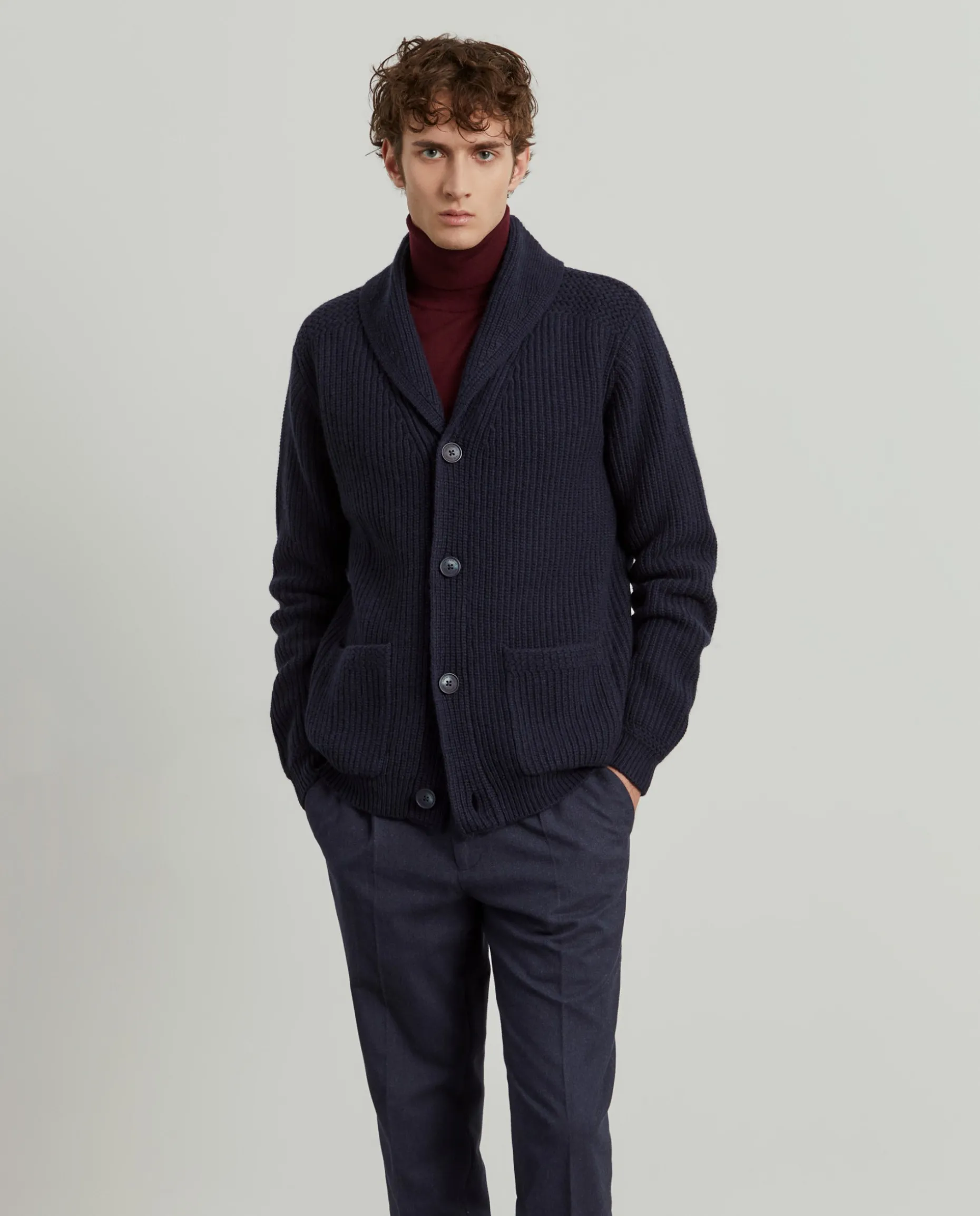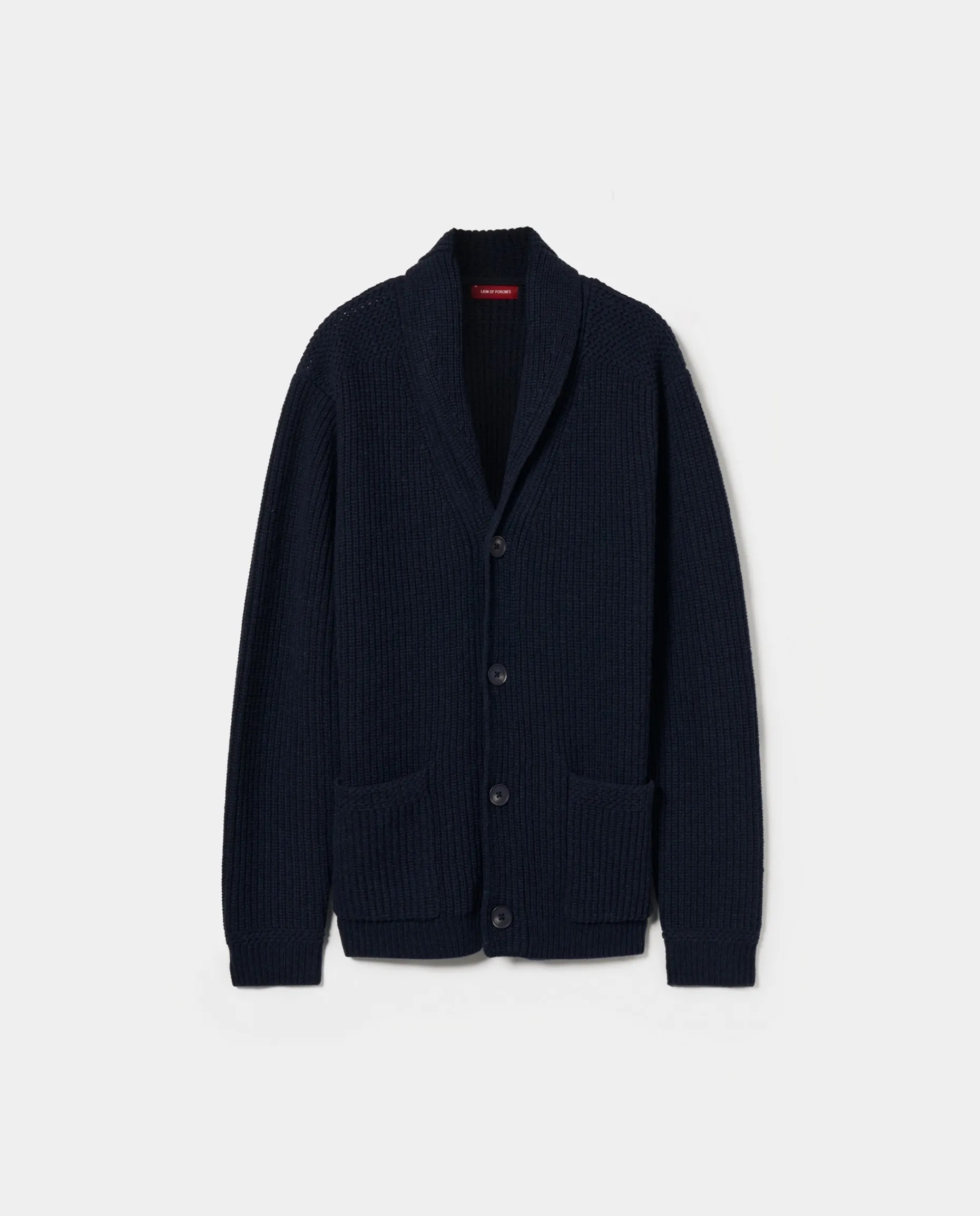 Casaco de malha tricotada, de manga comprida, confecionado com uma mistura de lã. Com decote em V e gola dobrada. Finaliza com botões de chapa na frente.