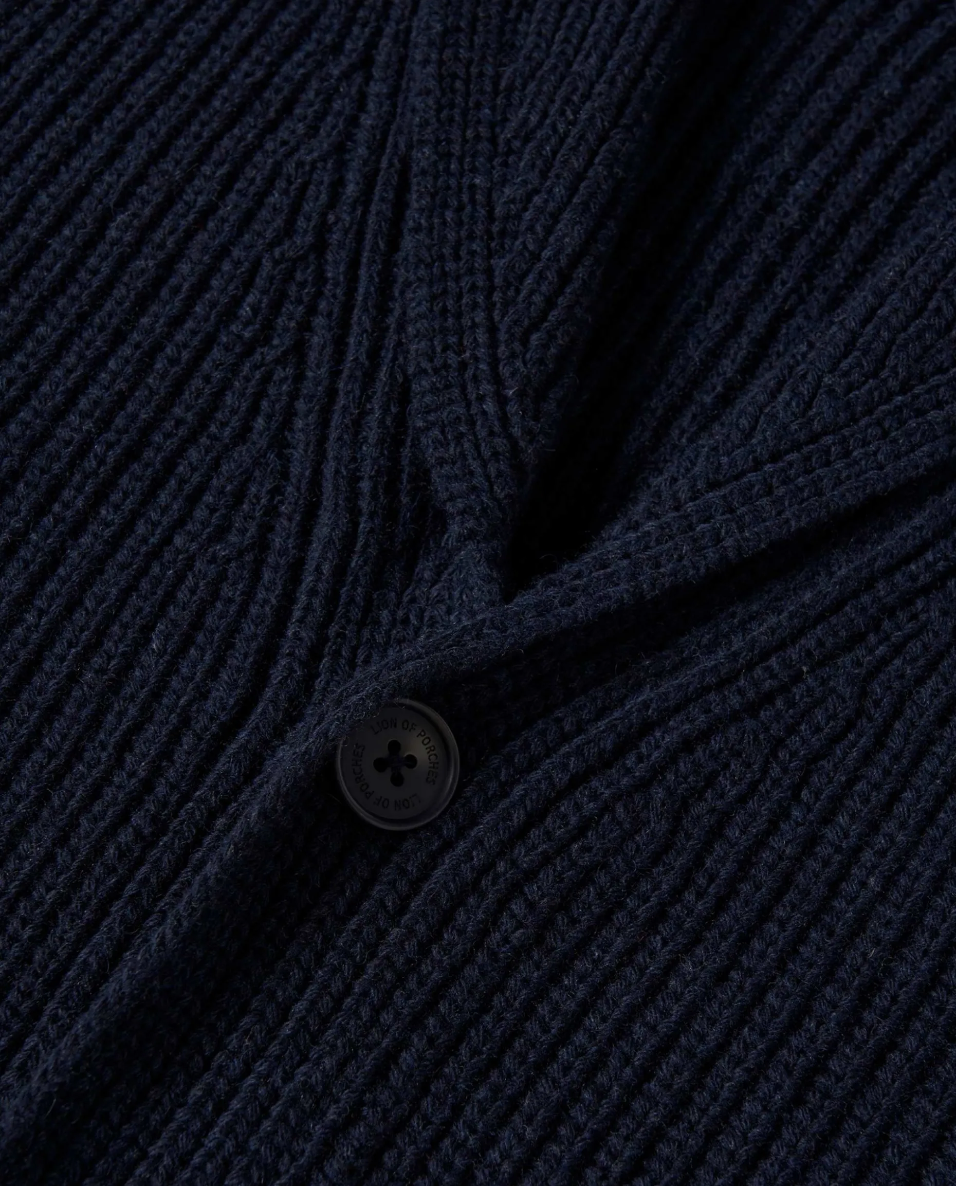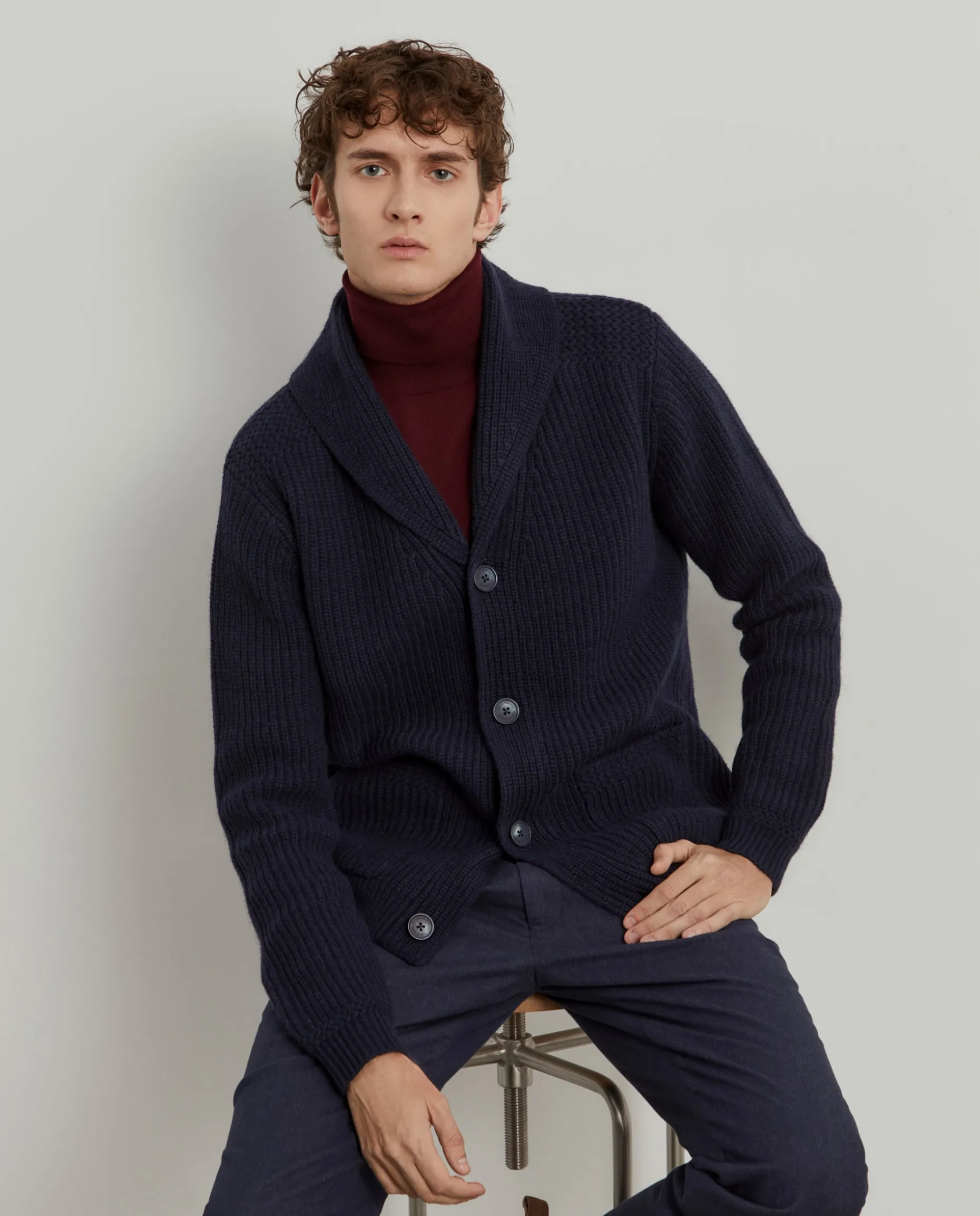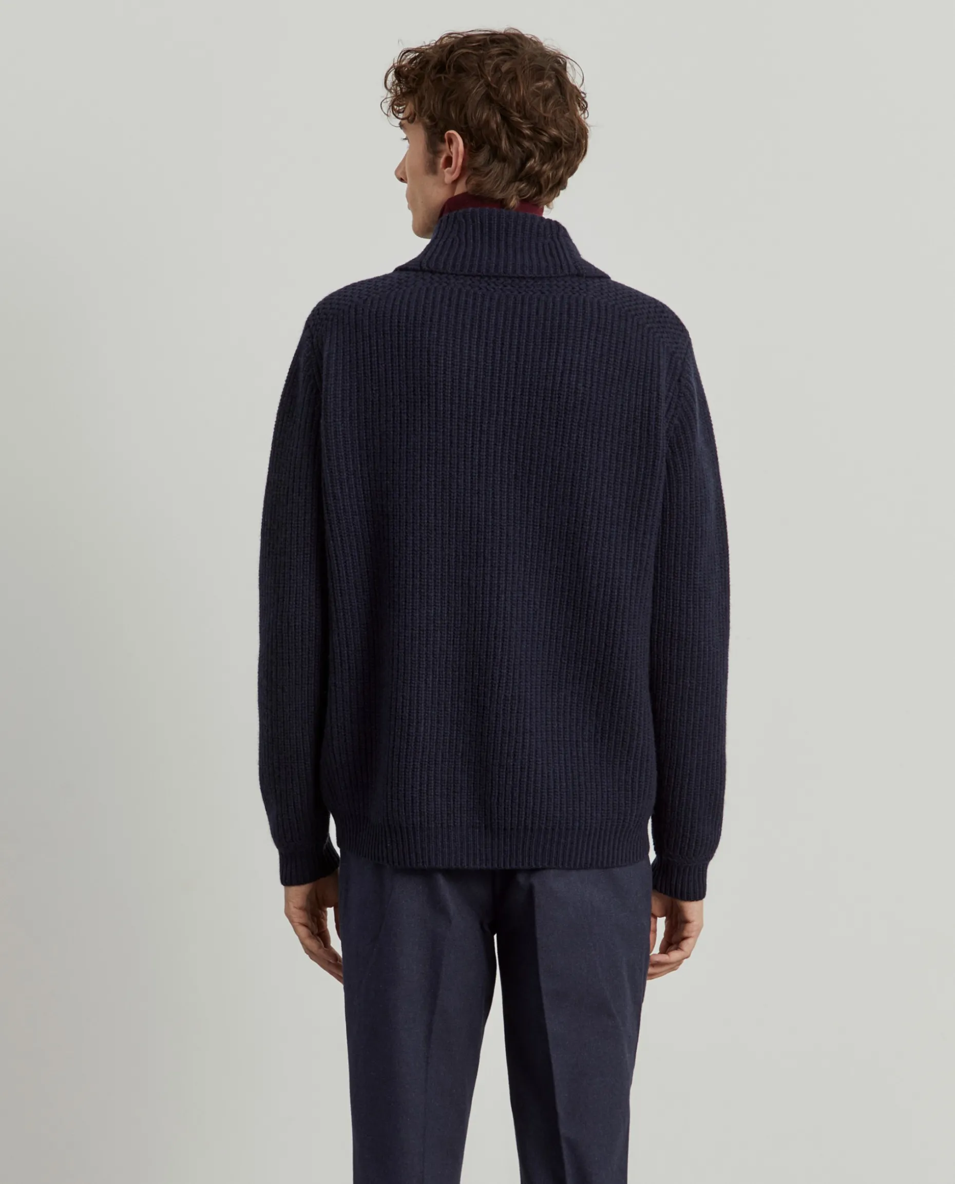 Casaco de malha tricotada, de manga comprida, confecionado com uma mistura de lã. Com decote em V e gola dobrada. Finaliza com botões de chapa na frente.