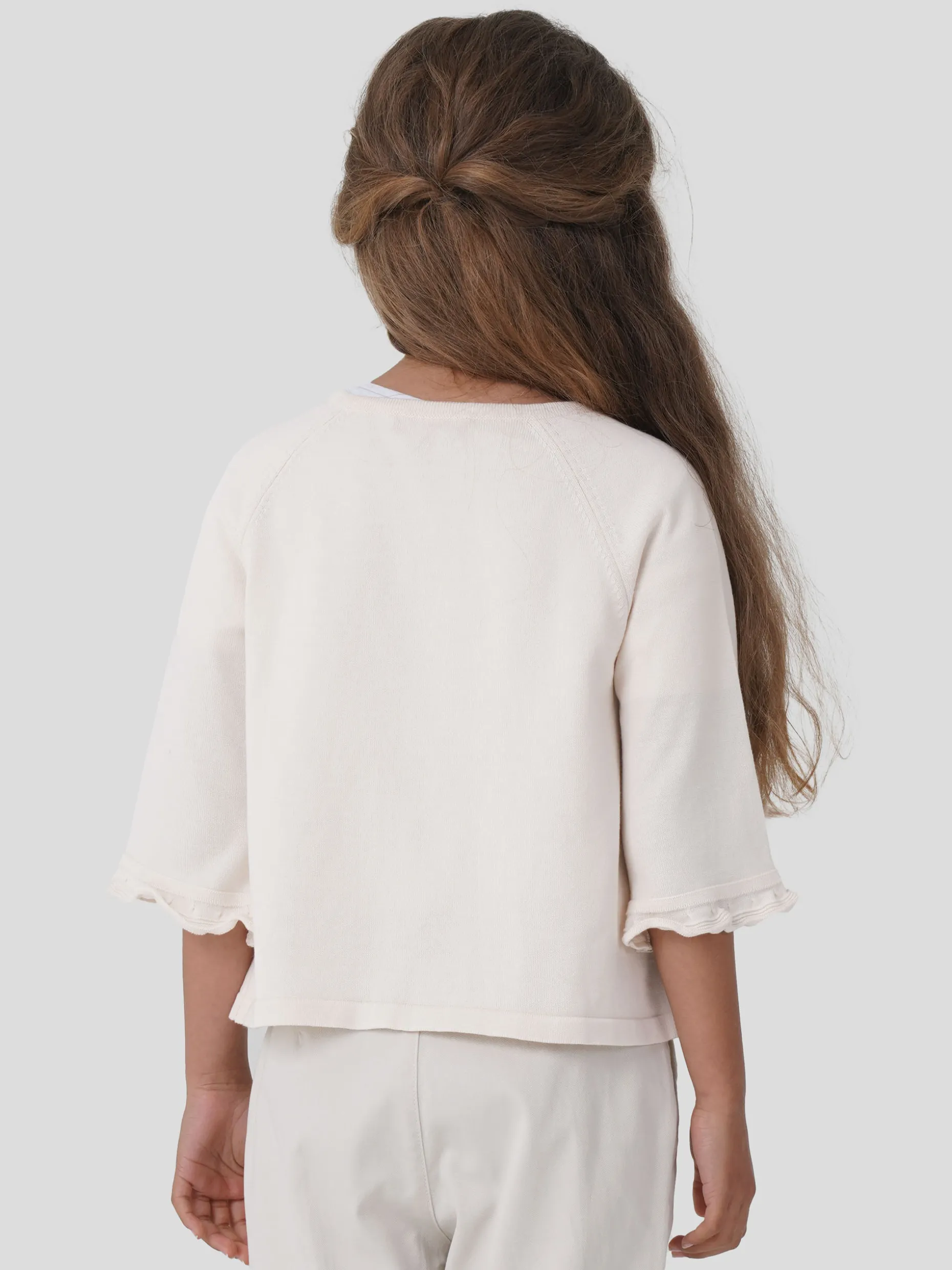 Bolero super feminino em algodão macio com ajours. Mangas 3/4 com pequeno folho. Aperta com um botão em forma de pérola. Pequeno coração dourado com monograma “LP” na base.