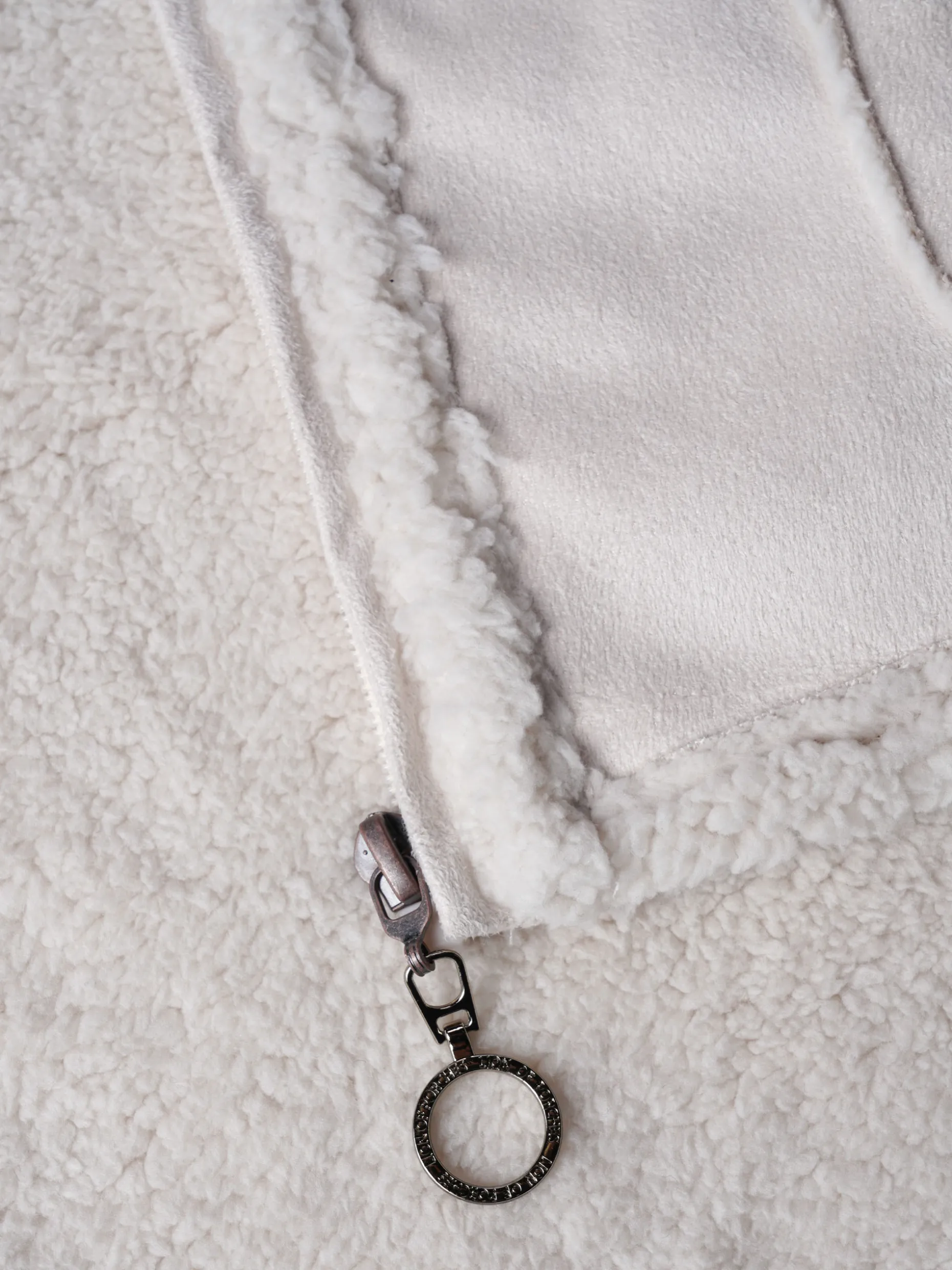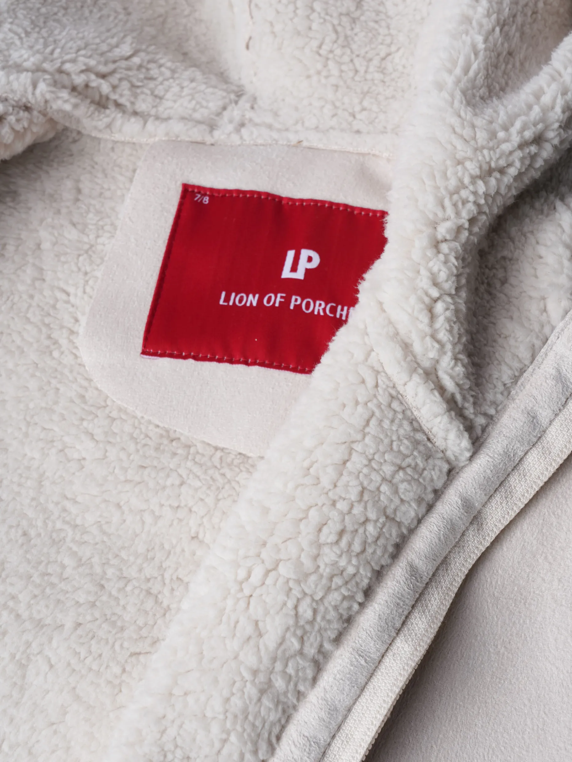 Casaco oversize com capuz confecionado em pele sintética com forro em sherpa. Manga raglan. Aperta com fecho na frente. Dois bolsos frontais.