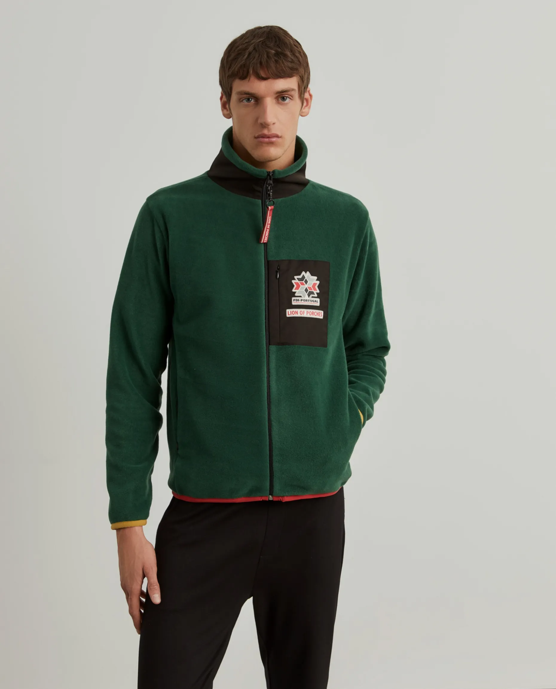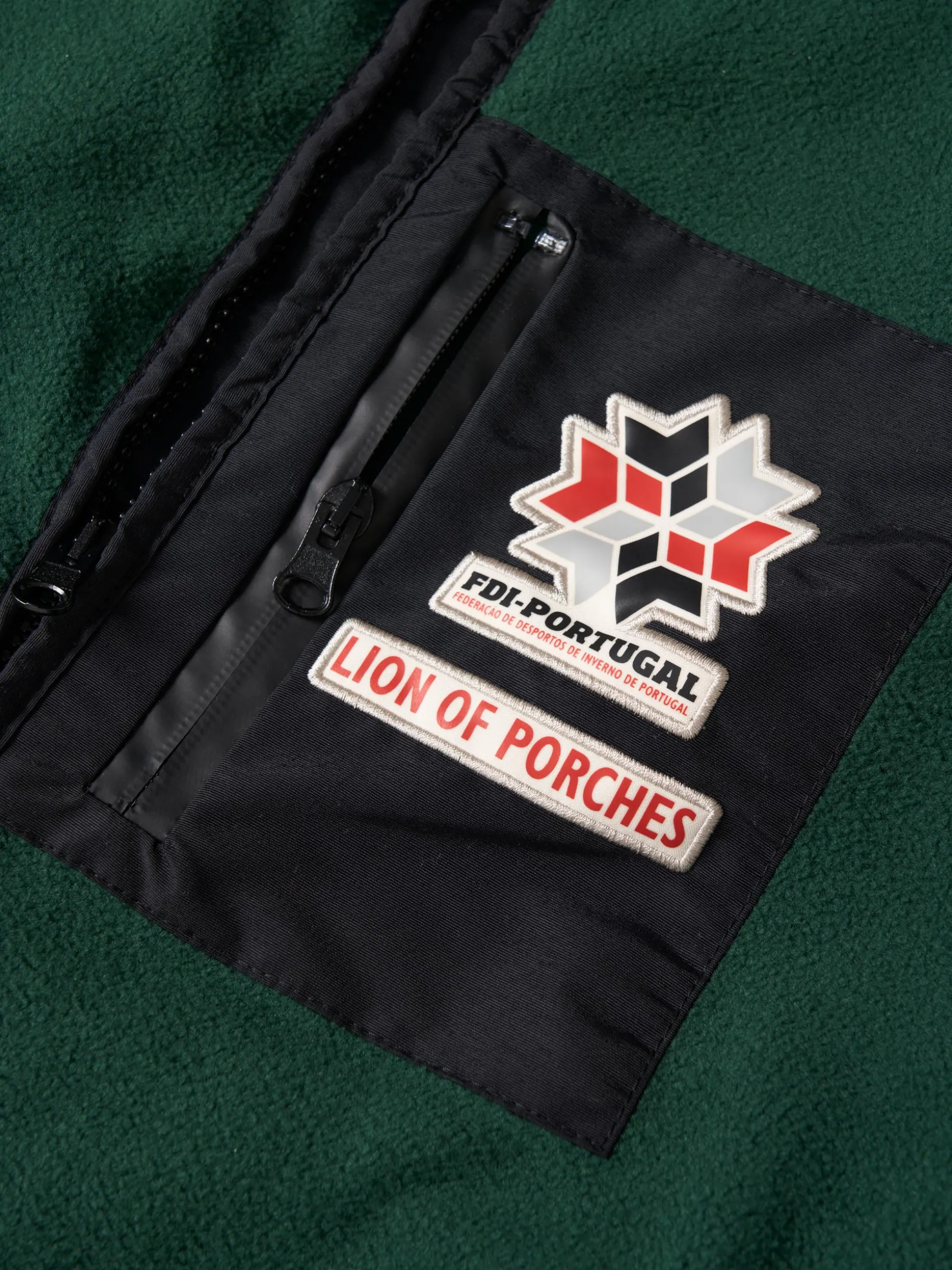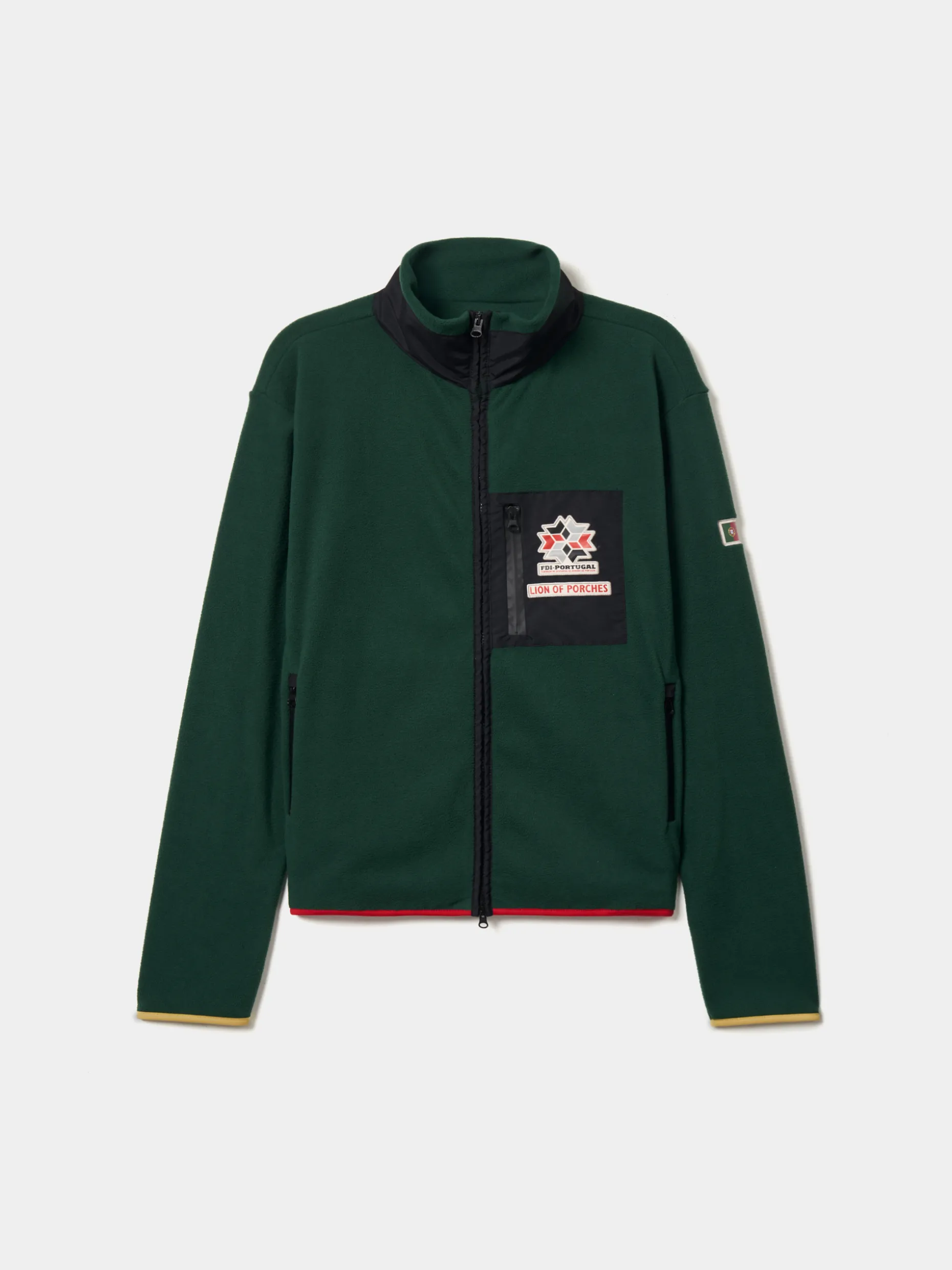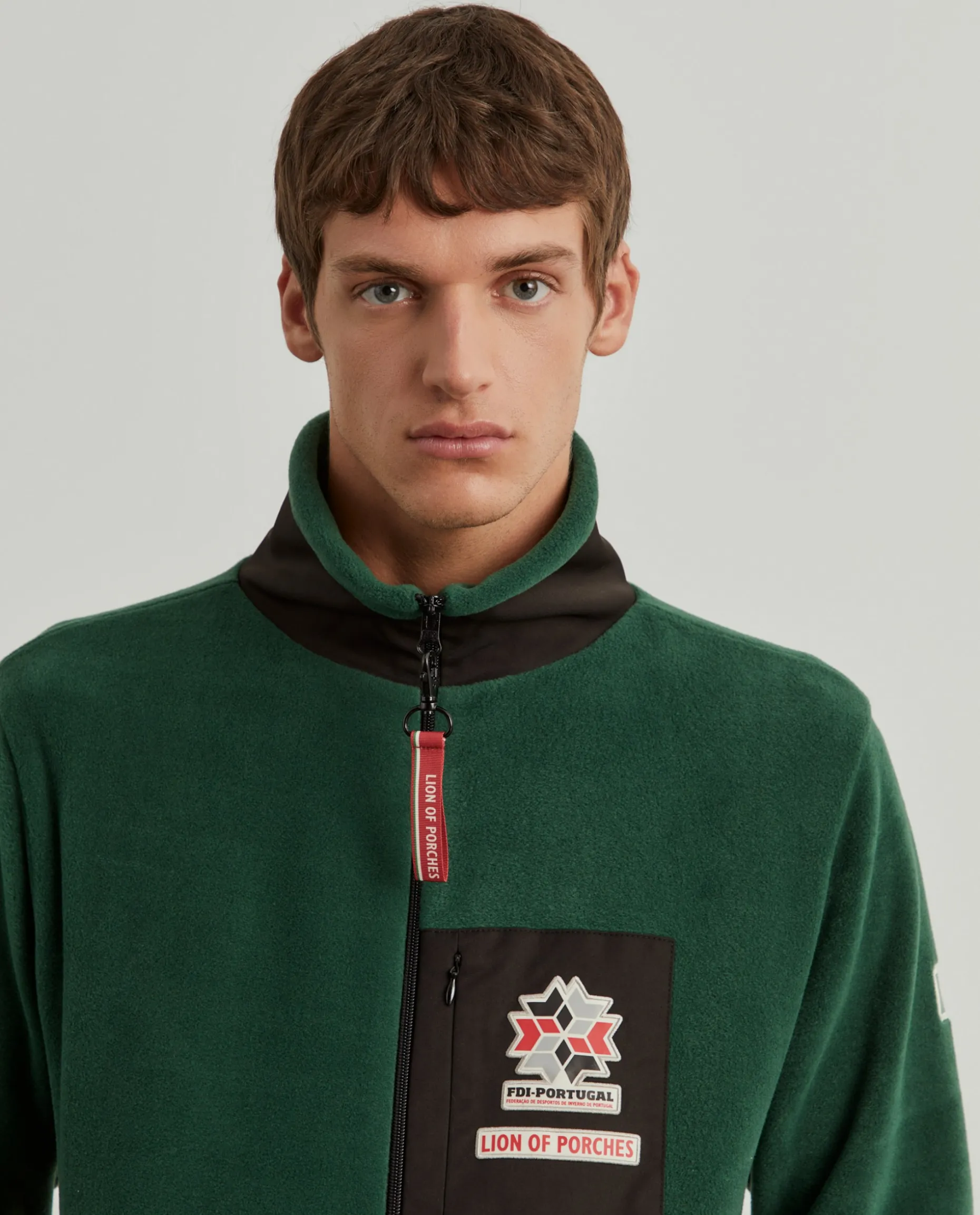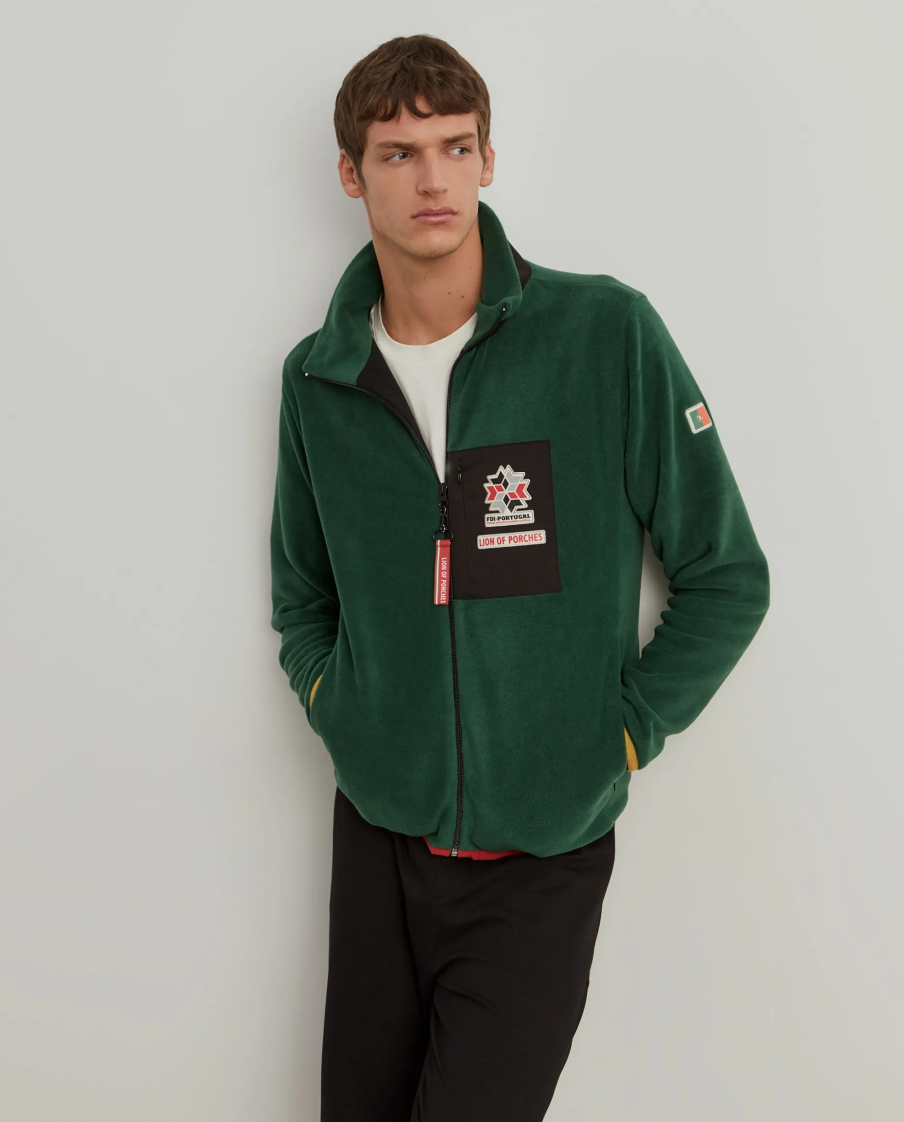 Casaco de manga comprida confecionado em tecido polar macio que proporciona excelente isolamento térmico e o torna ideal para atividades ao ar livre em climas frios ou para dias descontraídos na cidade. O design inclui um fecho de correr completo e, no peito, destaca-se um bolso com o emblema da Lion of Porches e da Federação de Desportos de Inverno de Portugal. Na manga esquerda, a bandeira nacional. Pormenor de base e punhos em contaste de cor. Bolsos laterais com fecho zíper.