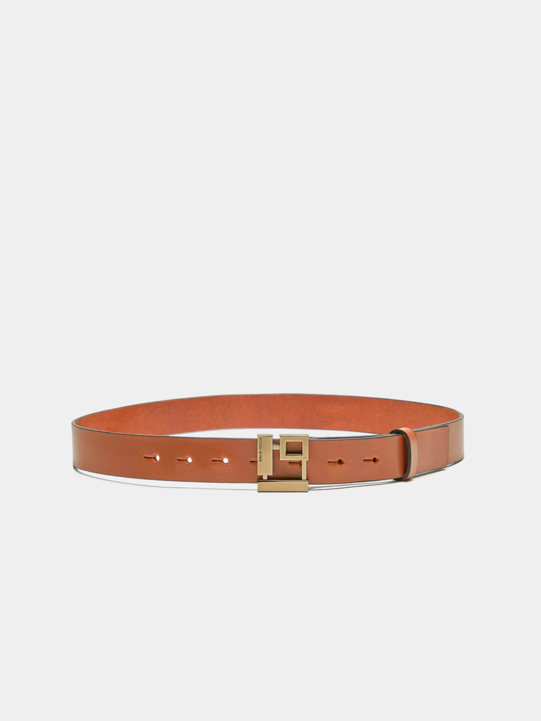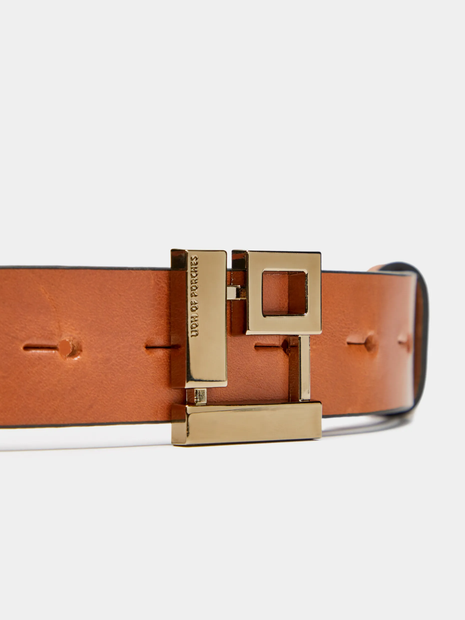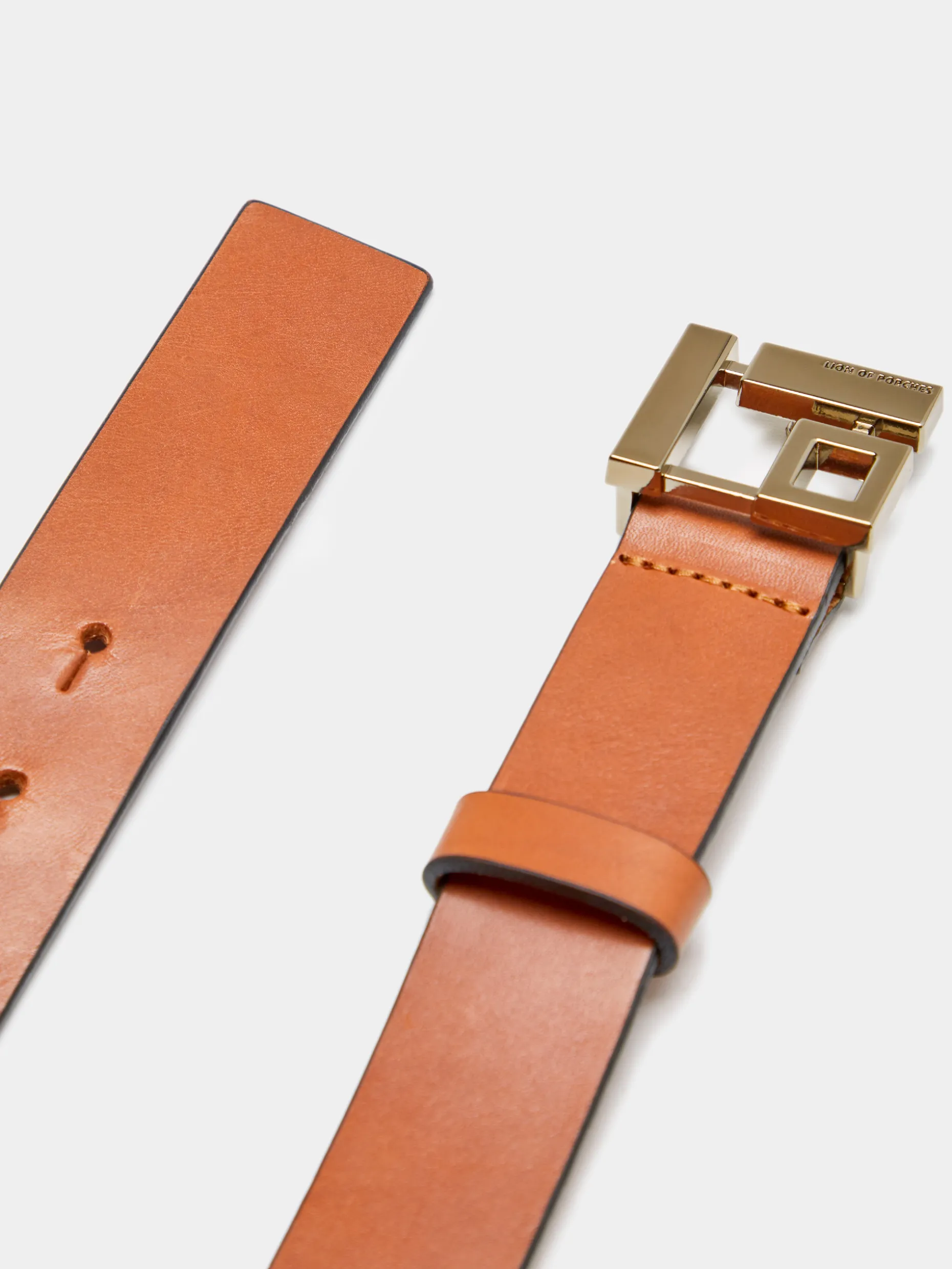 Cinto confecionado em pele com fivela monograma Lion of Porches em formato quadrado.