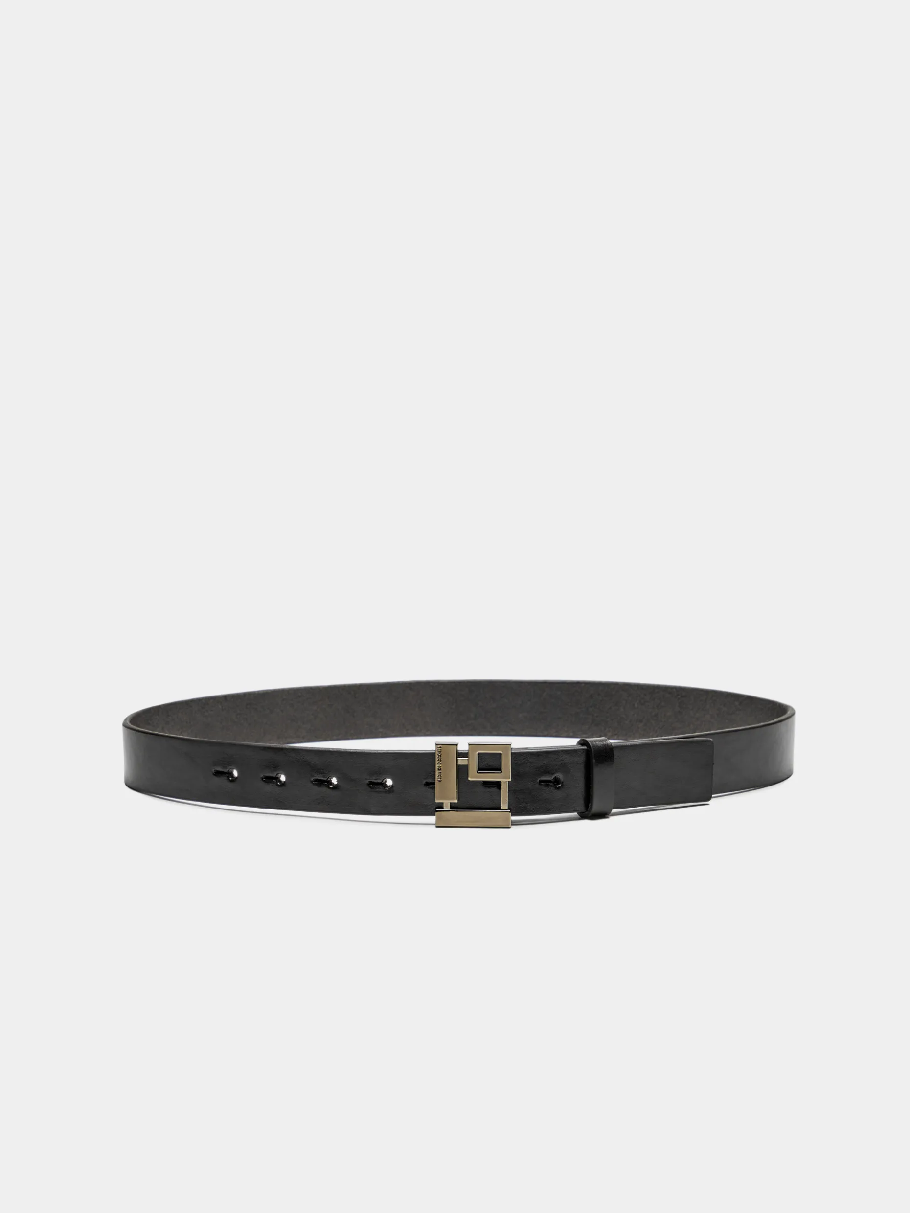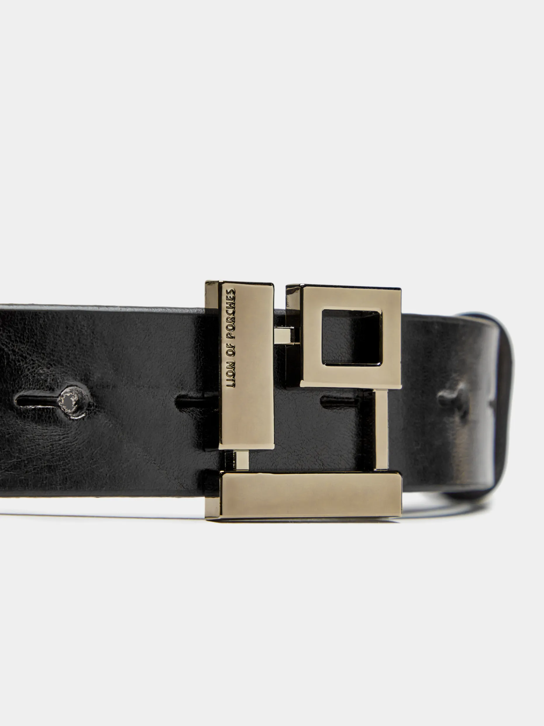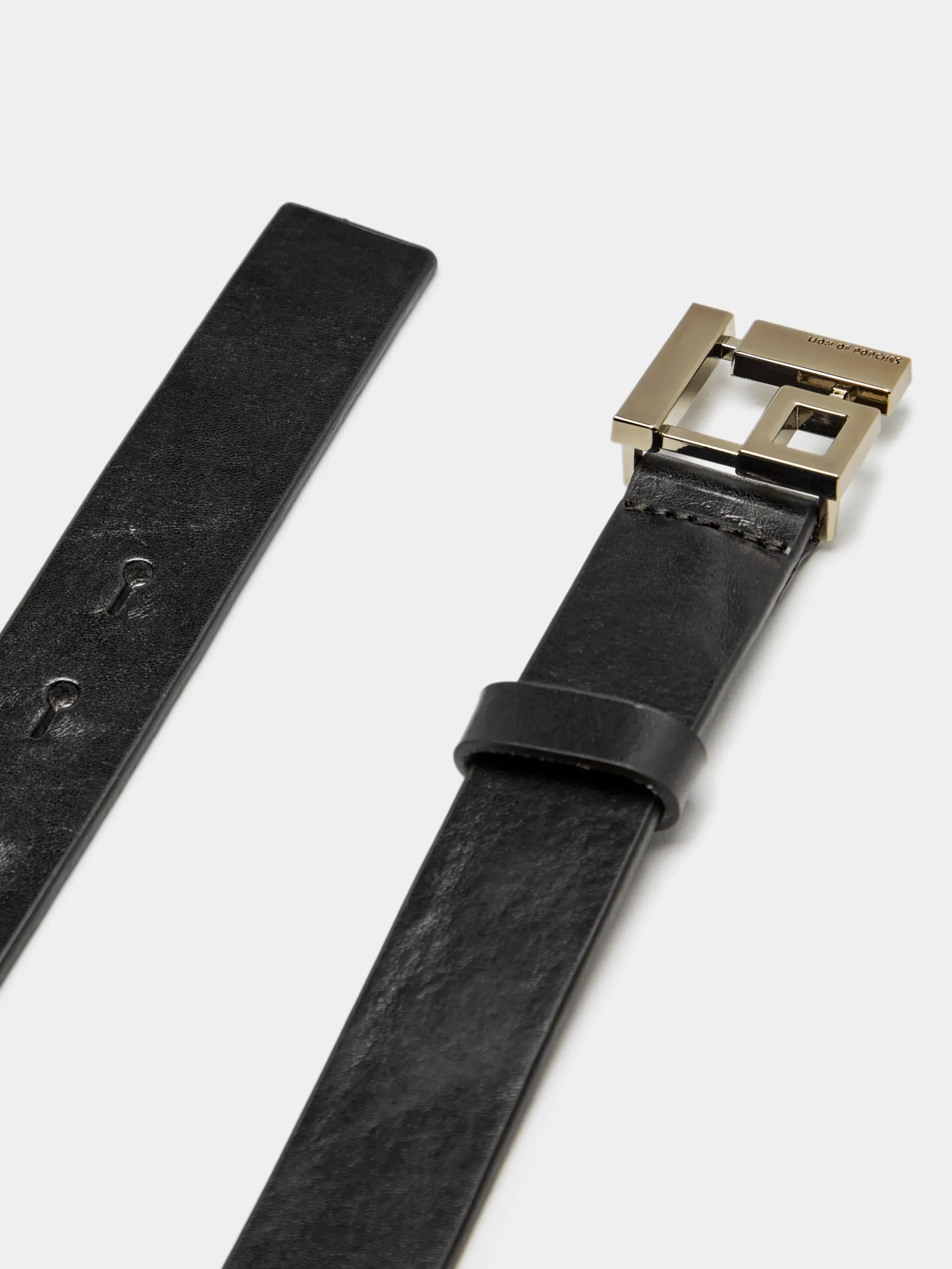 Cinto confecionado em pele com fivela monograma Lion of Porches em formato quadrado.