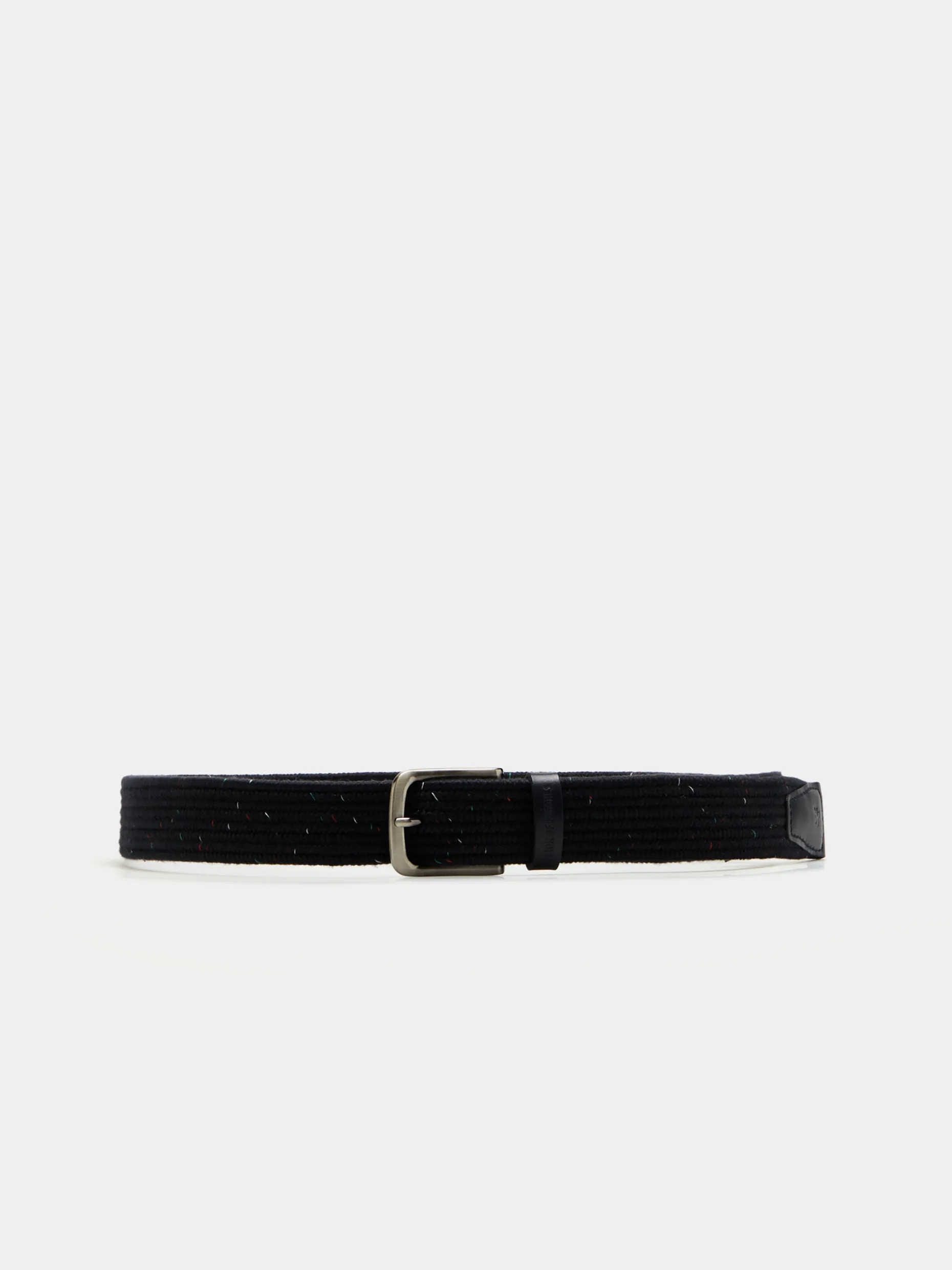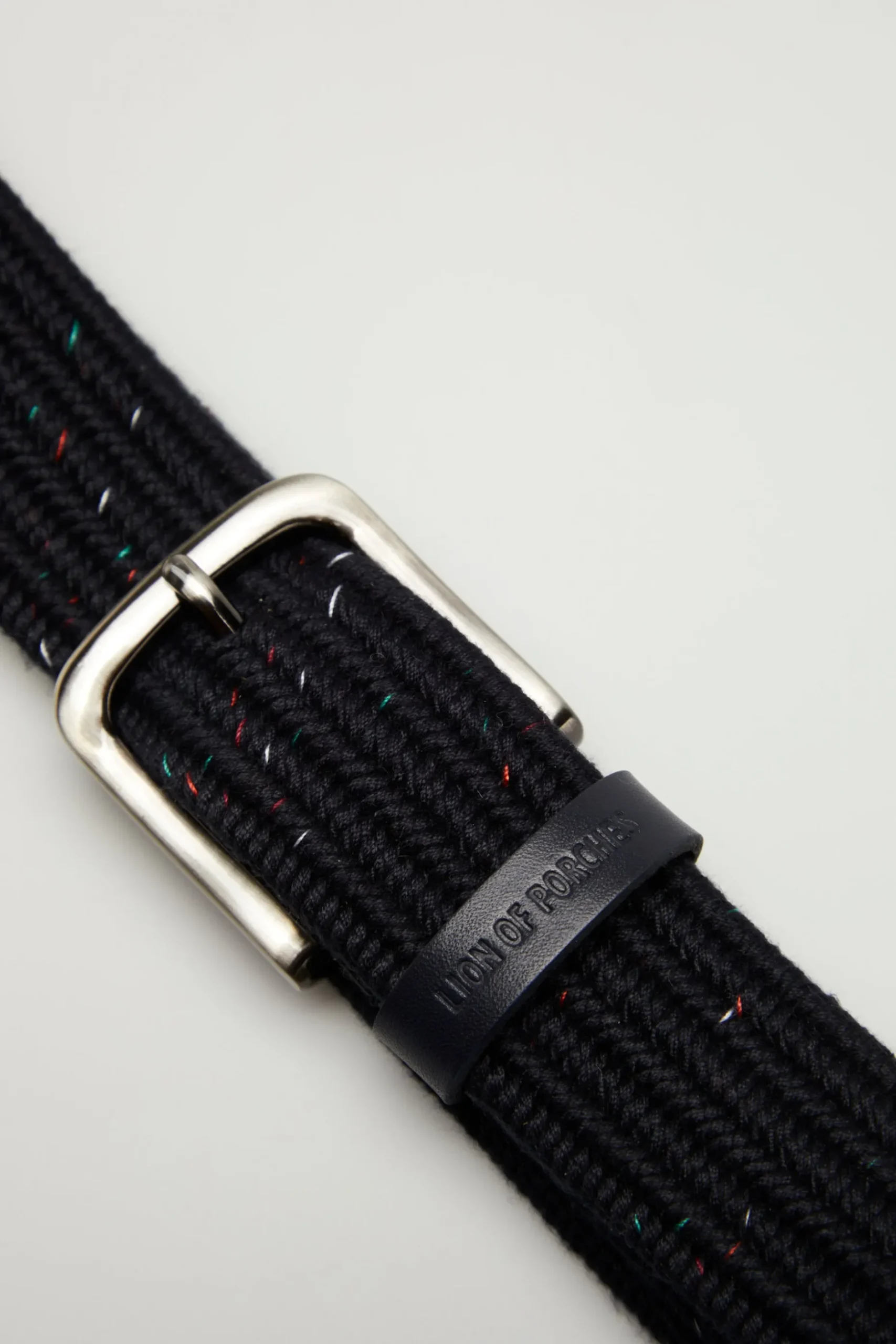 Cinto elástico entrançado. Fivela em metal e pormenor de branding Lion of Porches gravado na presilha.