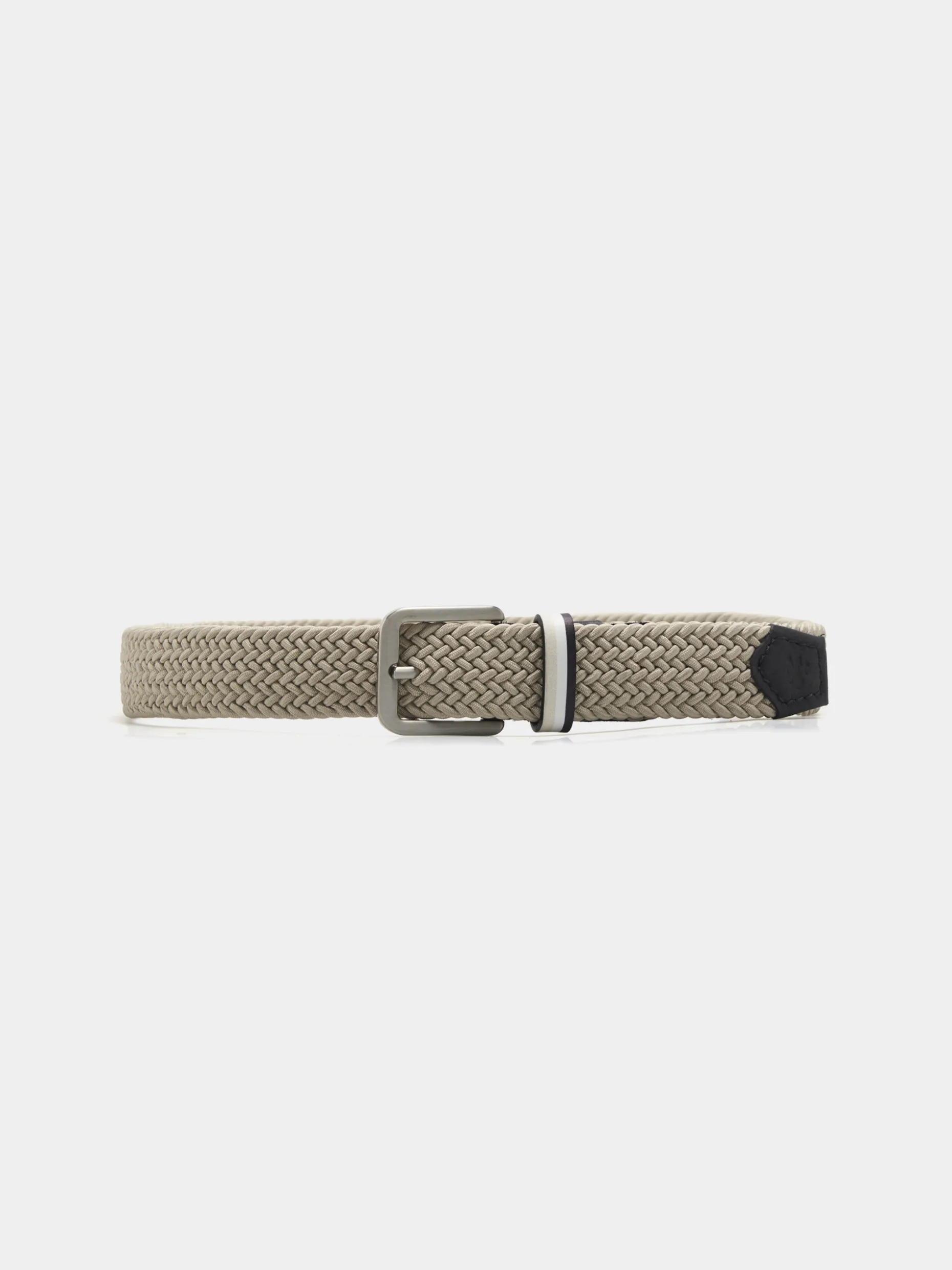 Cinto entrançado com cantos em pele em contraste. De fivela quadrada e pormenor diferenciador de presilha com fita tricolor. Na ponta, leão da marca gravado.