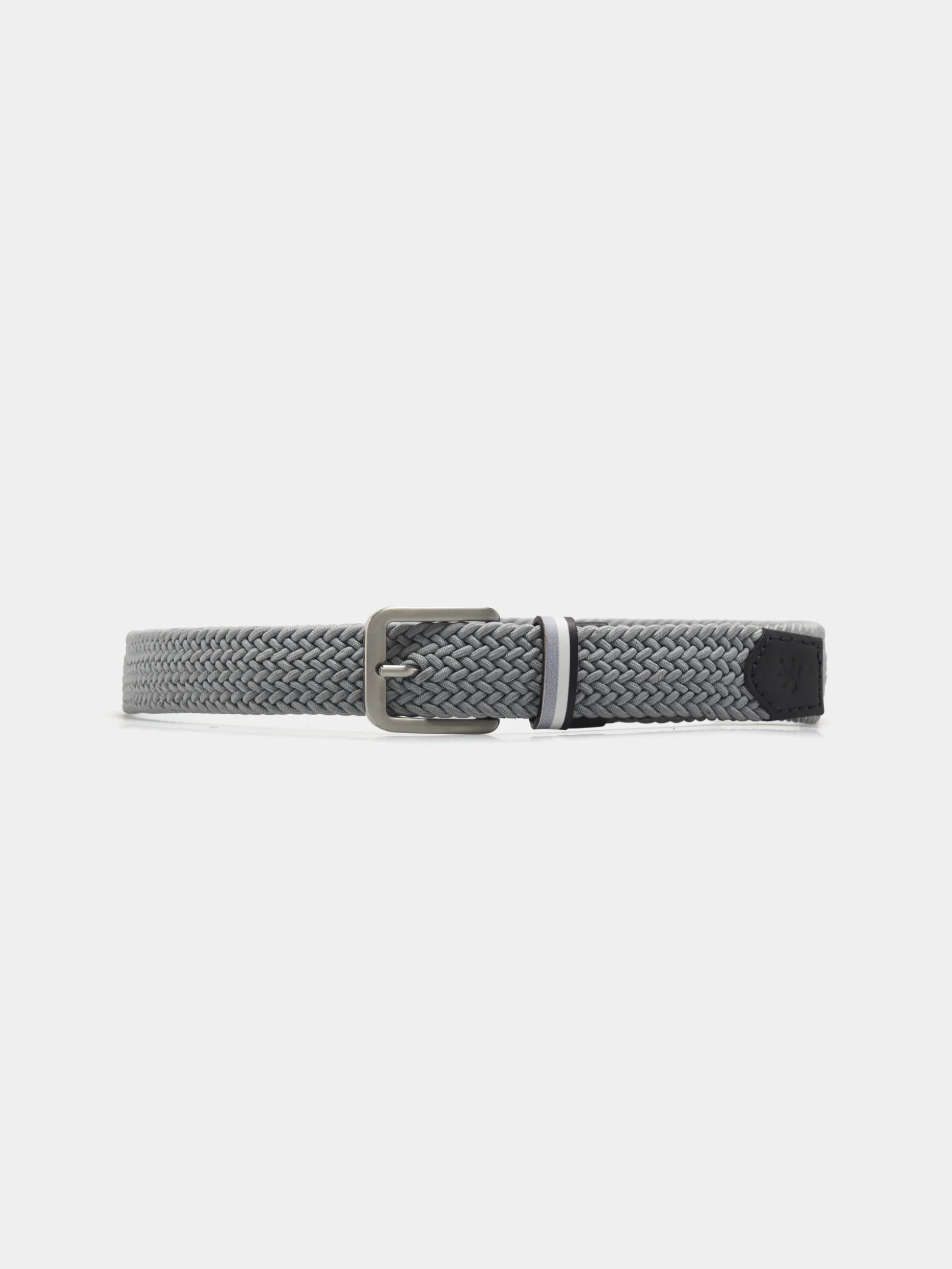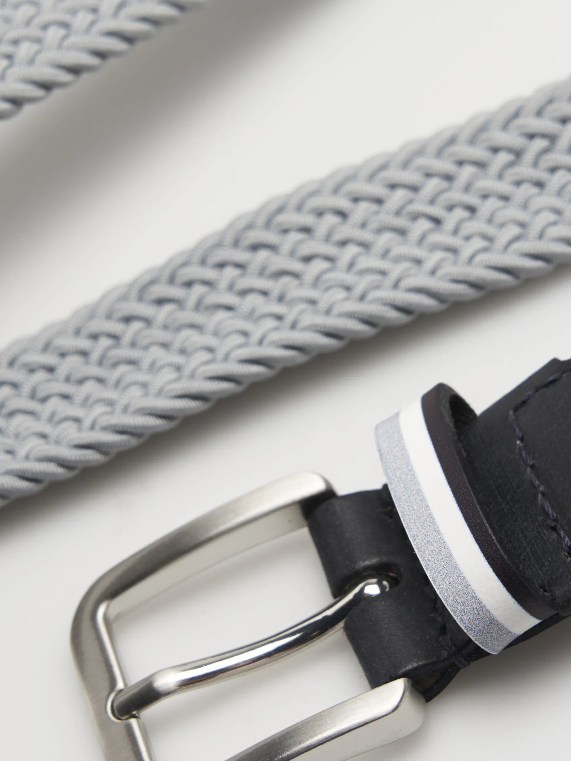 Cinto entrançado com cantos em pele em contraste. De fivela quadrada e pormenor diferenciador de presilha com fita tricolor. Na ponta, leão da marca gravado.