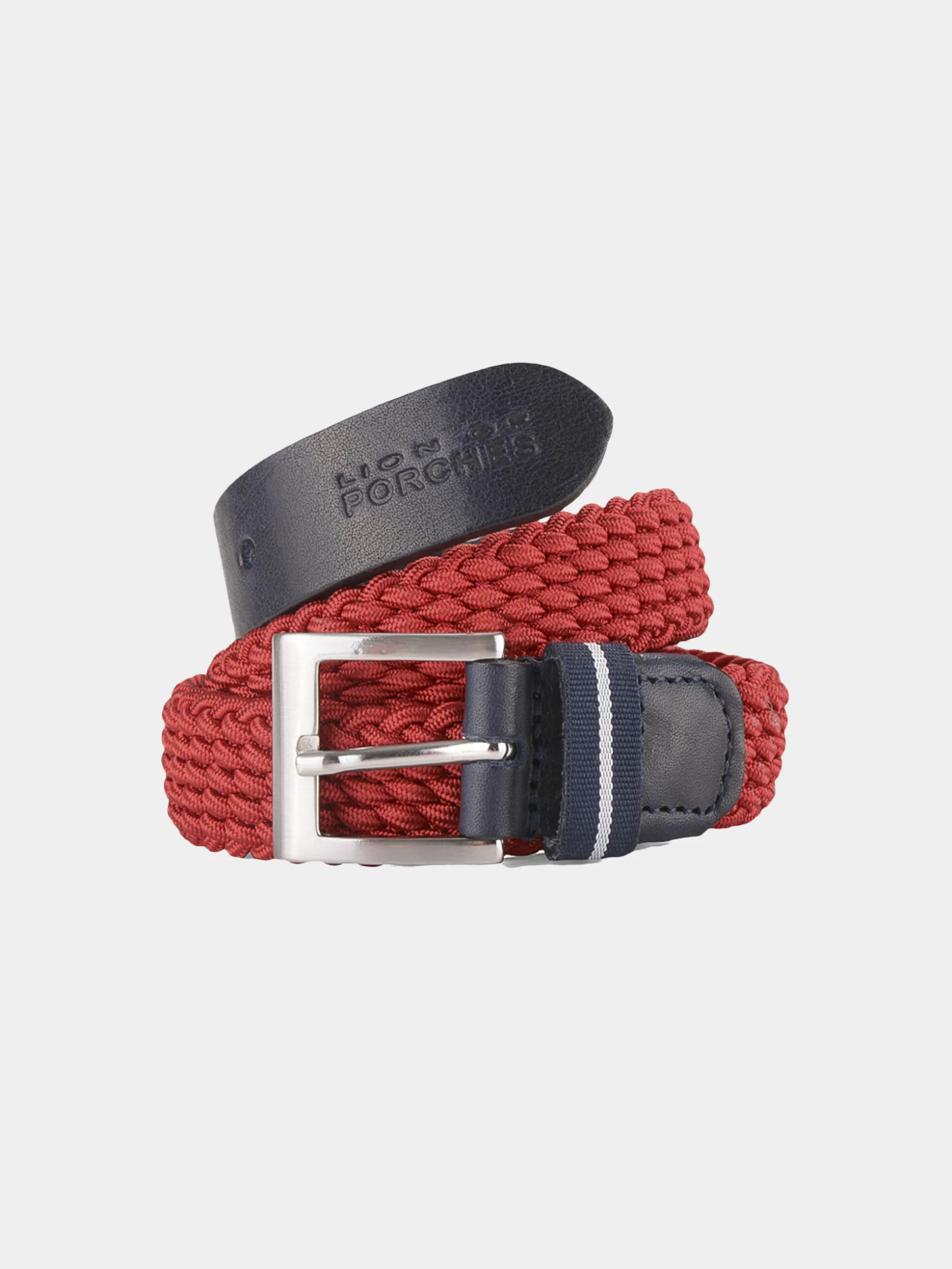 Cinto entrançado com detalhes em pele e gravação Lion of Porches na presilha. Fivela metálica quadrada.