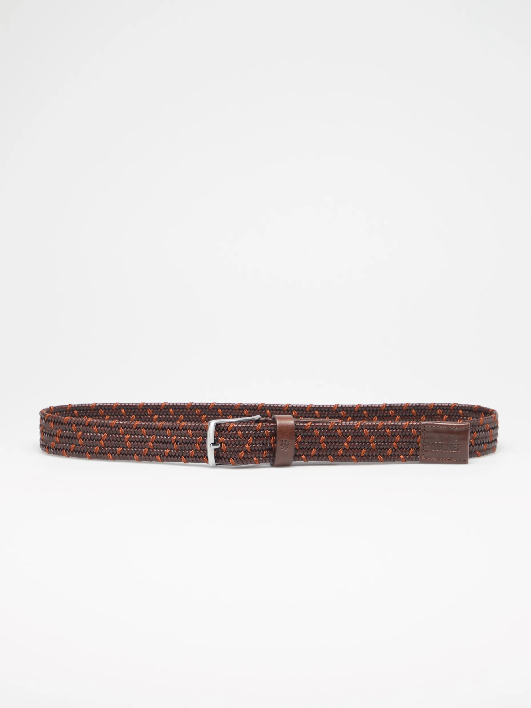 Cinto com entrançado elástico bicolor e fivela metálica. Presilha em pele com gravação a cunho de leão pixelizado da marca. Extremidade em pele com gravação Lion Of Porches.