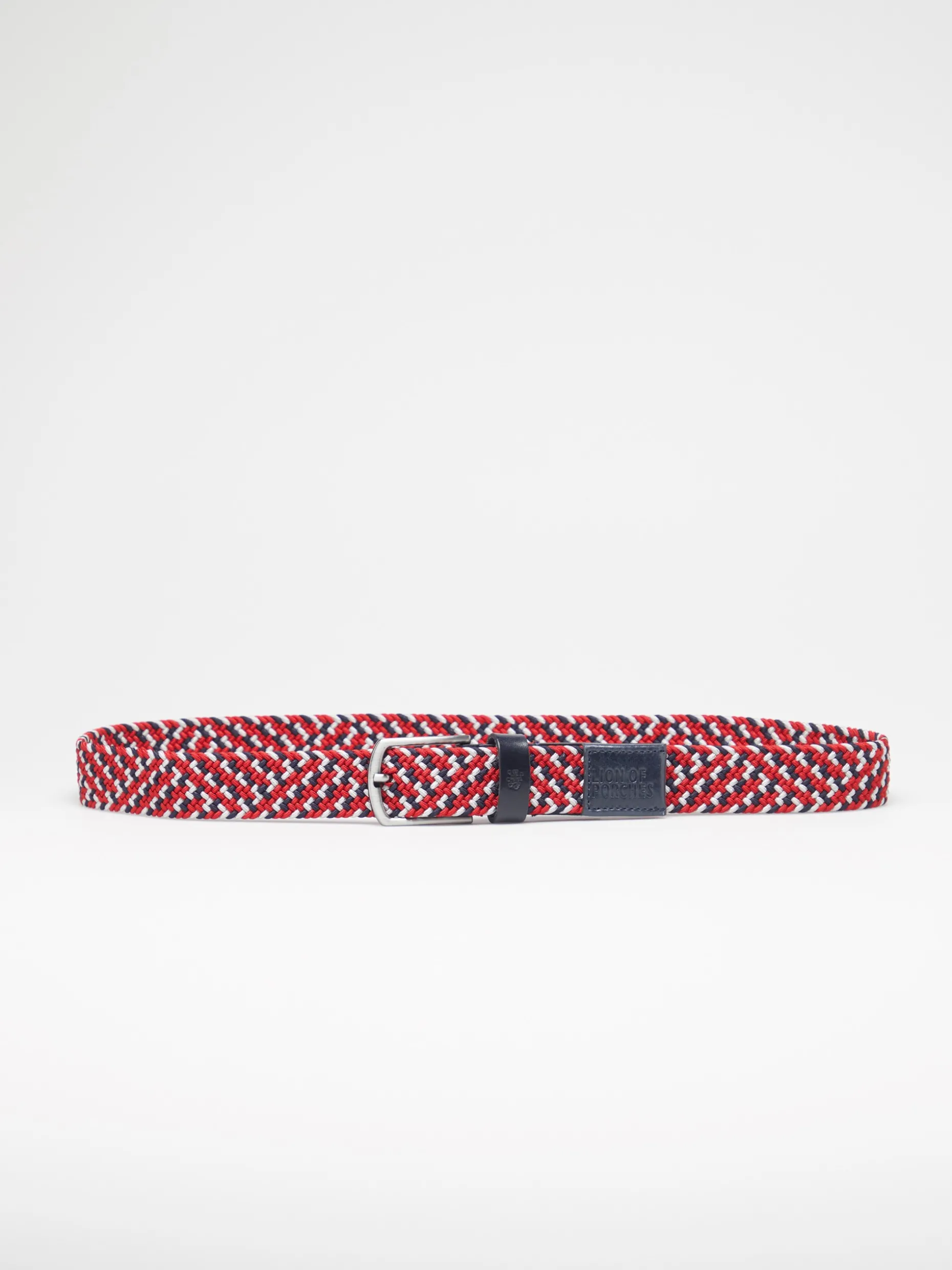 Cinto com entrançado elástico tricolor e fivela metálica. Presilha em pele com gravação a cunho de leão pixelizado da marca. Extremidade em pele com gravação Lion Of Porches.