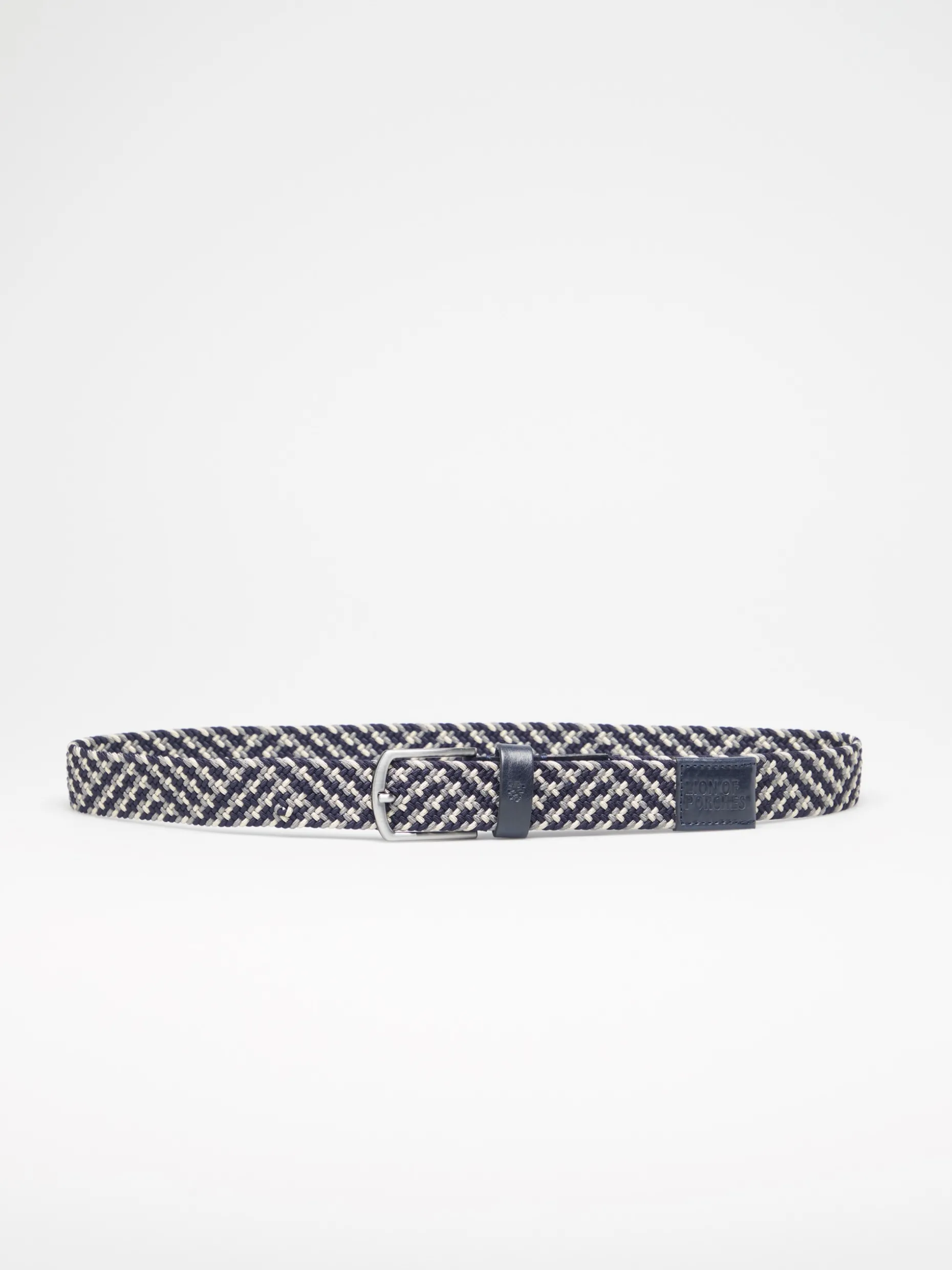Cinto com entrançado elástico tricolor e fivela metálica. Presilha em pele com gravação a cunho de leão pixelizado da marca. Extremidade em pele com gravação Lion Of Porches.