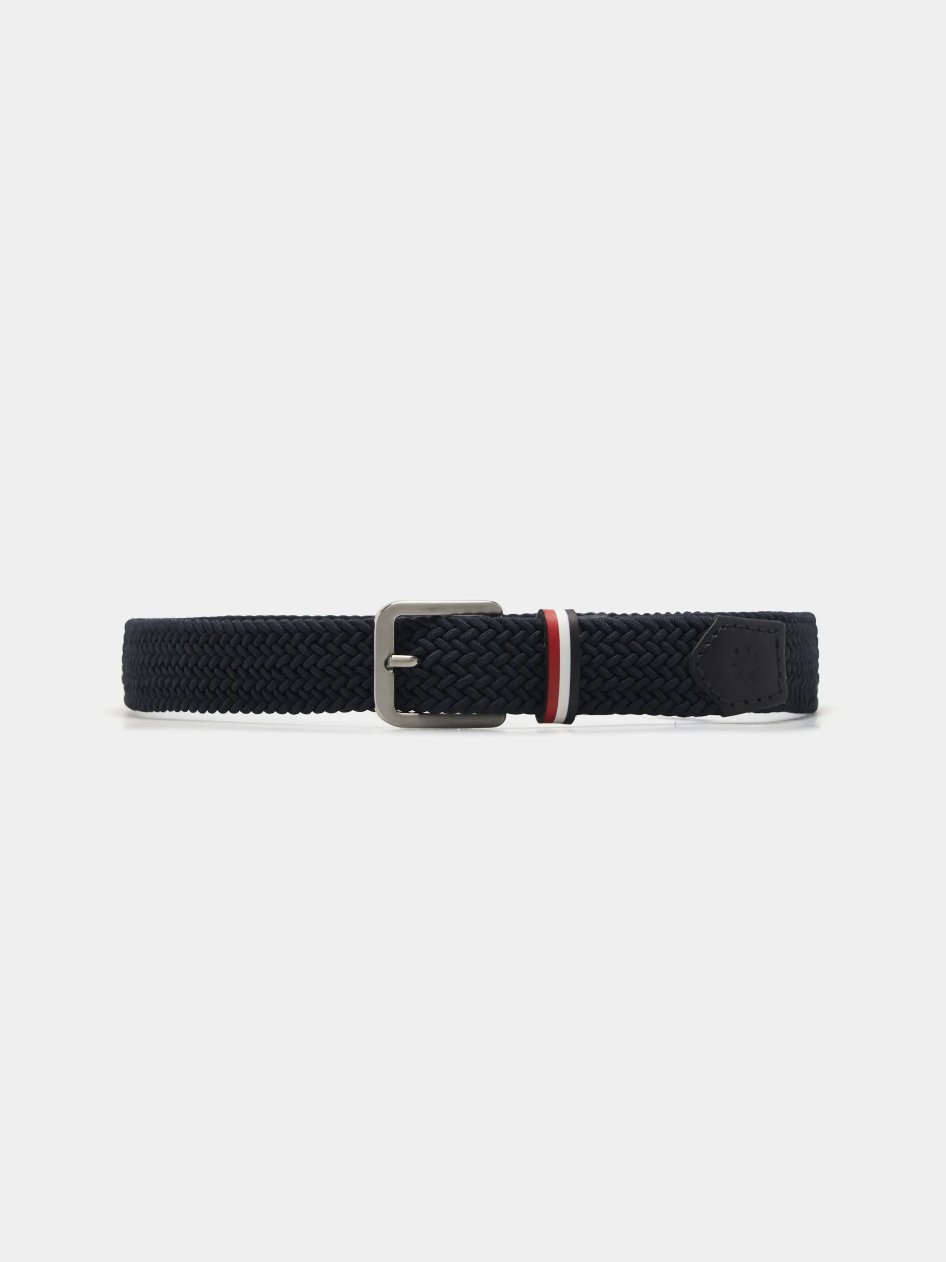 Cinto entrançado com cantos em pele em contraste. De fivela quadrada e pormenor diferenciador de presilha com fita tricolor. Na ponta, leão da marca gravado.