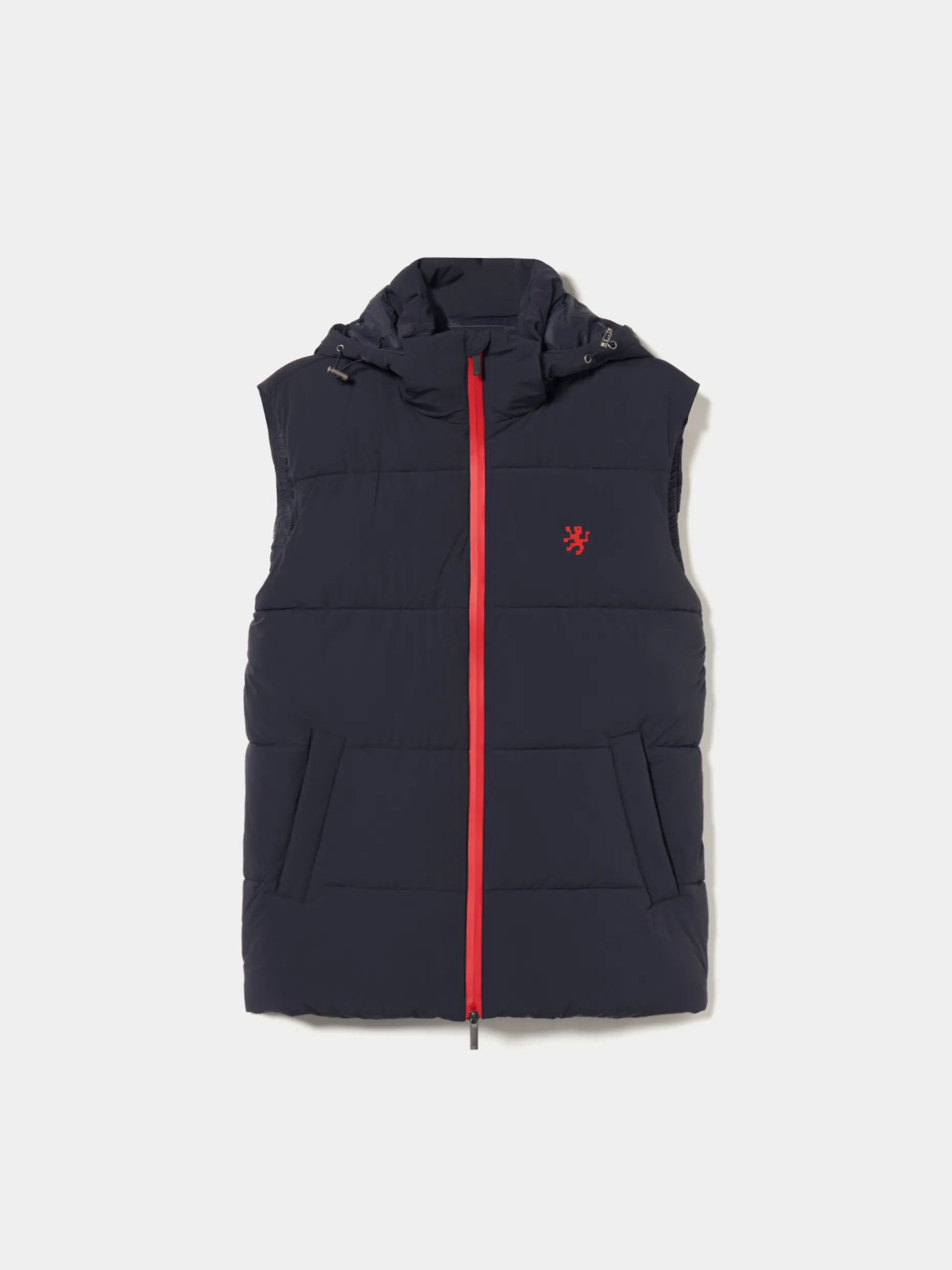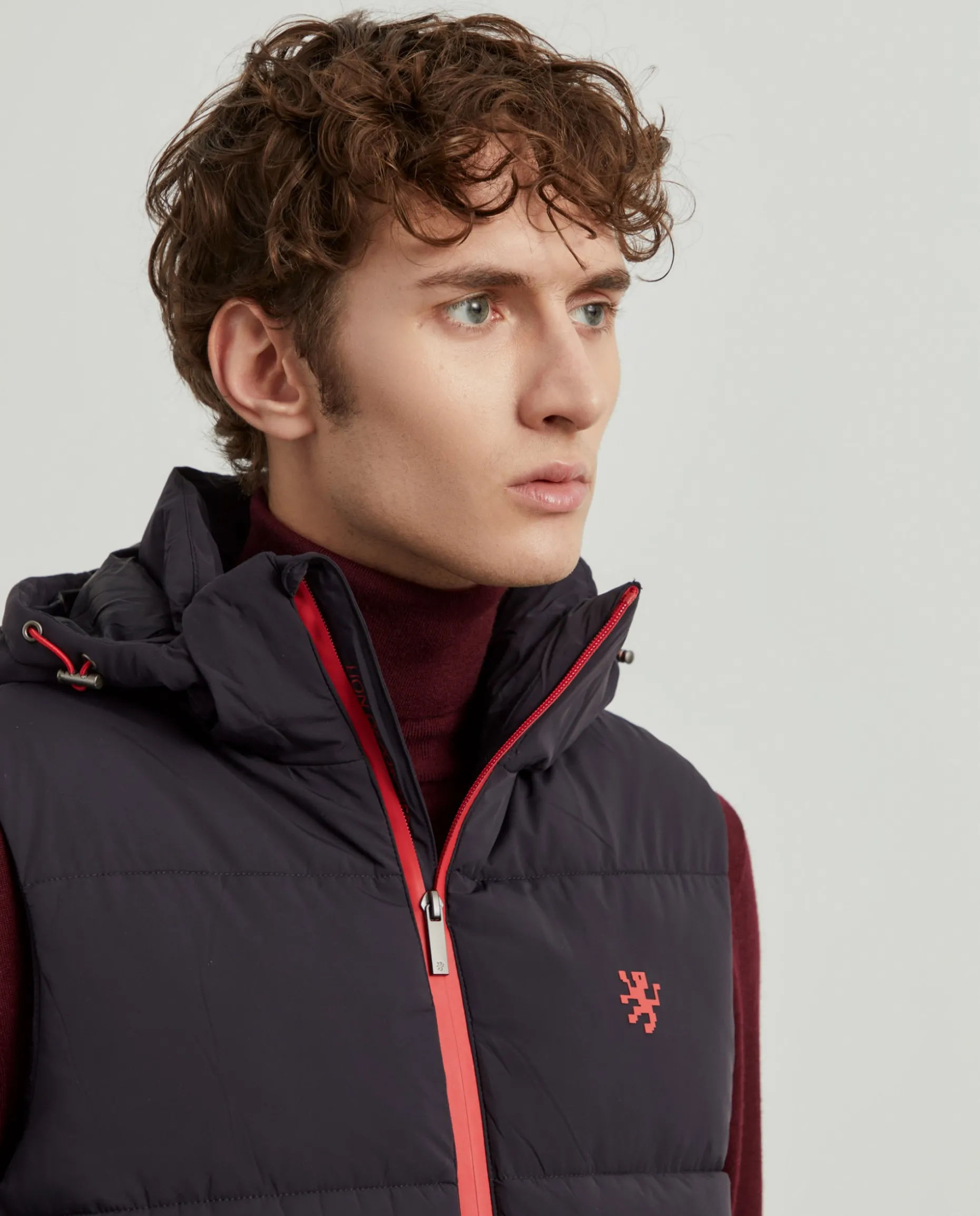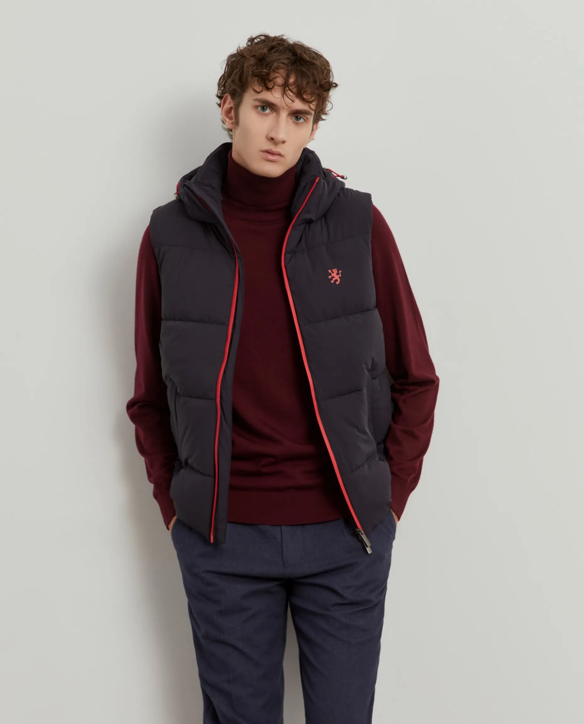 Colete acolchoado com capuz regulável, perfeito para se proteger do frio e da chuva nos dias mais invernosos. Aperta com fecho duplo impermeável em contraste de cor. Finaliza com leão estampado no peito. Bolsos na frente com fecho.