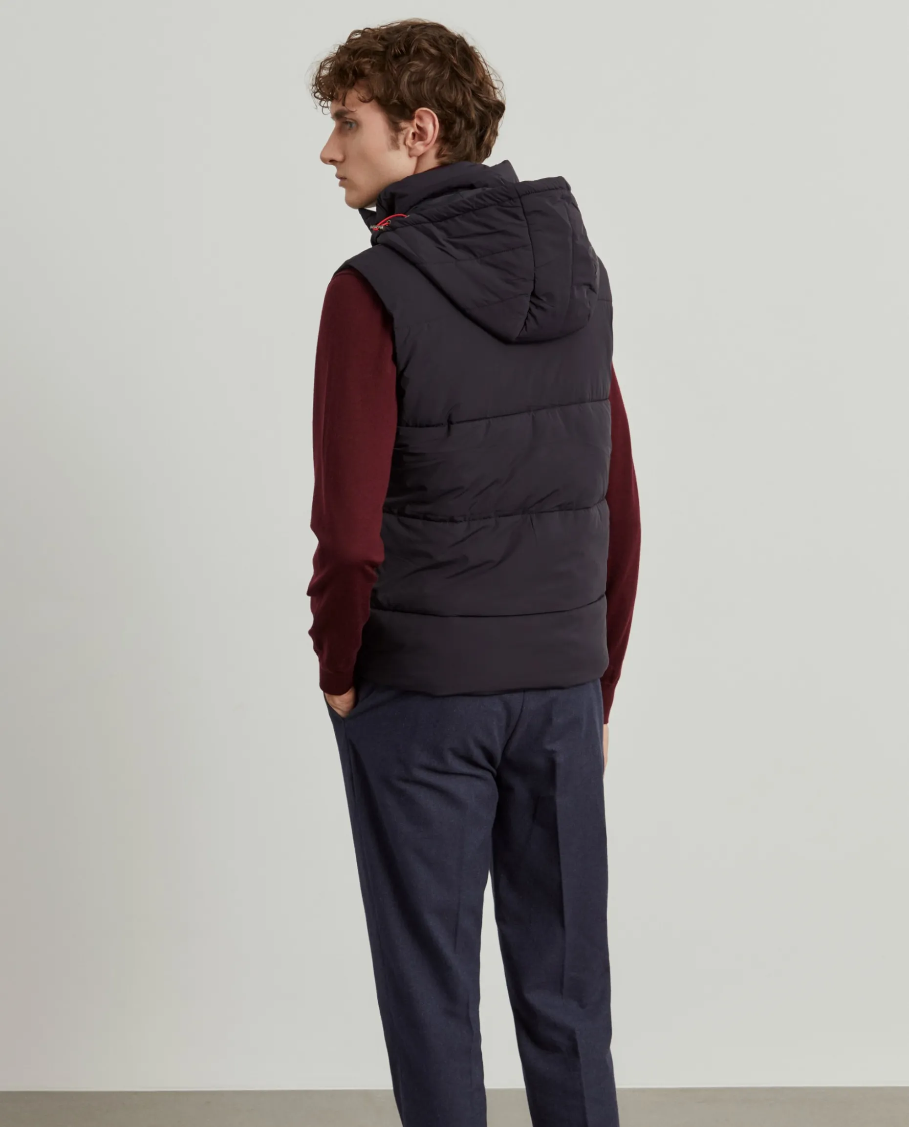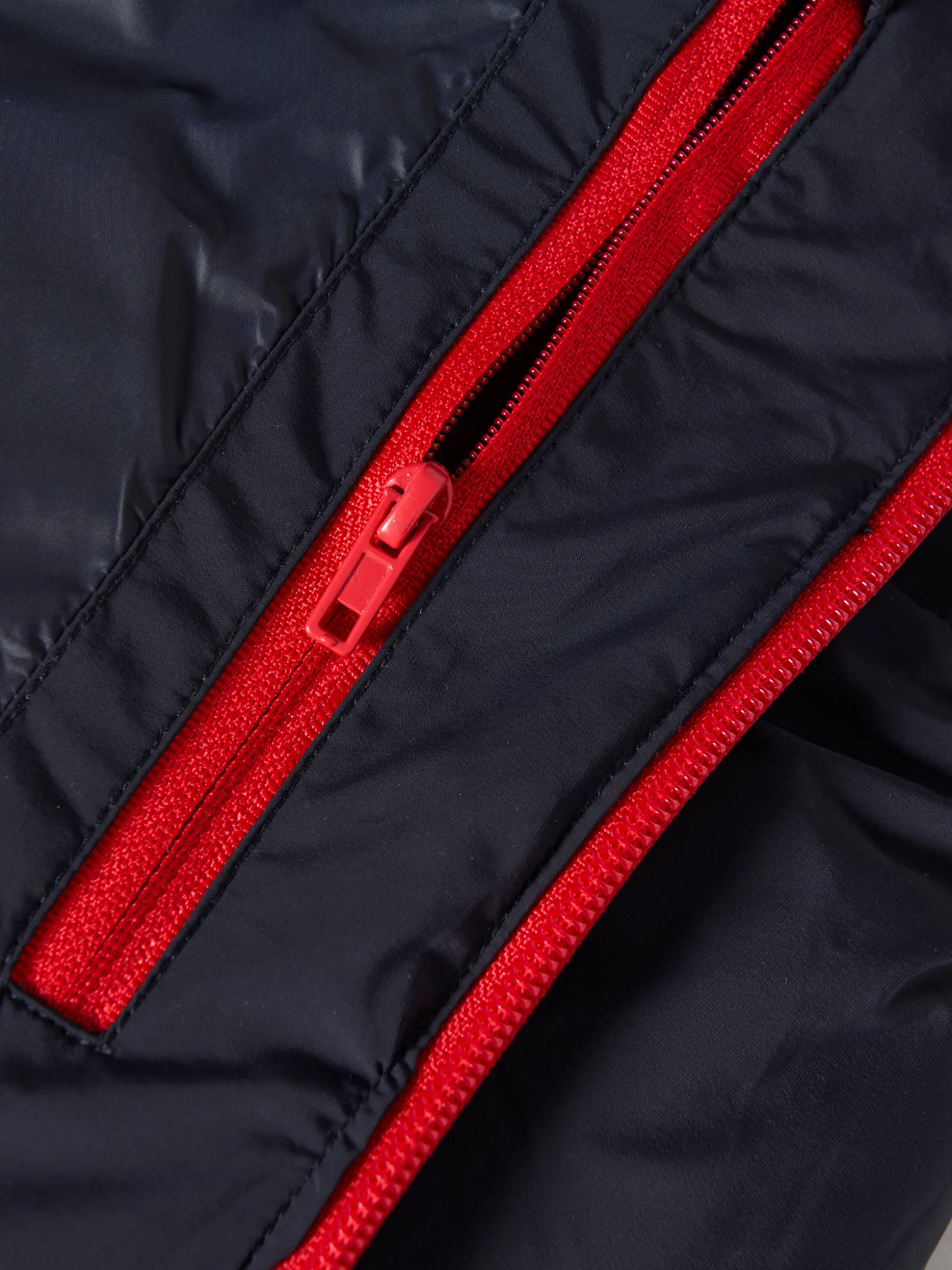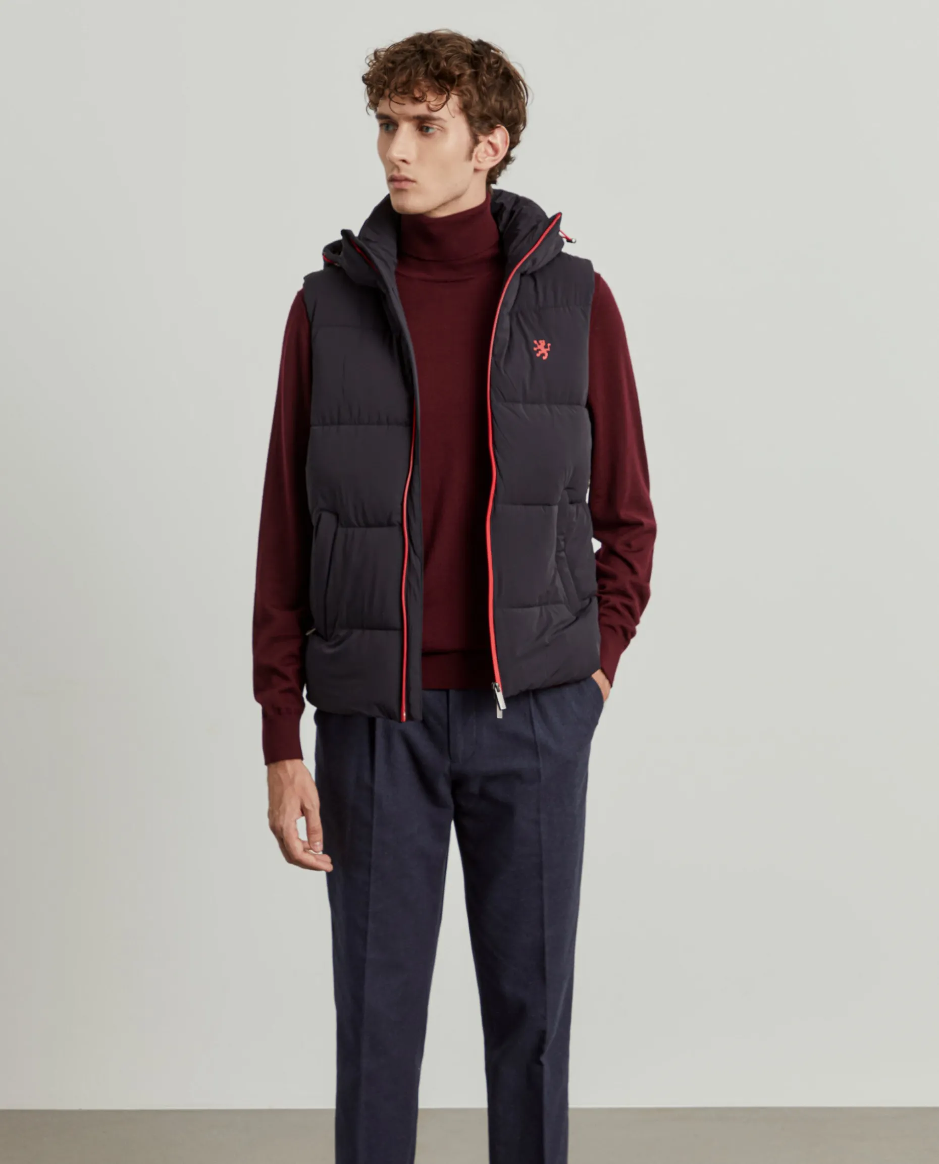 Colete acolchoado com capuz regulável, perfeito para se proteger do frio e da chuva nos dias mais invernosos. Aperta com fecho duplo impermeável em contraste de cor. Finaliza com leão estampado no peito. Bolsos na frente com fecho.