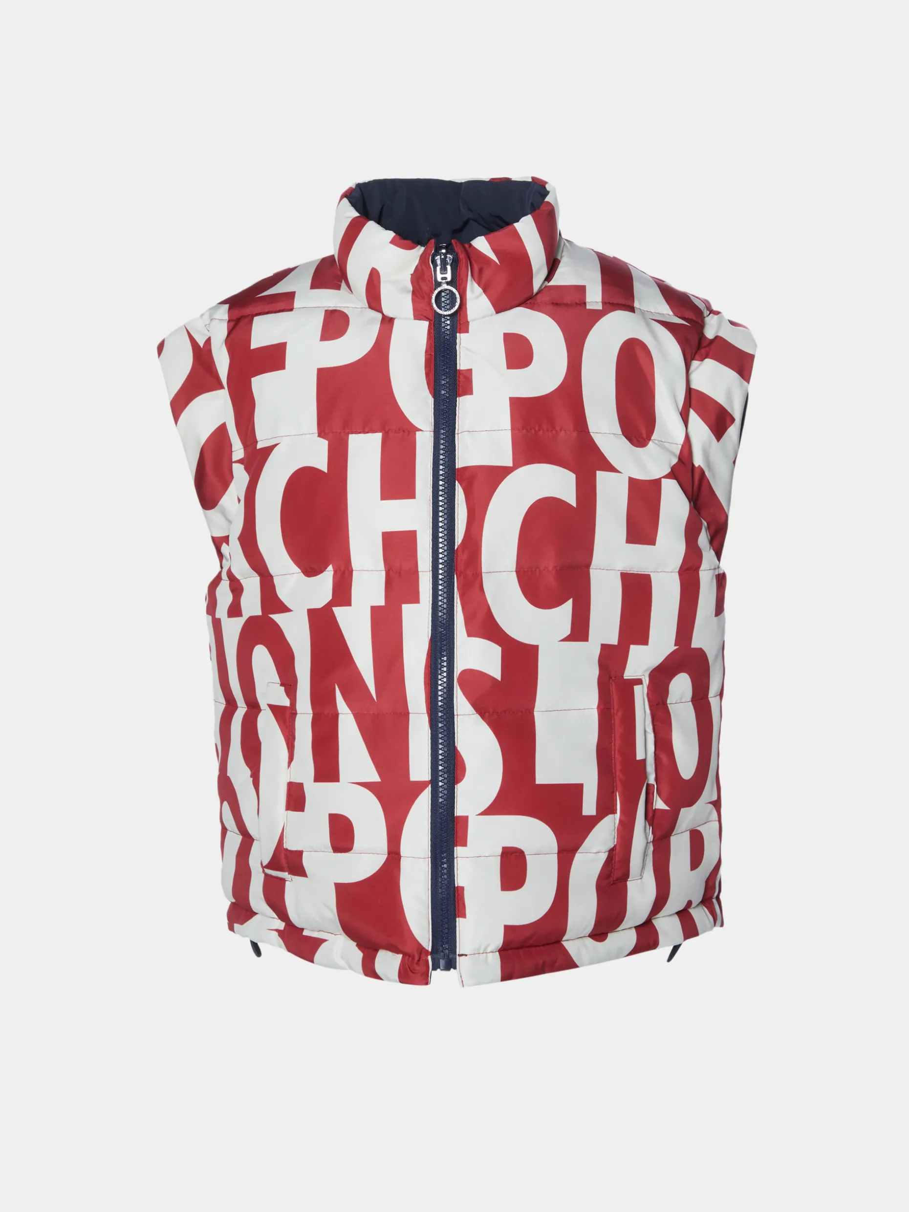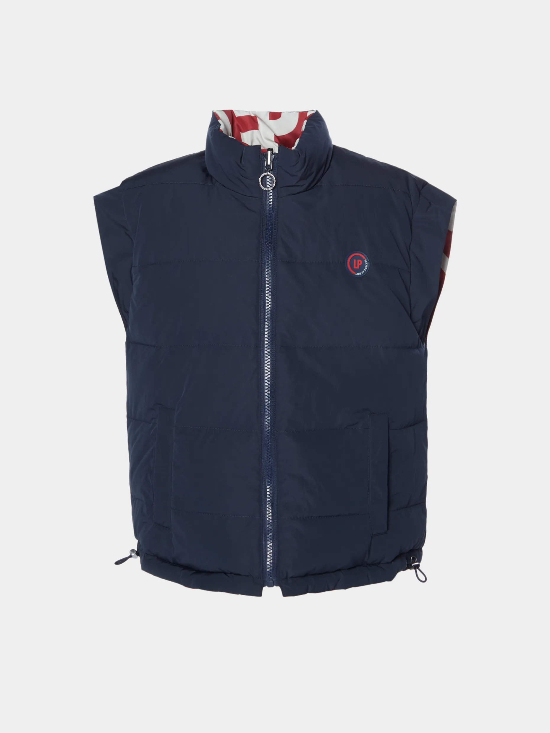 Um colete, dois looks. Este colete acolchado reversível conta com um lado numa cor lisa com a placa LP de borracha no peito e outro lado com o estampado Lion of Porches em contraste. Pode ser regulado na bainha com um elástico e aperta na frente com fecho.