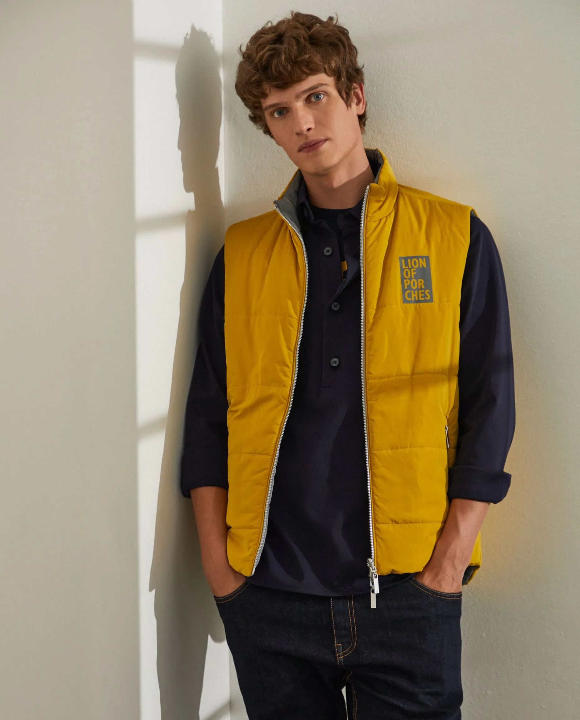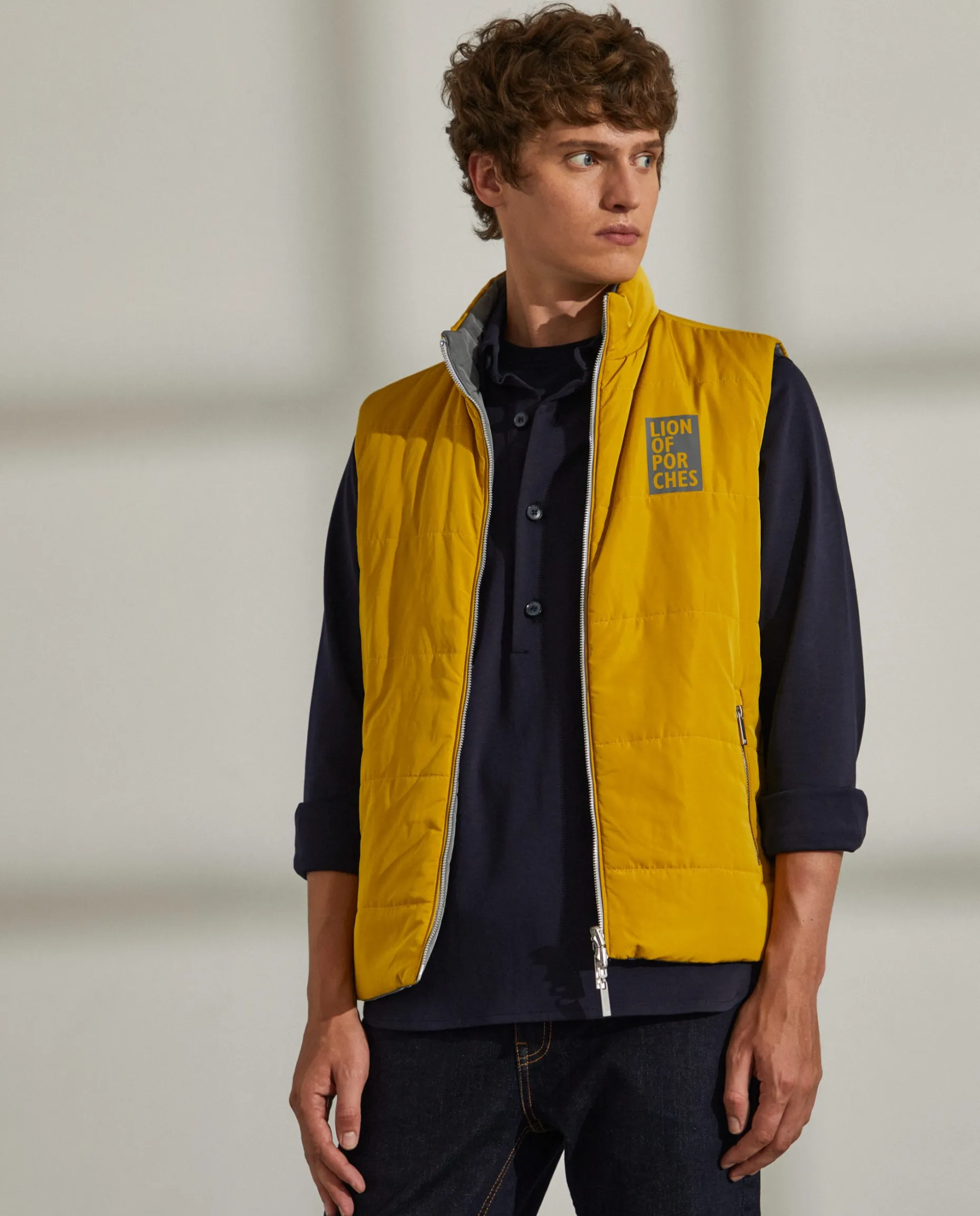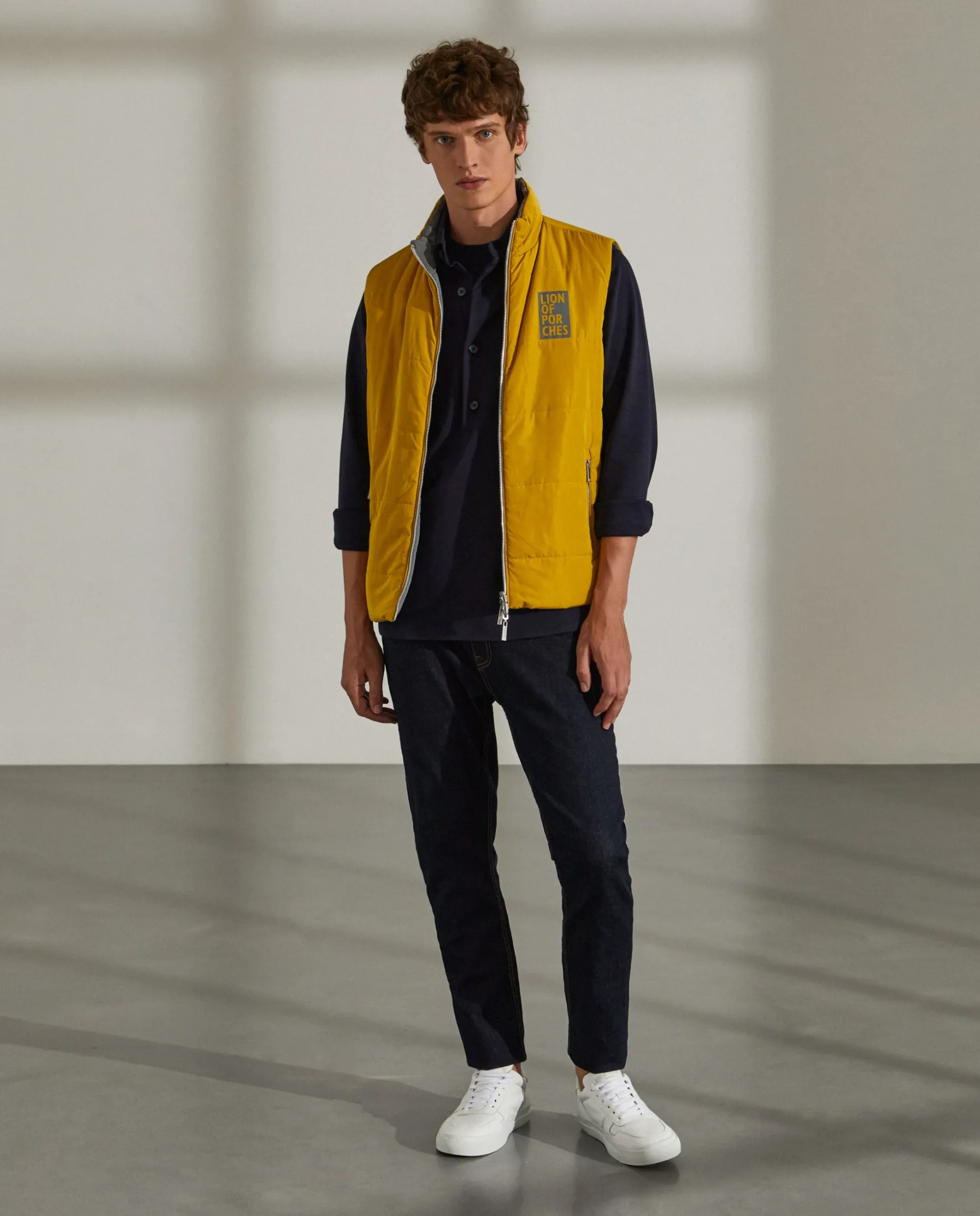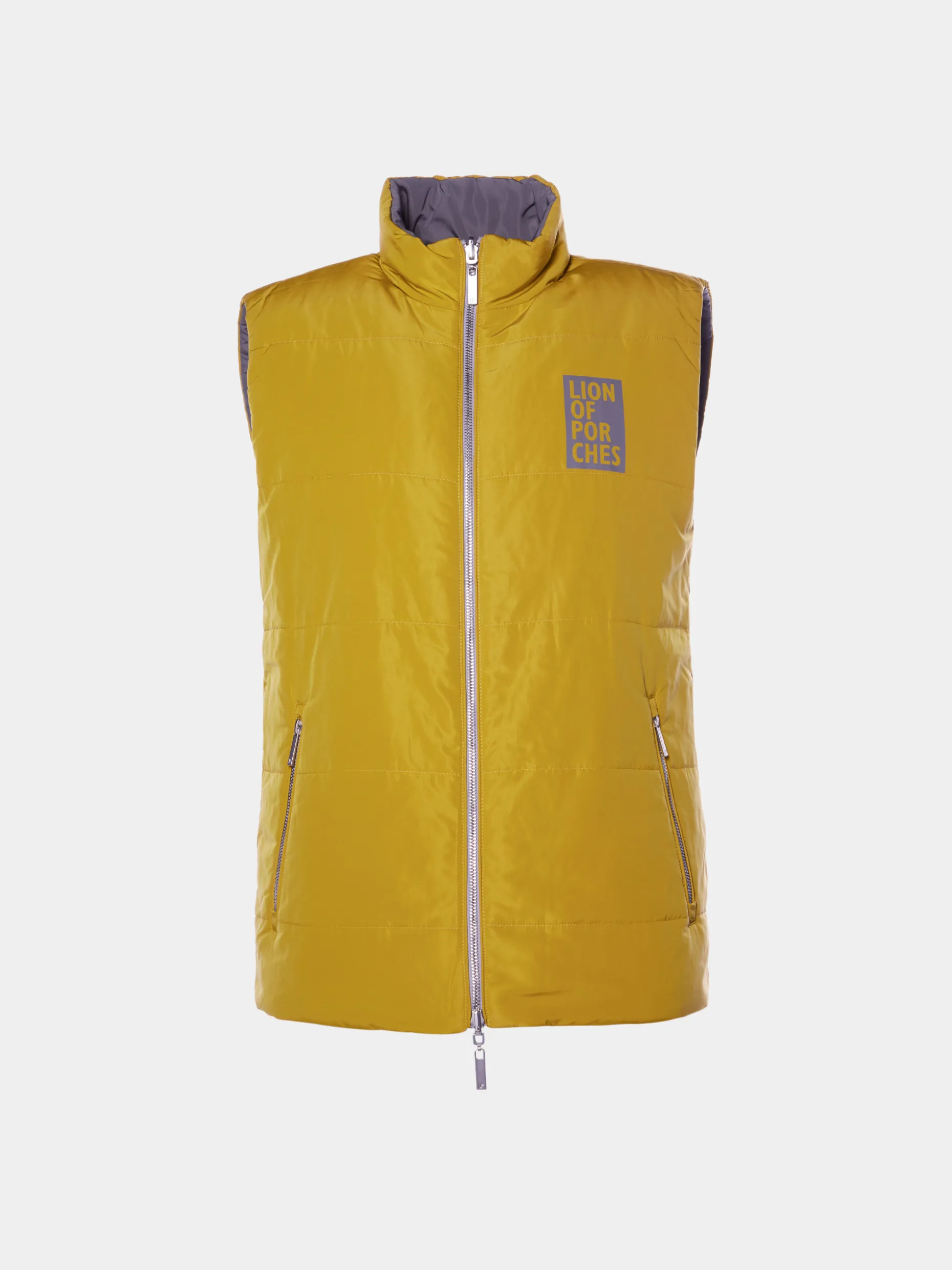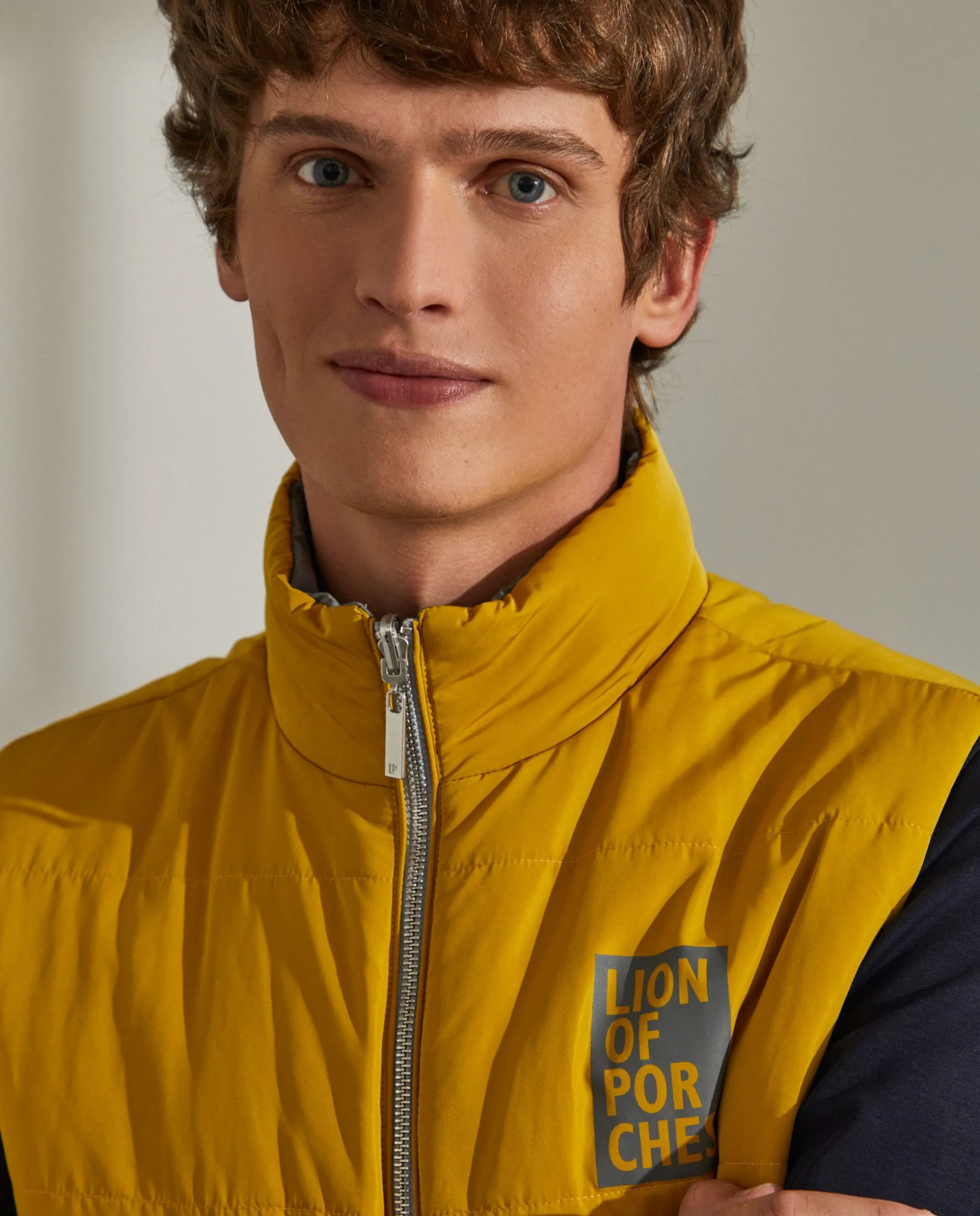 Complete o seu look com este colete reversível. Em tecido técnico, aperta com um fecho central reversível. Um lado é amarelo e conta com dois bolsos de fecho e o estampado Lion Of Porches no peito. O outro lado é em cinzento, com dois bolsos e o e emblema Lion Of Porches no peito.