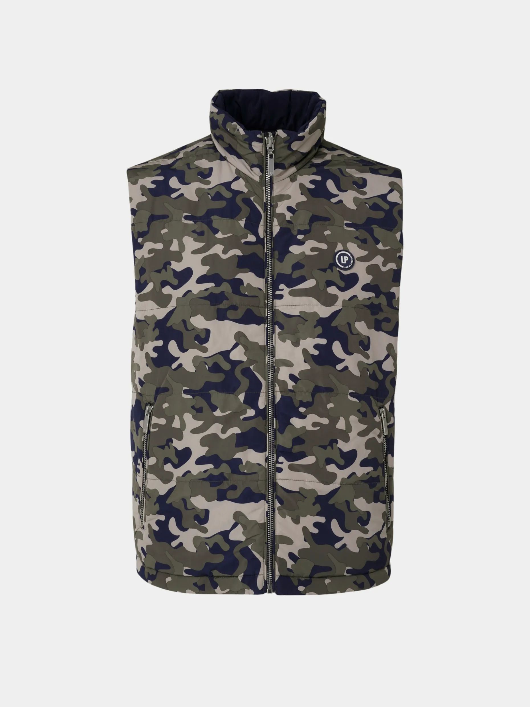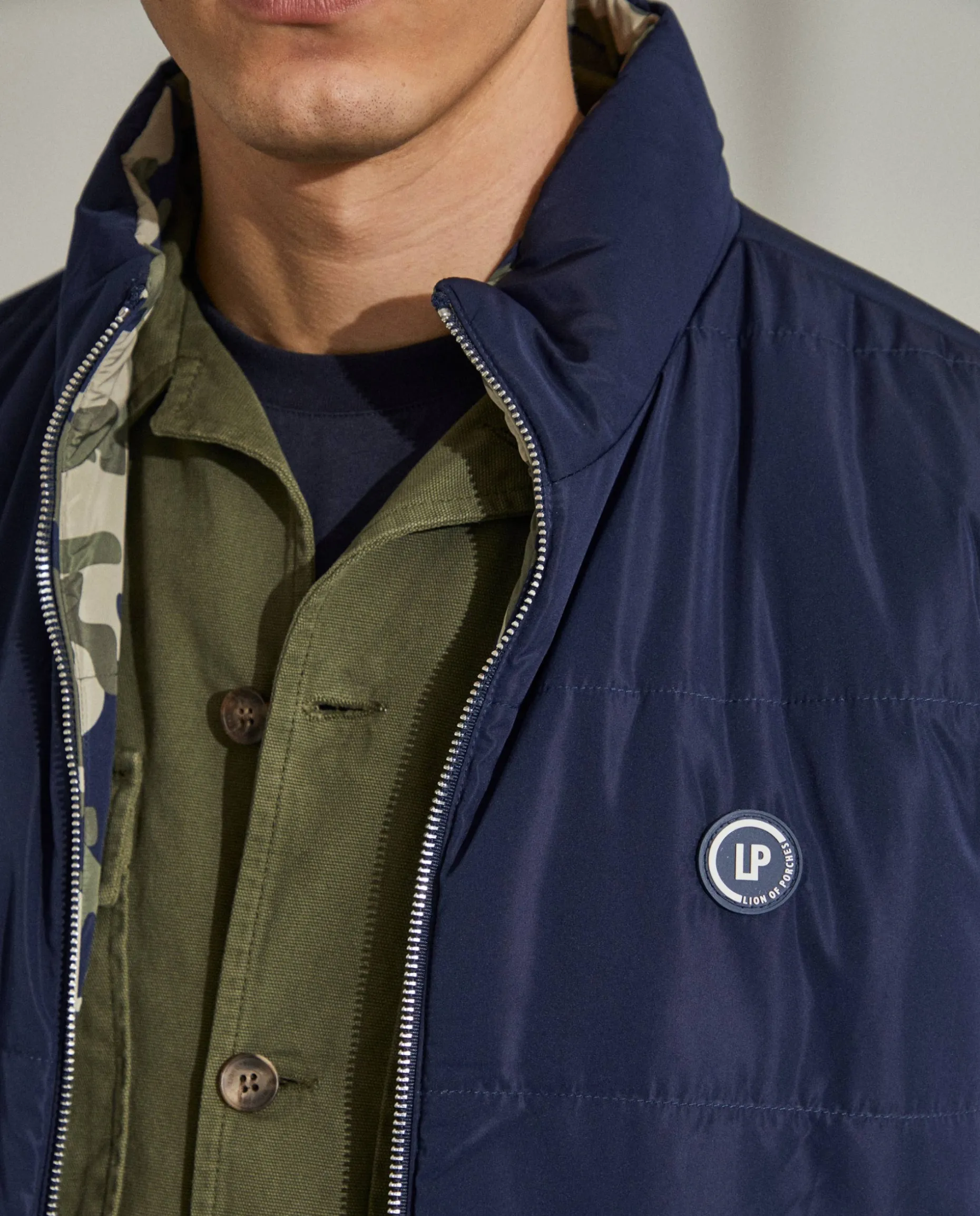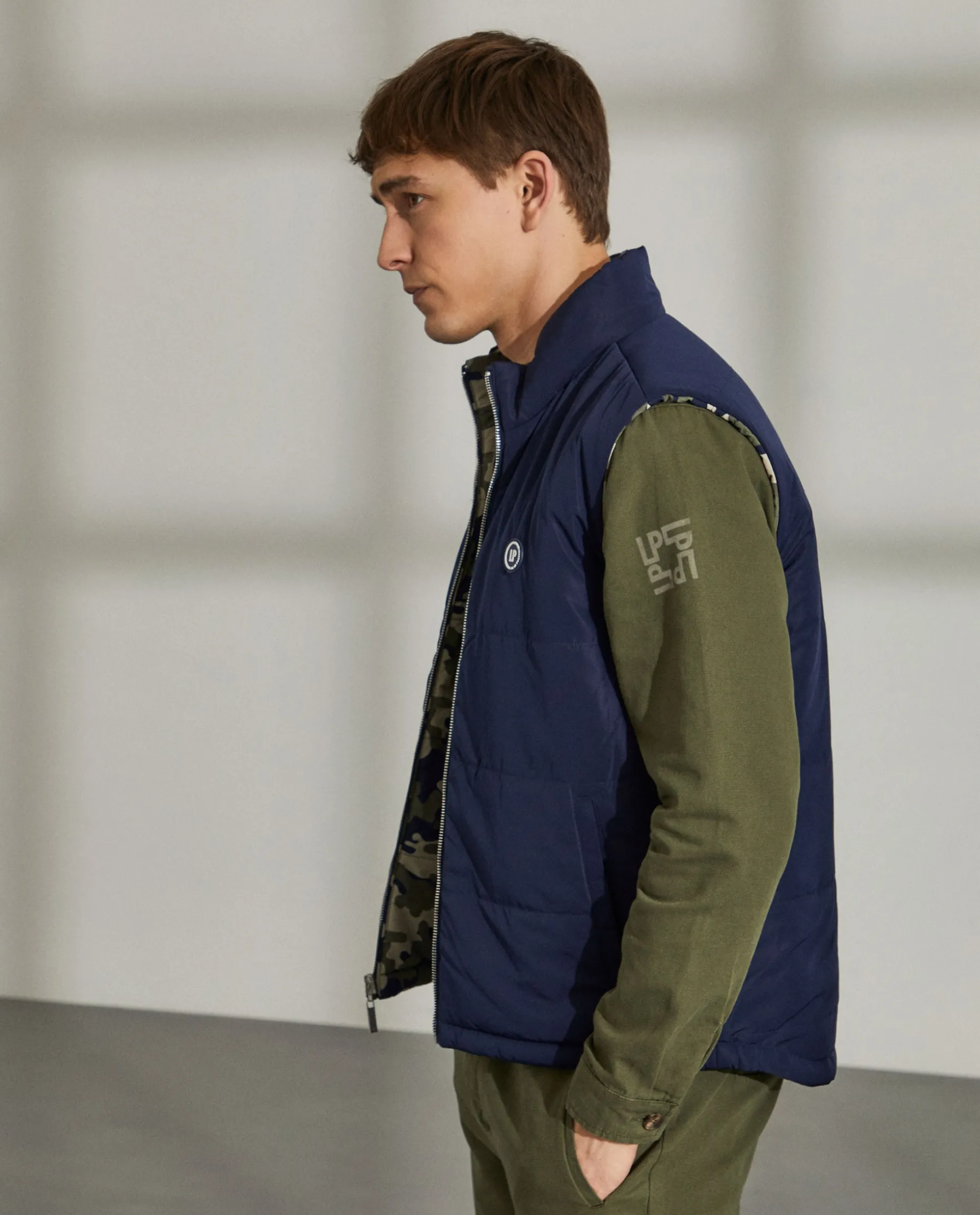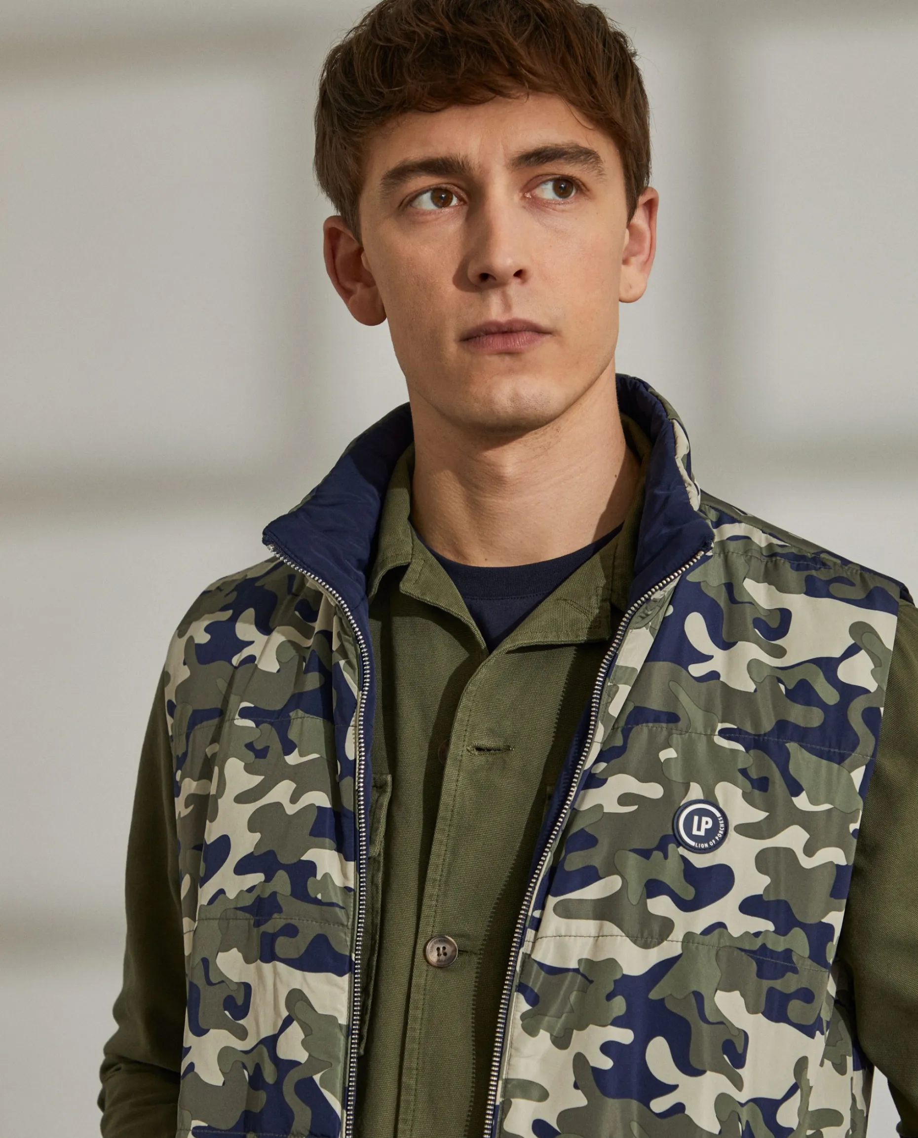 Colete reversível. Em tecido técnico. Aperta com fecho central reversível. Um lado com estampado camuflado e o outro com cor lisa. Dois bolsos em cada lado. Emblema Lion Of Porches no peito.