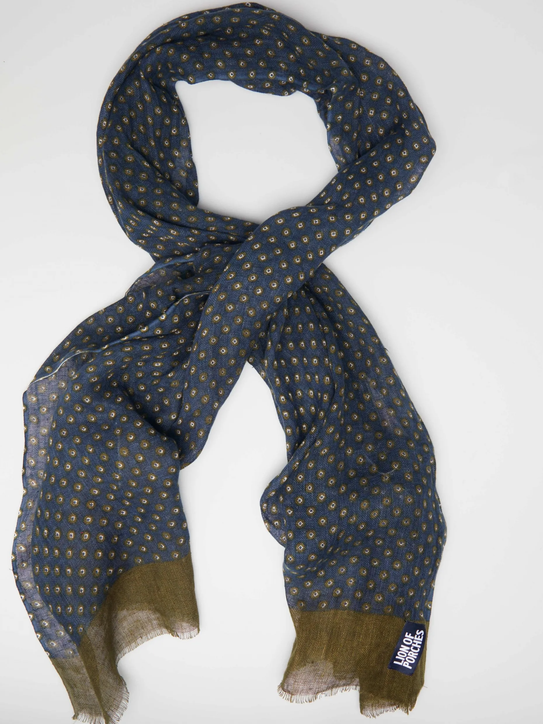 Echarpe de algodão com estampado de padrão ilustrativo tricolor e extremidades desfiadas. Medidas: 180cm X 70cm
