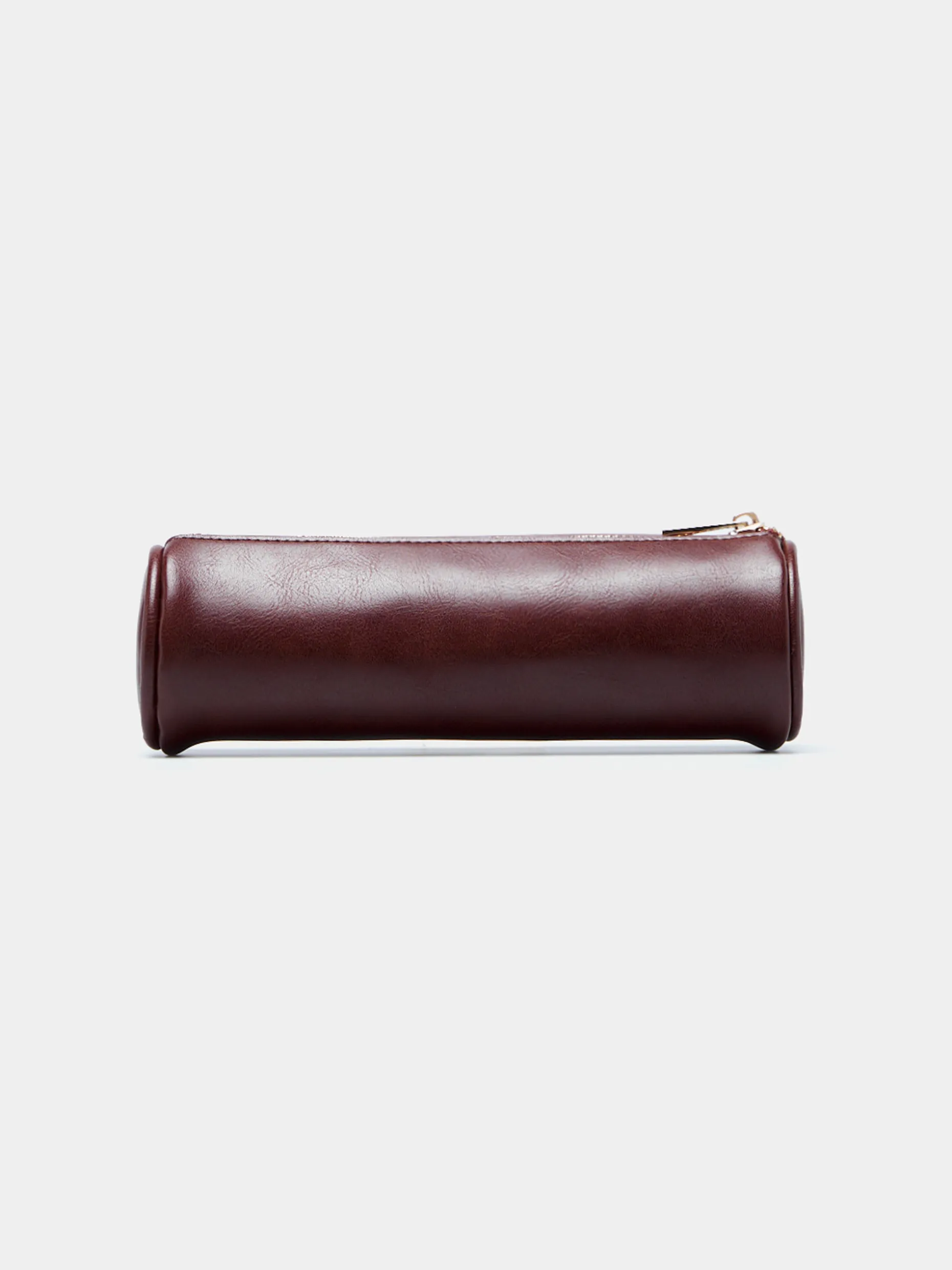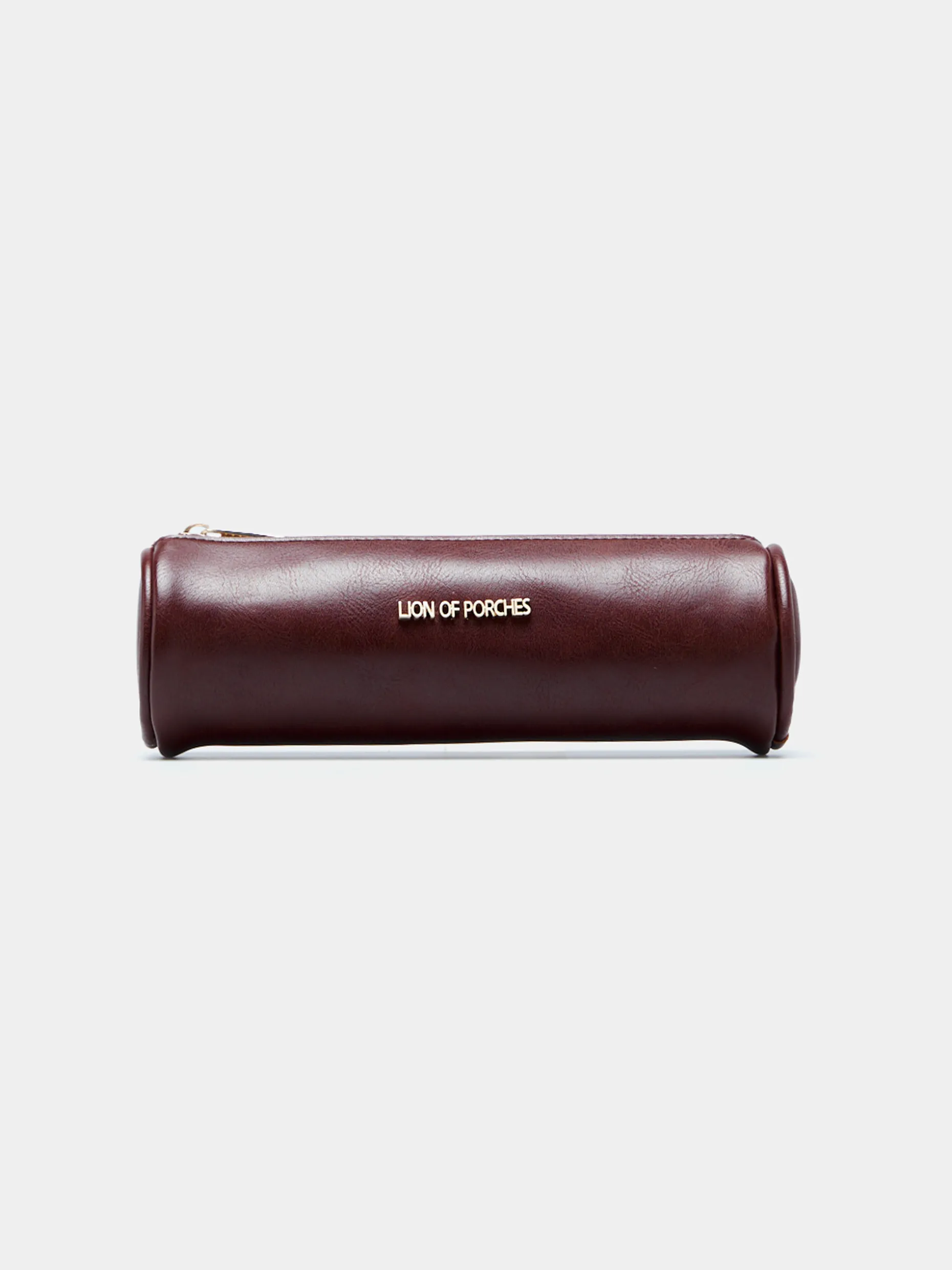 Estojo cilíndrico, efeito pele. Com aplicação metálica Lion of Porches e fecho zíper na parte superior.