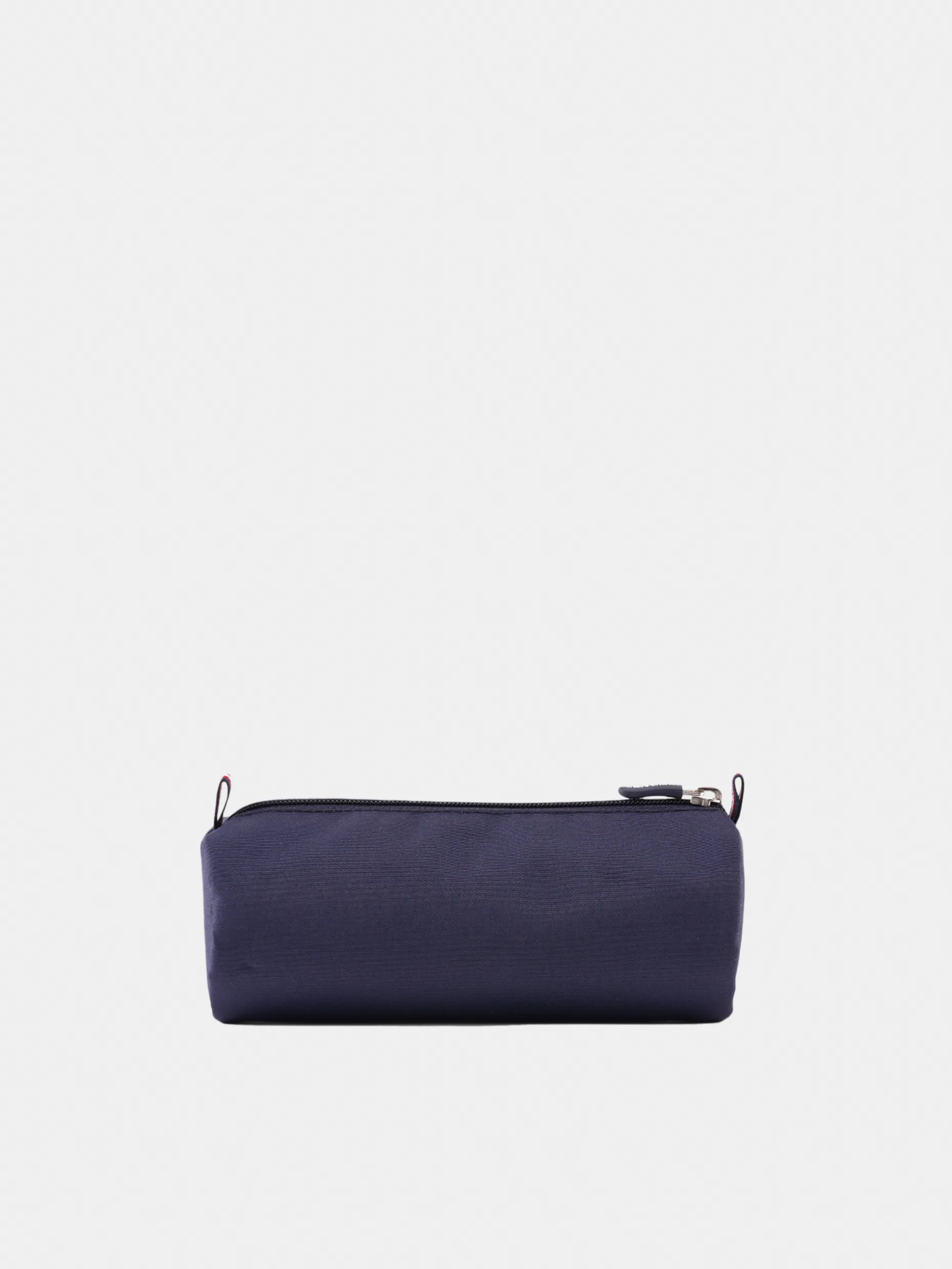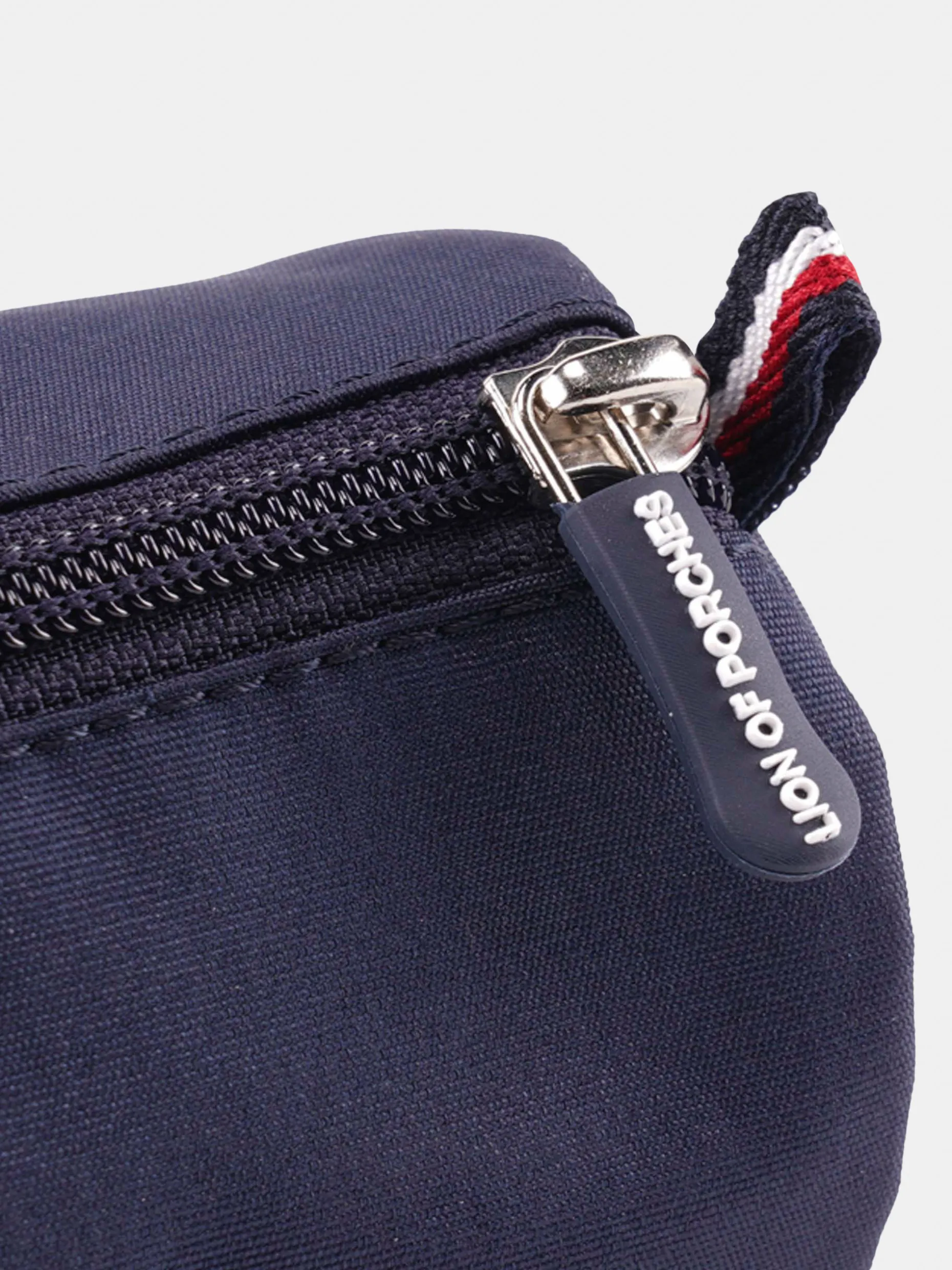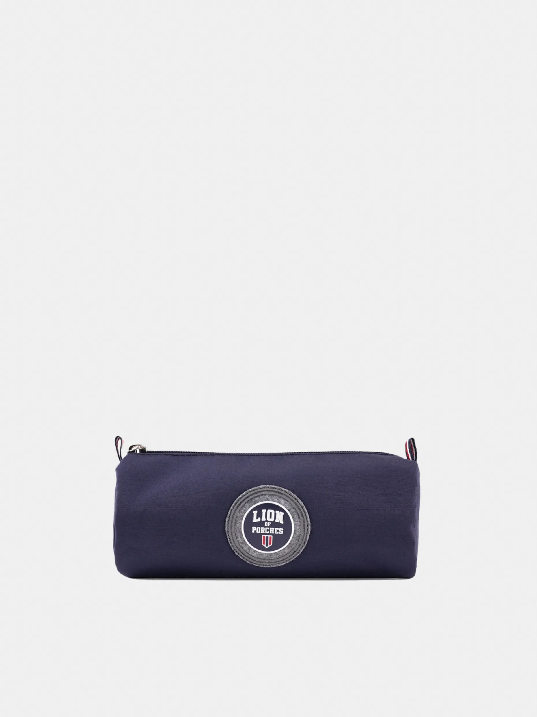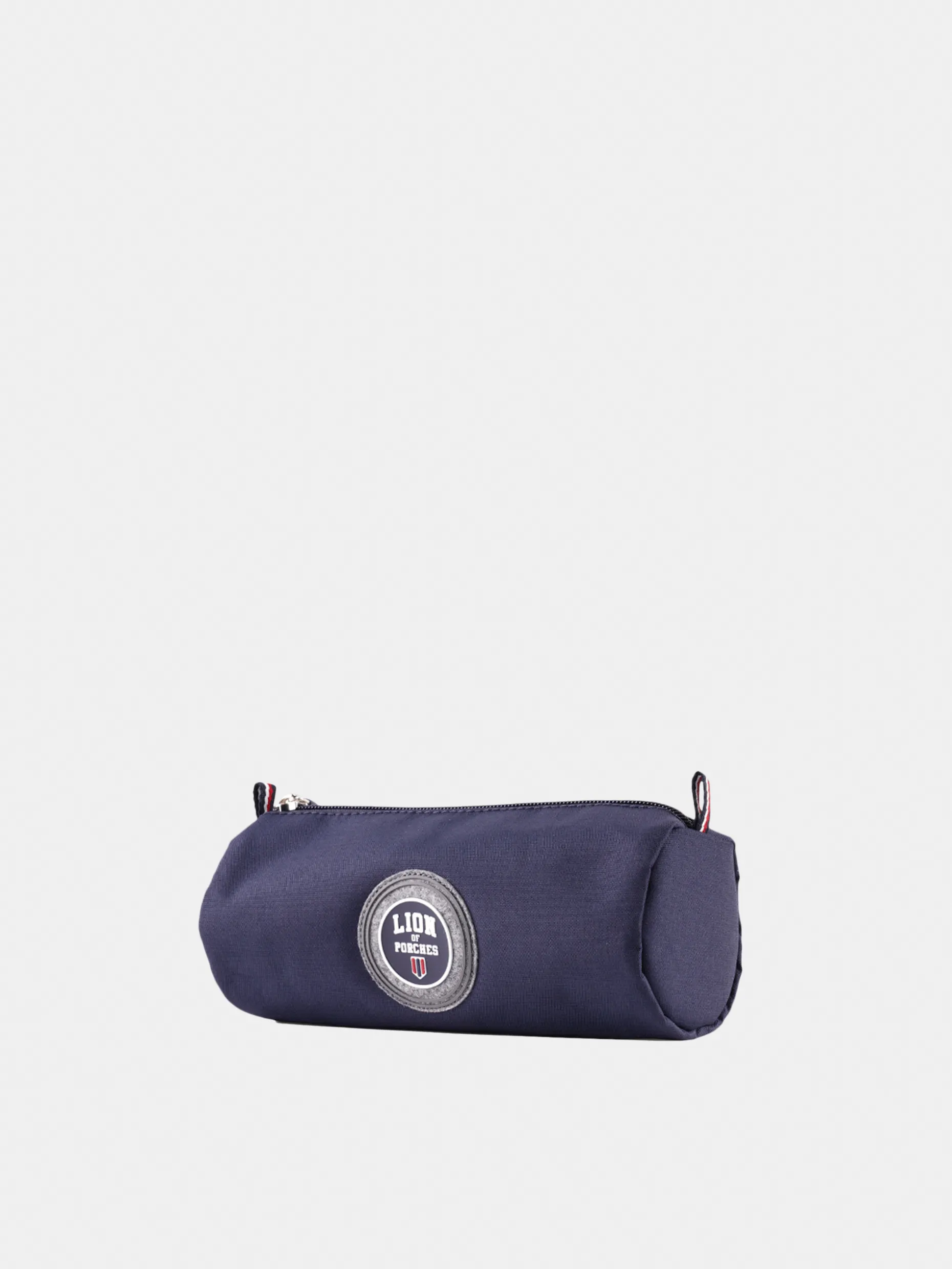 Estojo de formato cilíndrico com emblema Lion of Porches redondo na frente. Fecha com zíper personalizado e fita tricolor na ponta.