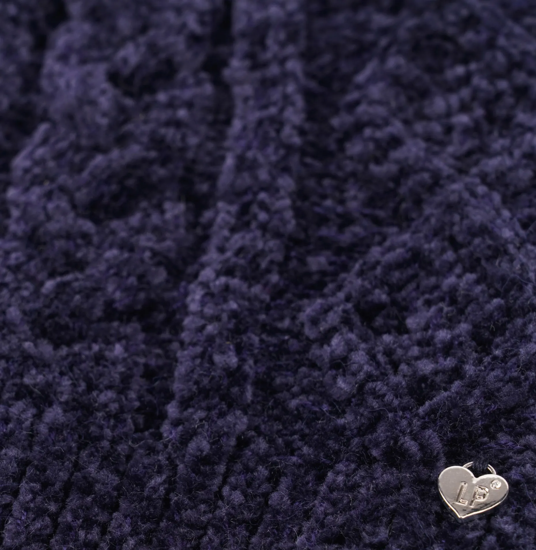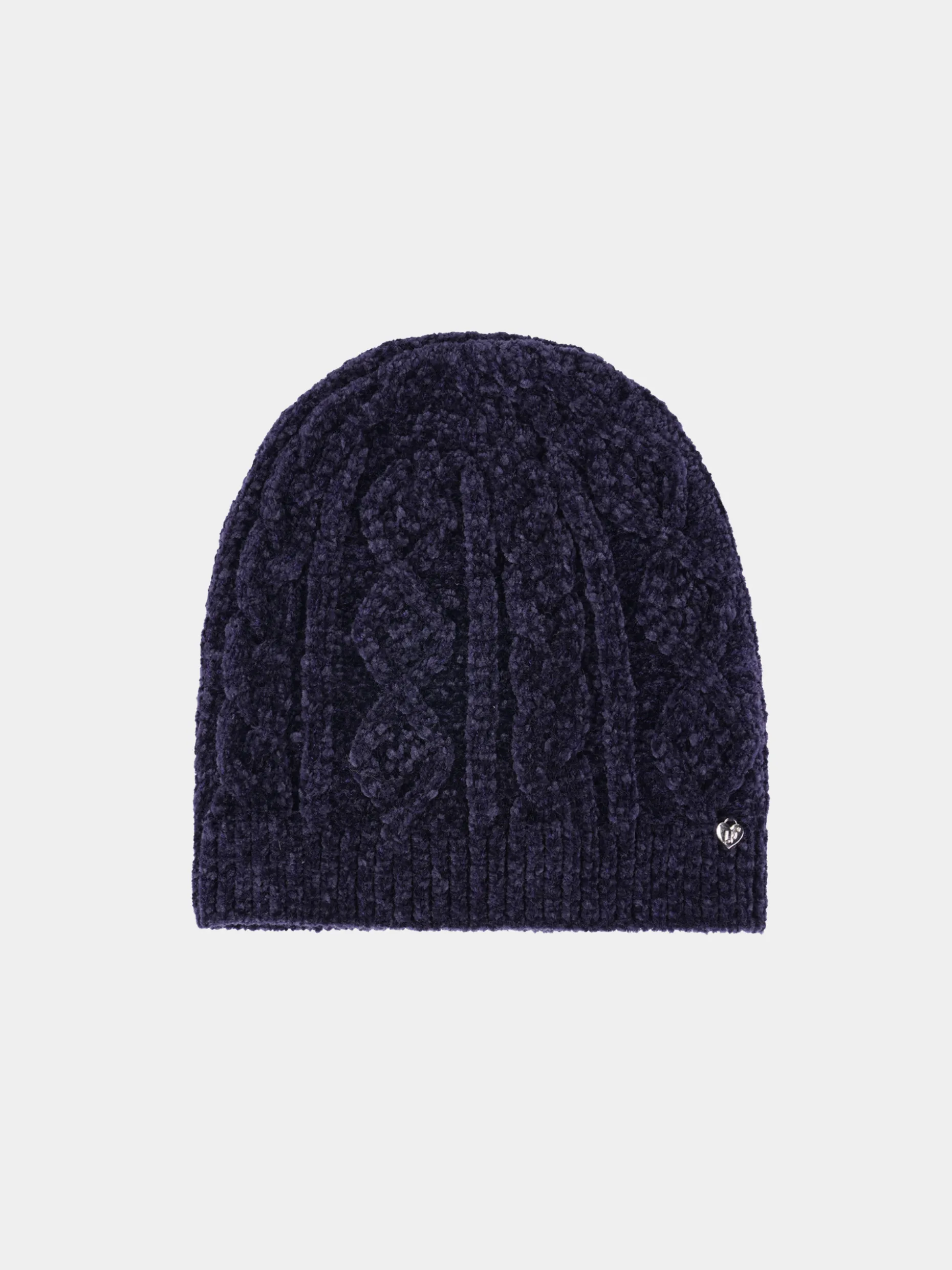 Gorro em chenille com motivos entrançados. Personalizado com pequeno coração metálico no canelado.