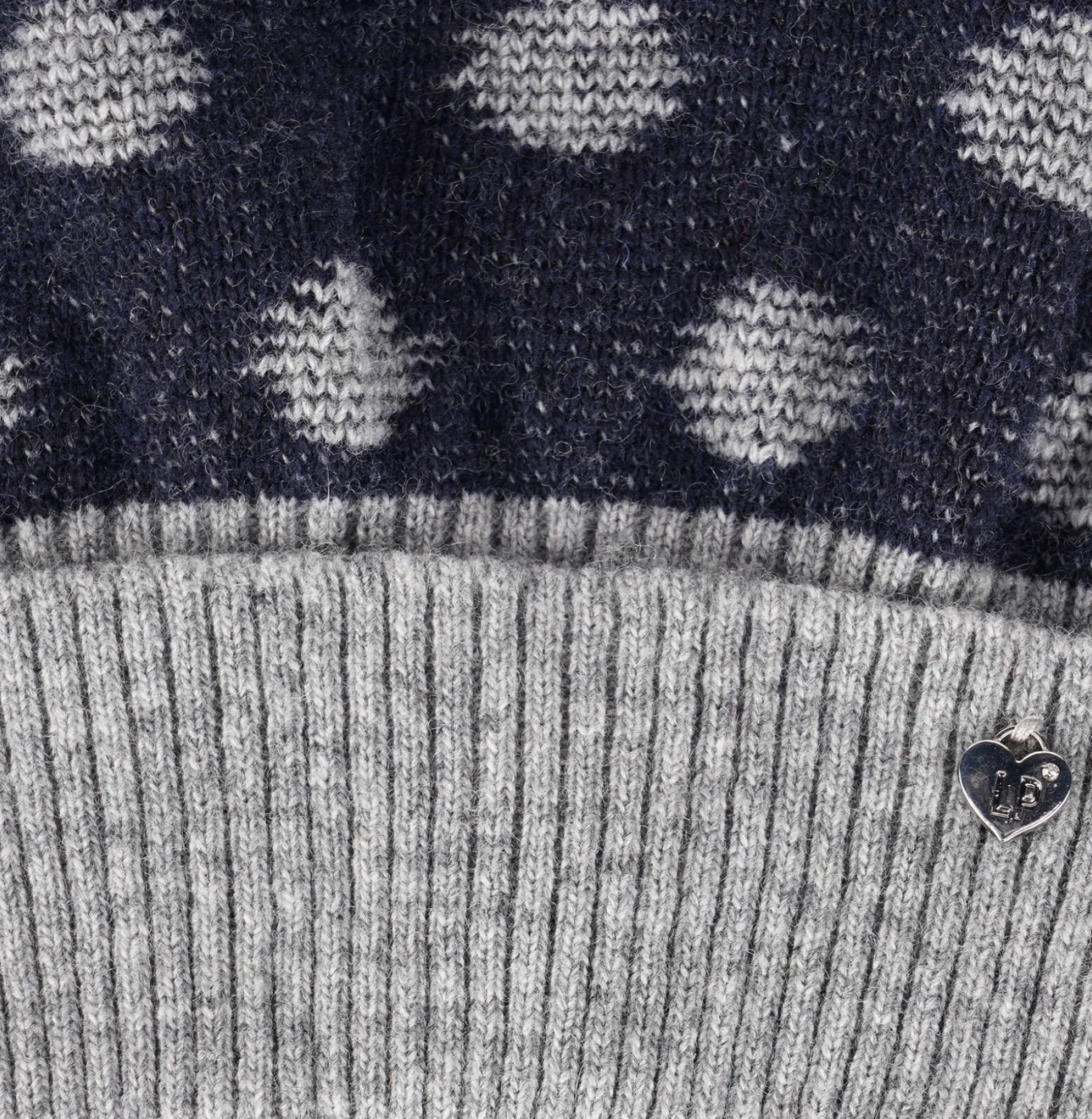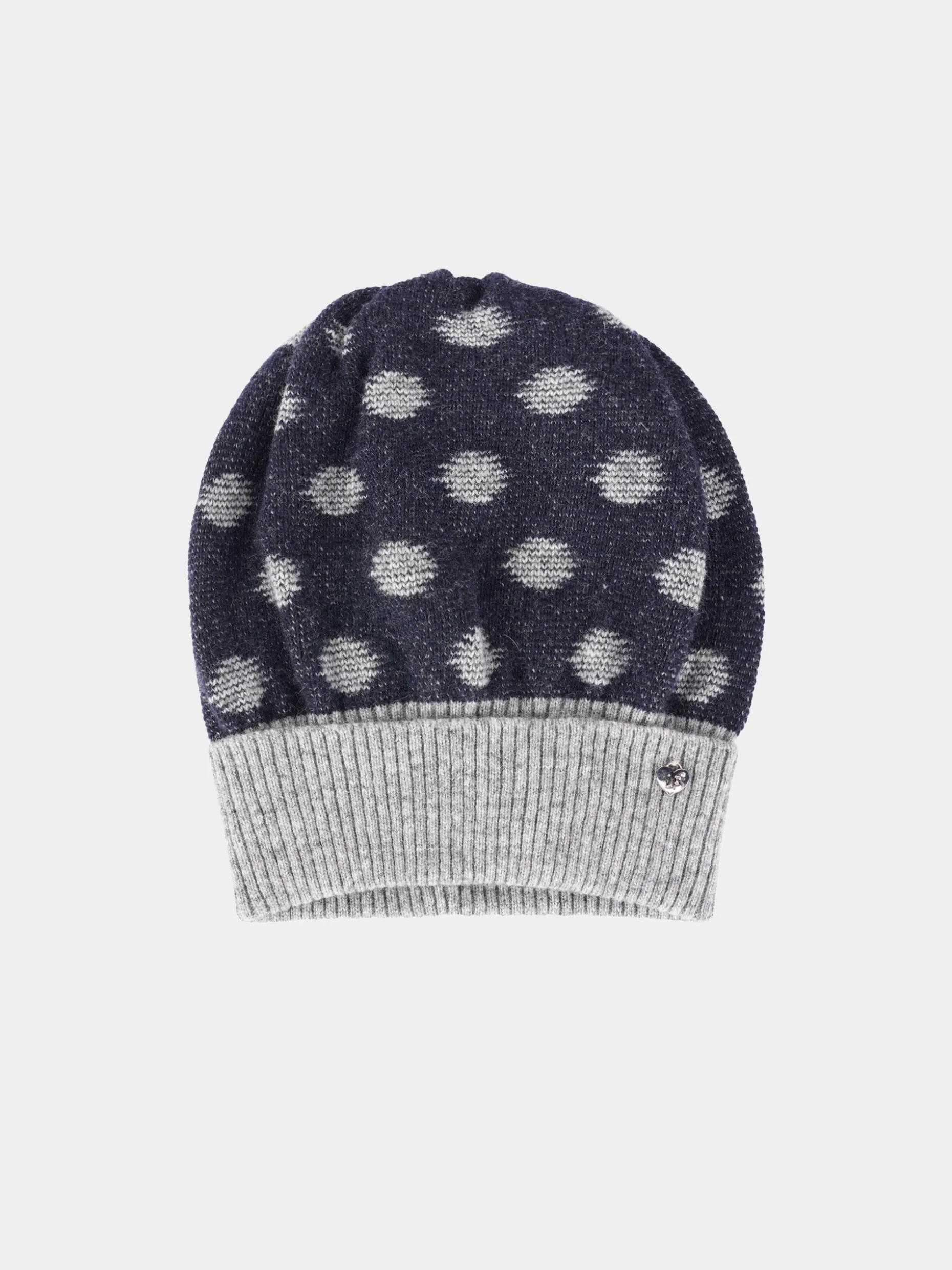 Gorro com jaquard de bolinhas. Canelado em contraste. Personalizado com pequeno coração metálico “LP”.