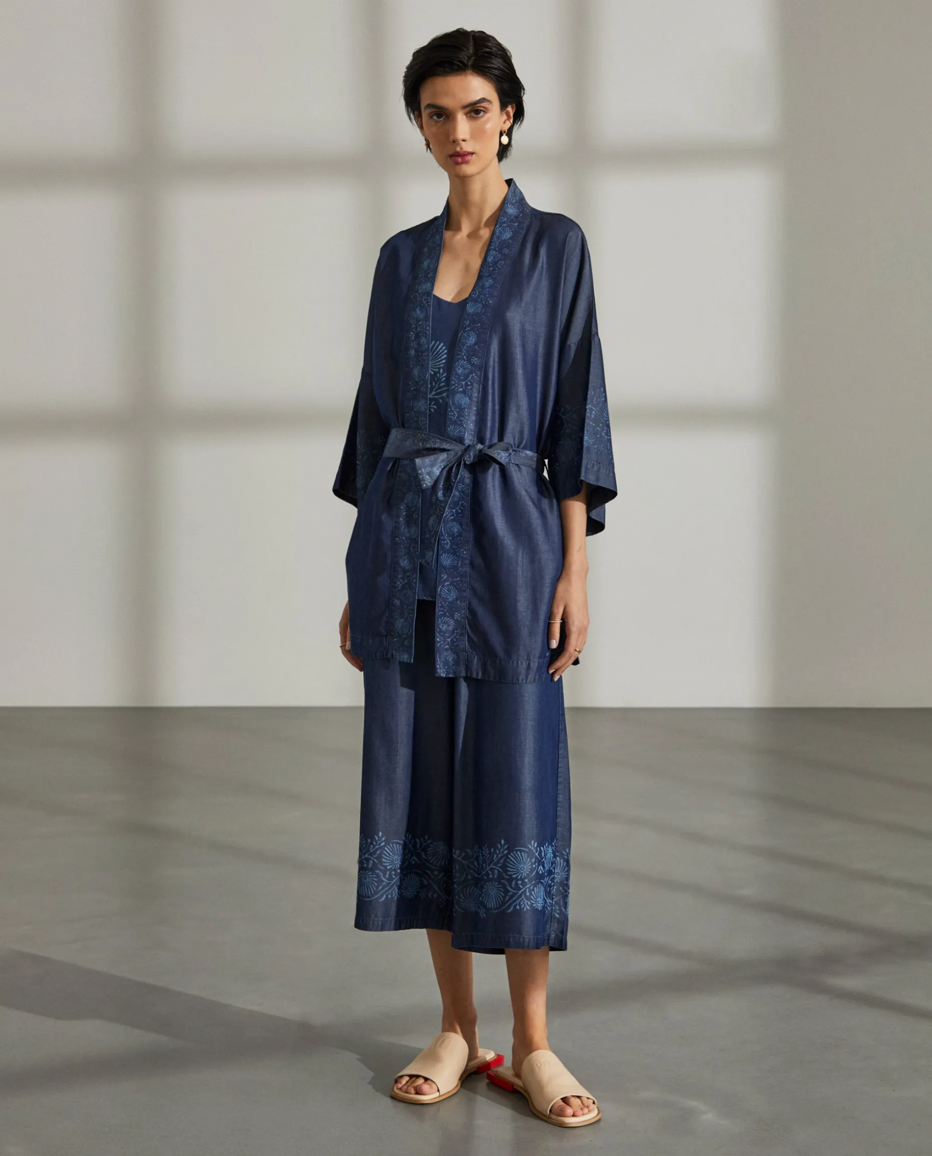 Quimono comprido confecionado em 100% lyocell estampado a laser. Aperta com cinto estampado. Aberturas laterais.