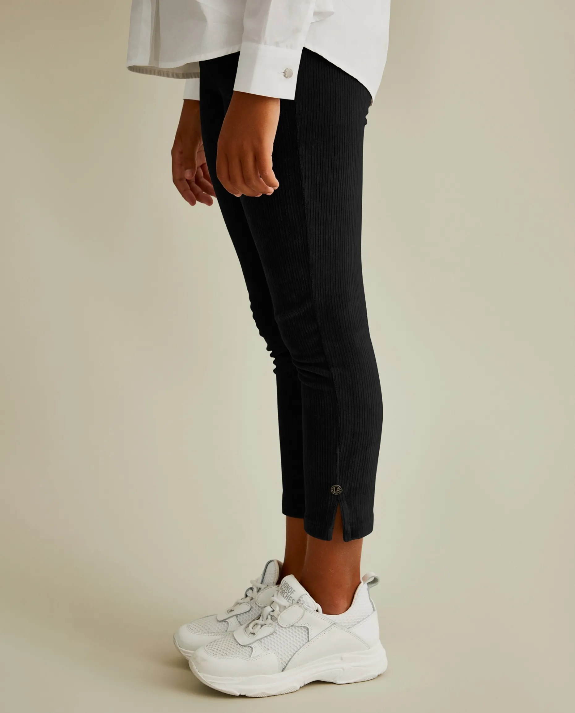 Leves e confortáveis é como as miúdas se vão sentir com estas leggings em malha de veludo canelado. De cintura elástica. Finalizam com placa redonda Lion of Porches e pequenas aberturas laterais na base da perna.