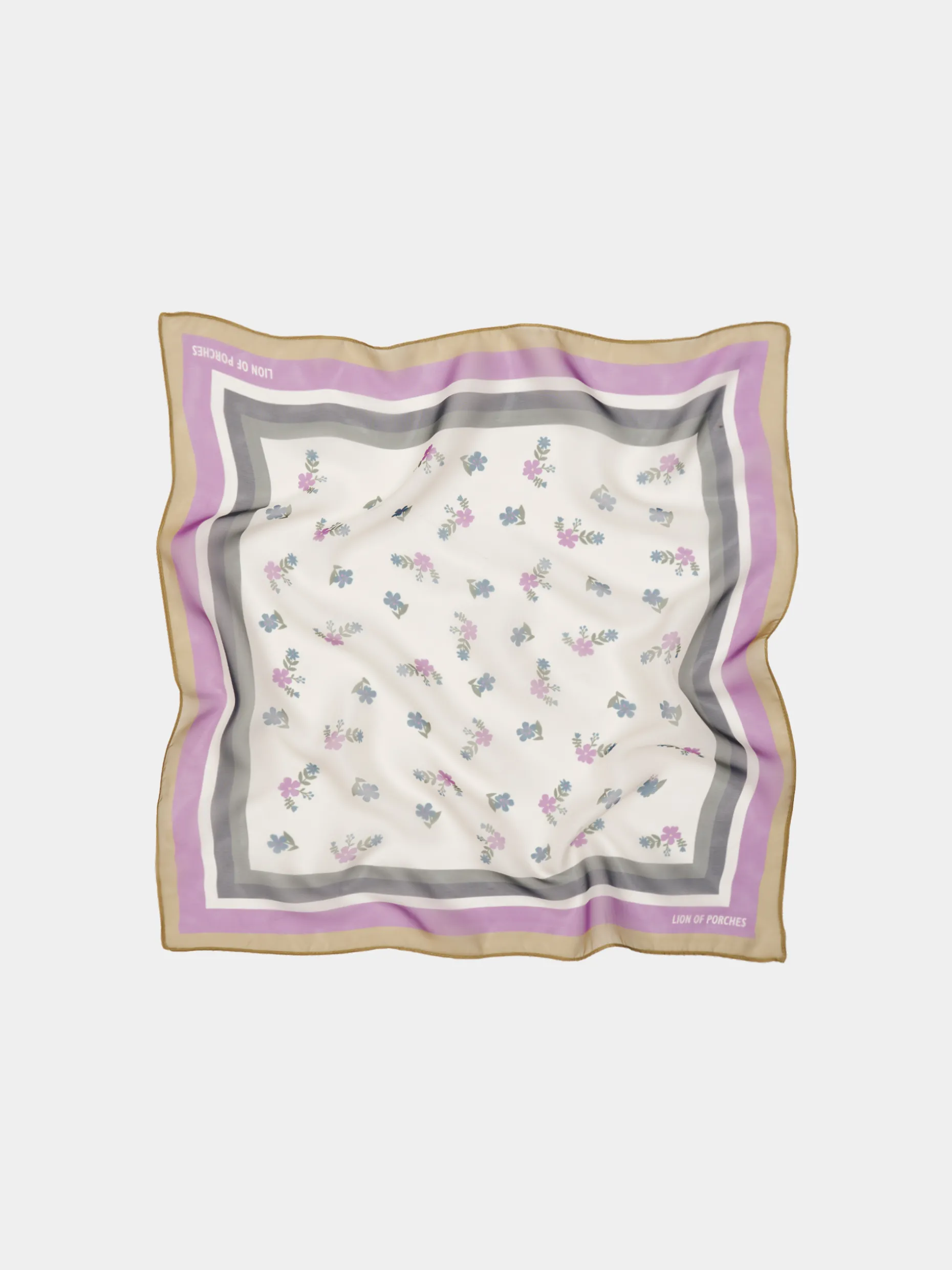 Lenço colorido, semitransparente, de formato quadrado. Com padrão de flores no interior e riscas a toda a volta. Finaliza com logotipo Lion of Porches nas pontas em contraste de cor.