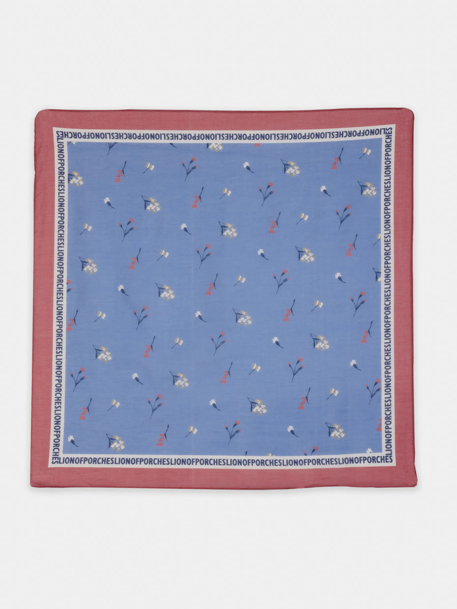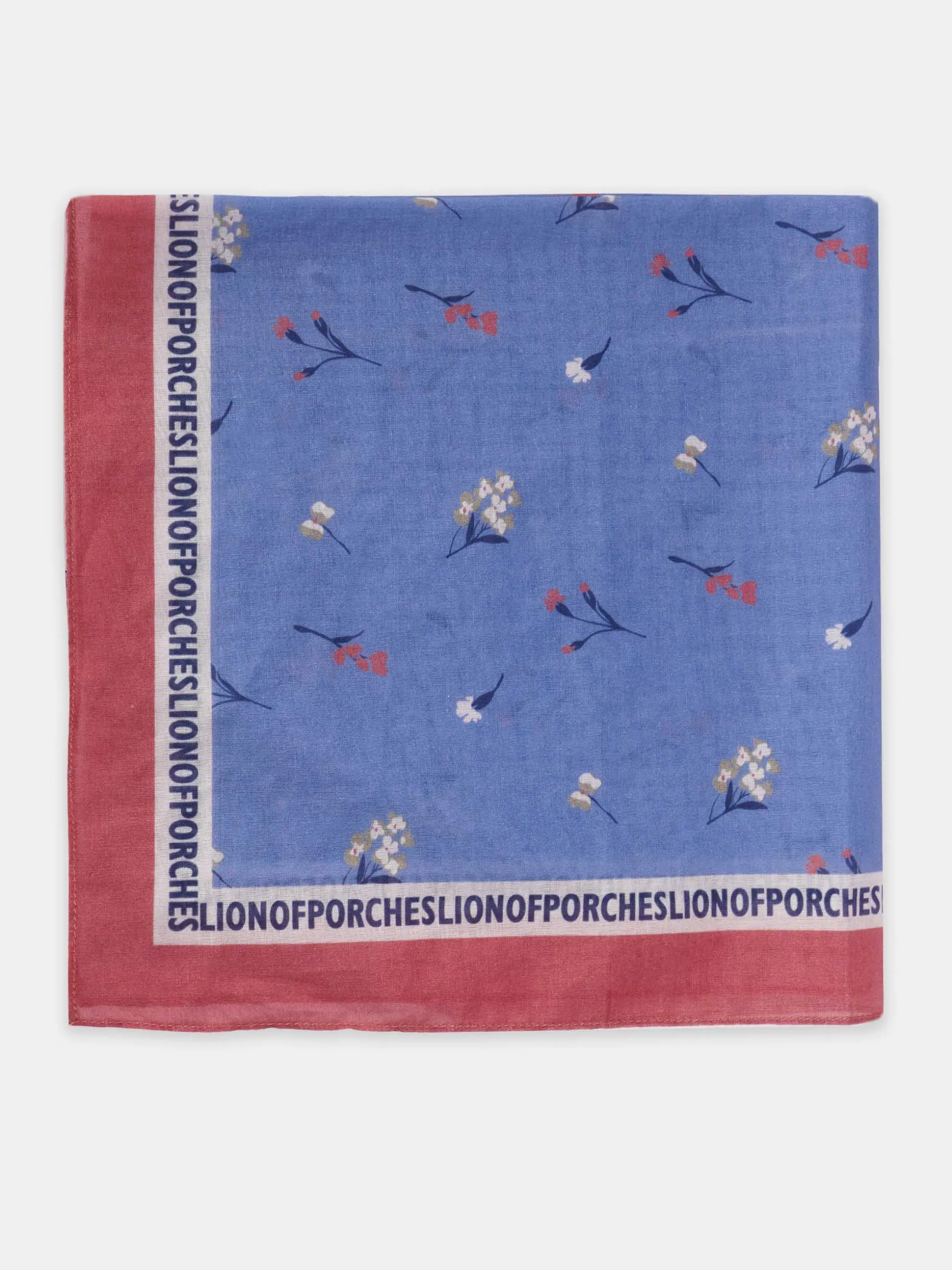 Lenço confecionado em 100% algodão com padrão floral. Branding Lion of Porches e borda a cor contraste nas extremidades.