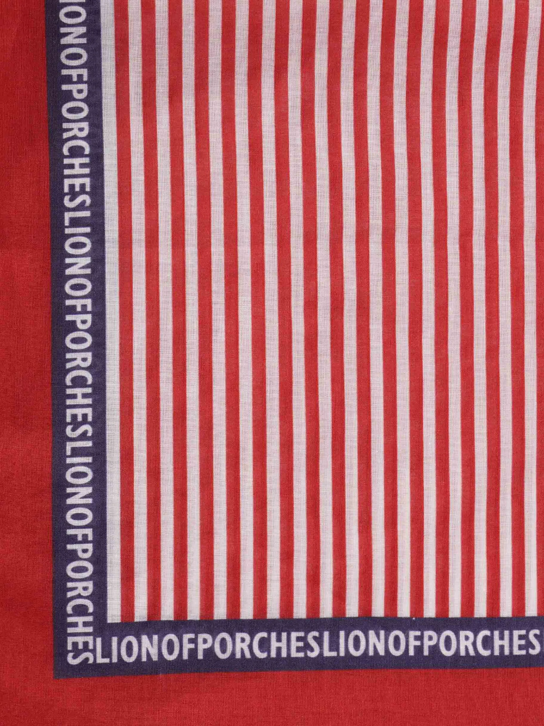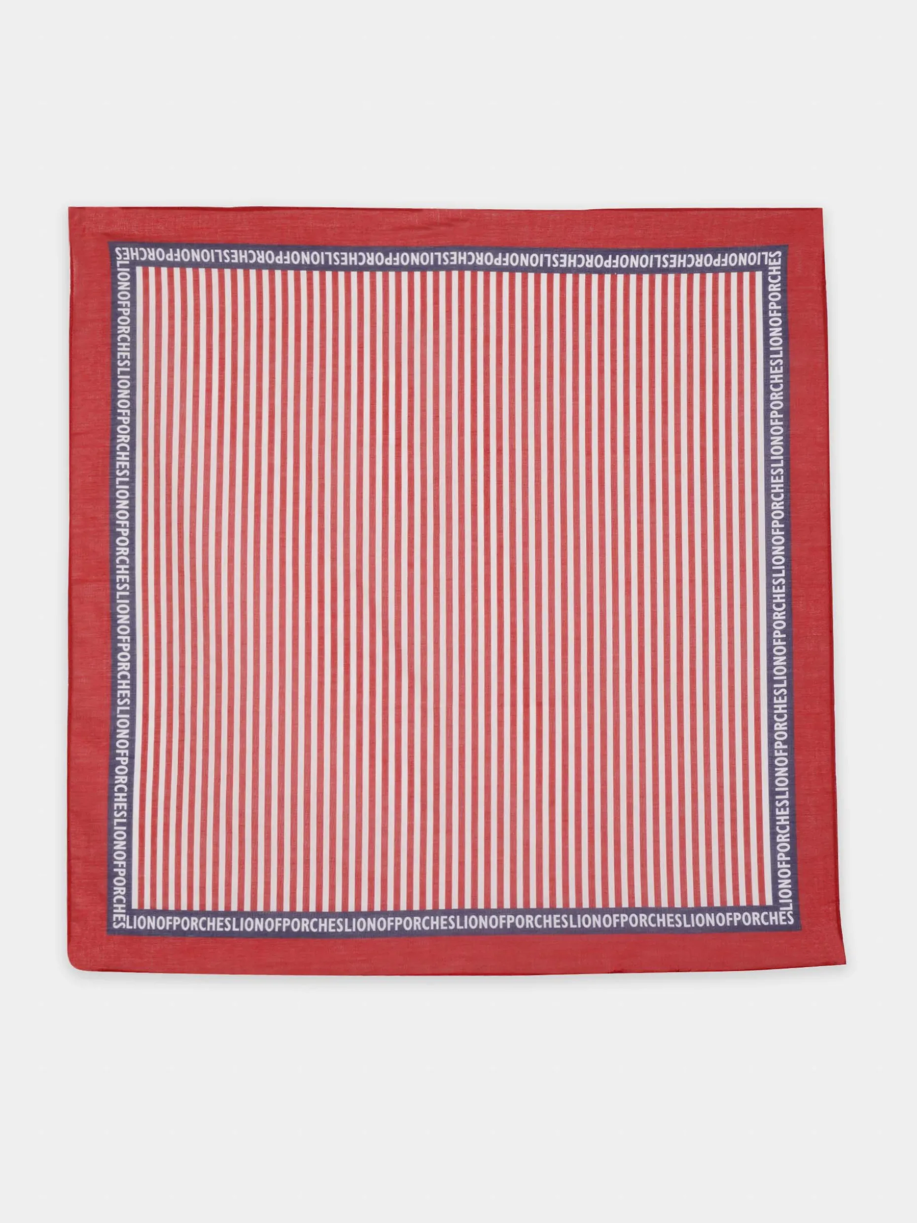 Lenço com estampado de riscas 100% algodão. Branding Lion of Porches e borda a cor contraste nas extremidades.