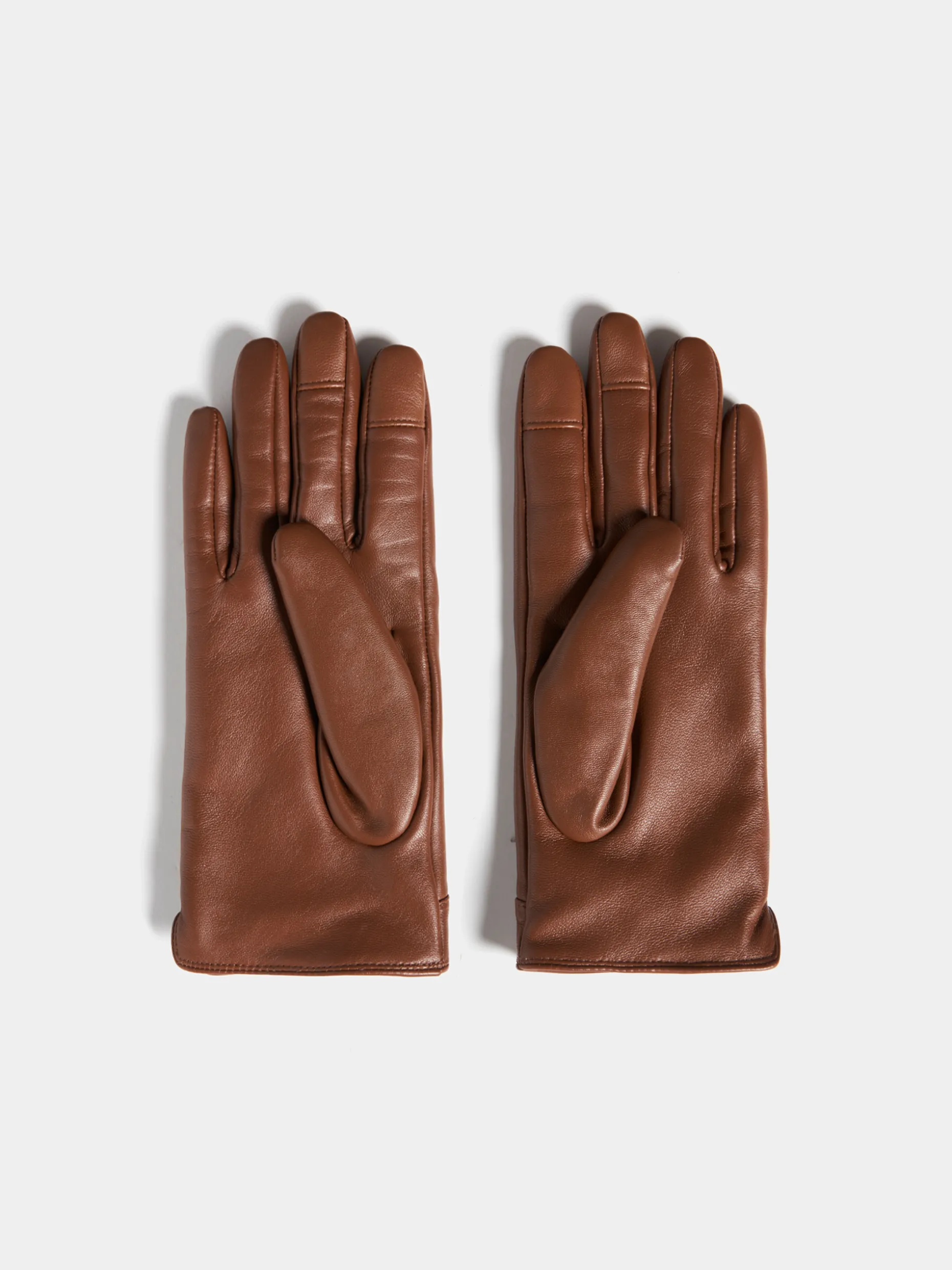 Elegantes e sofisticadas luvas em pele com forro interior em lã para maior isolamento térmico. De cor lisa, com aplicação metálica em dourado.