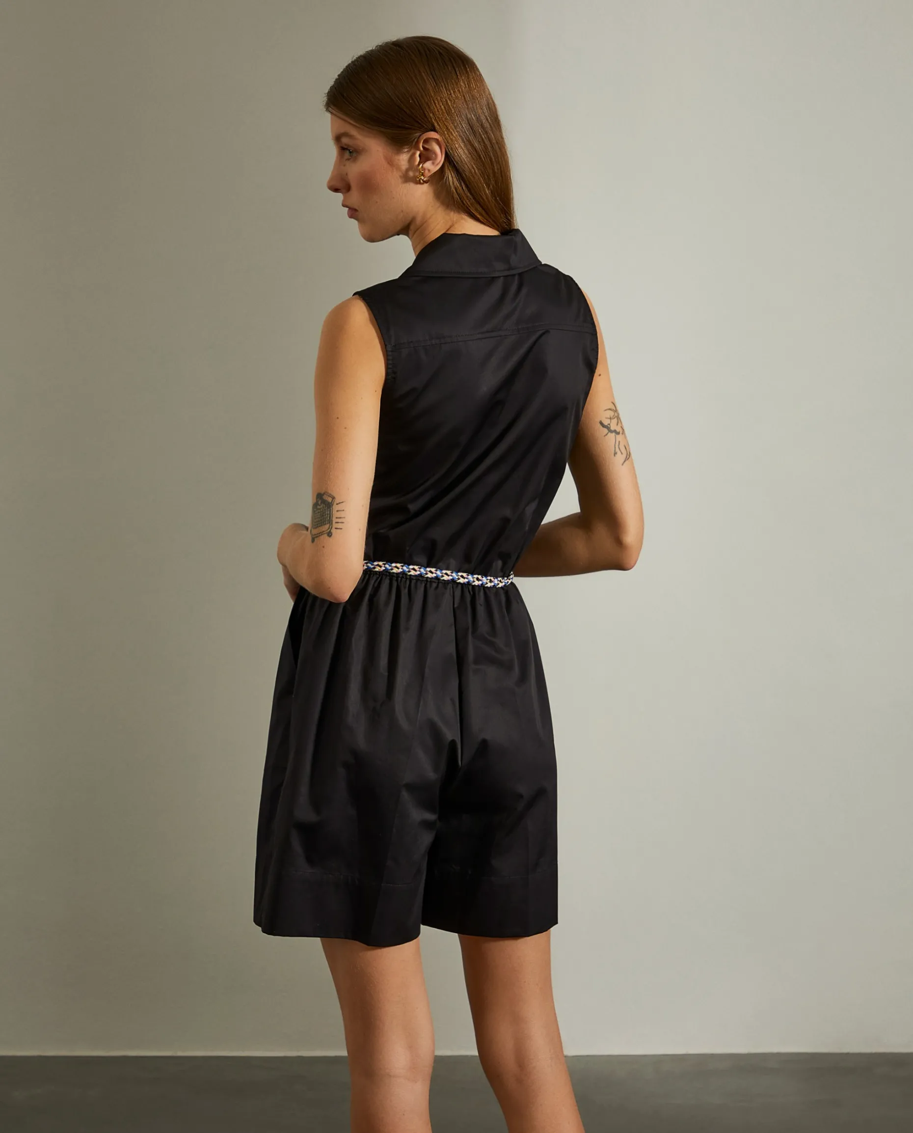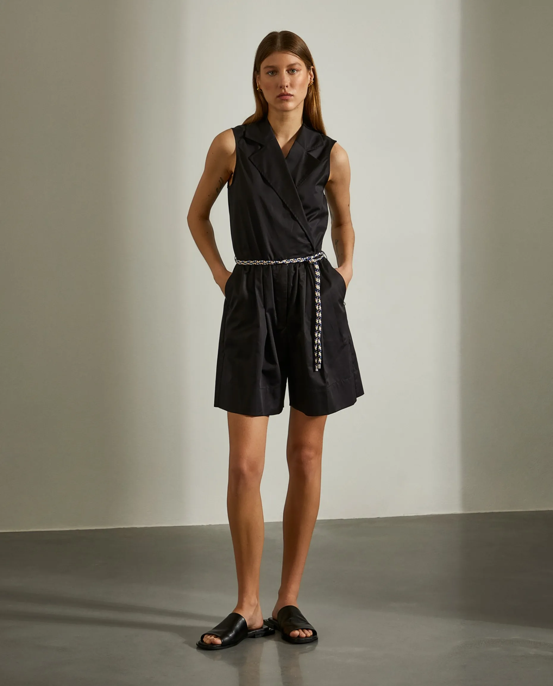 Macacão curto com trespasse e cordão colorido como cinto. Perna dos calções com vinco.