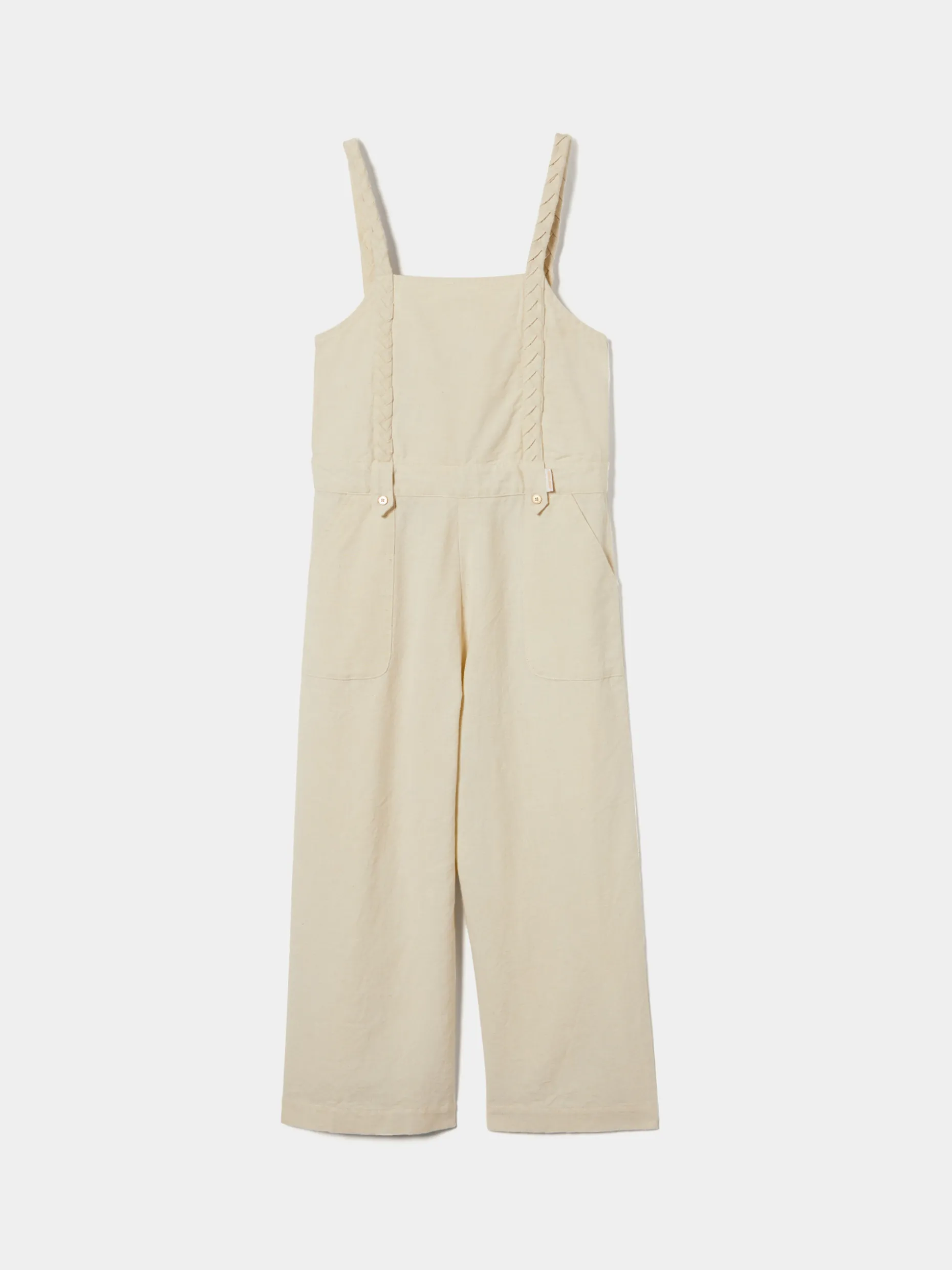Um look leve e confortável para as miúdas, este macacão tem alças finas entrançadas e perna larga. Com bolsos laterais e presilhas no cinto com botões. A parte detrás tem elástico nas costas e cintura. É confecionado com uma mistura de algodão e linho tornando-o a escolha perfeita para as estações mais quentes.