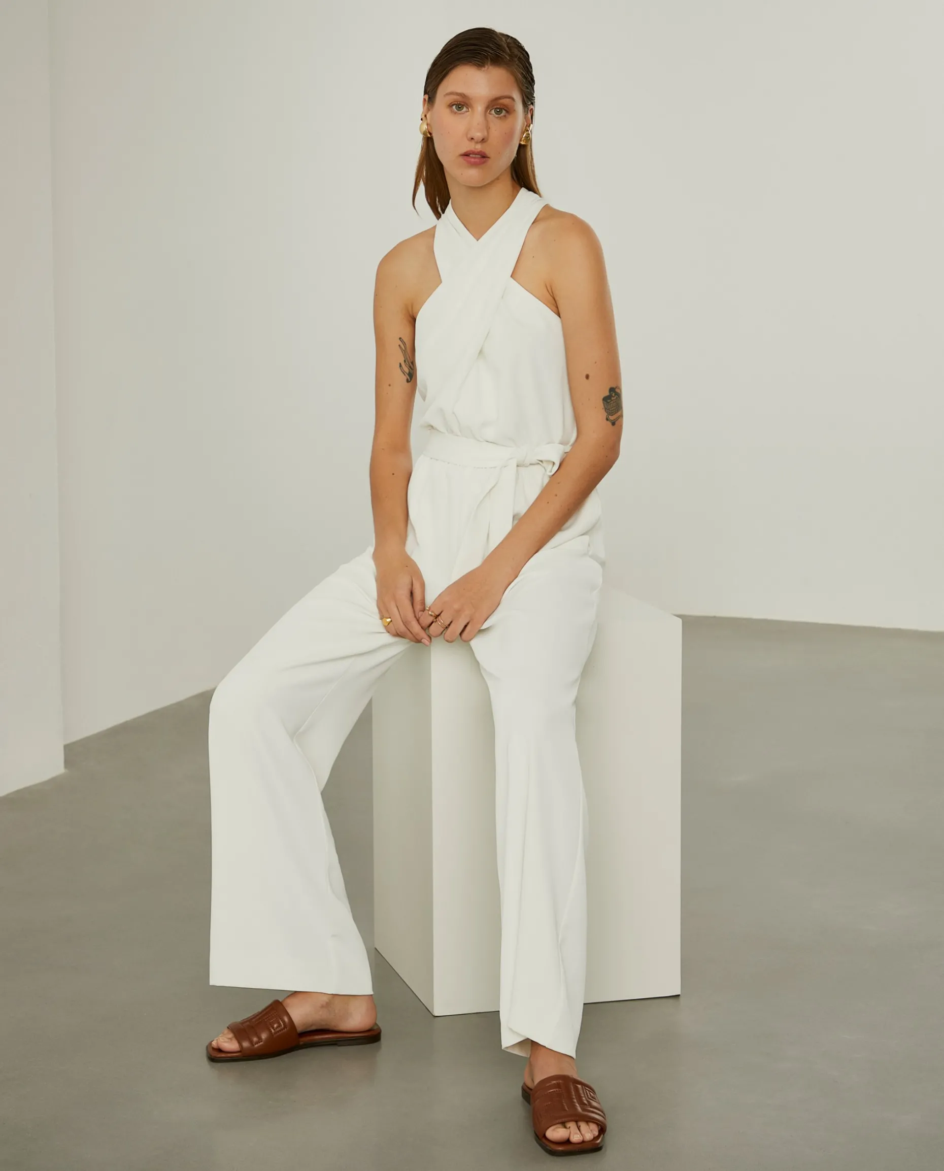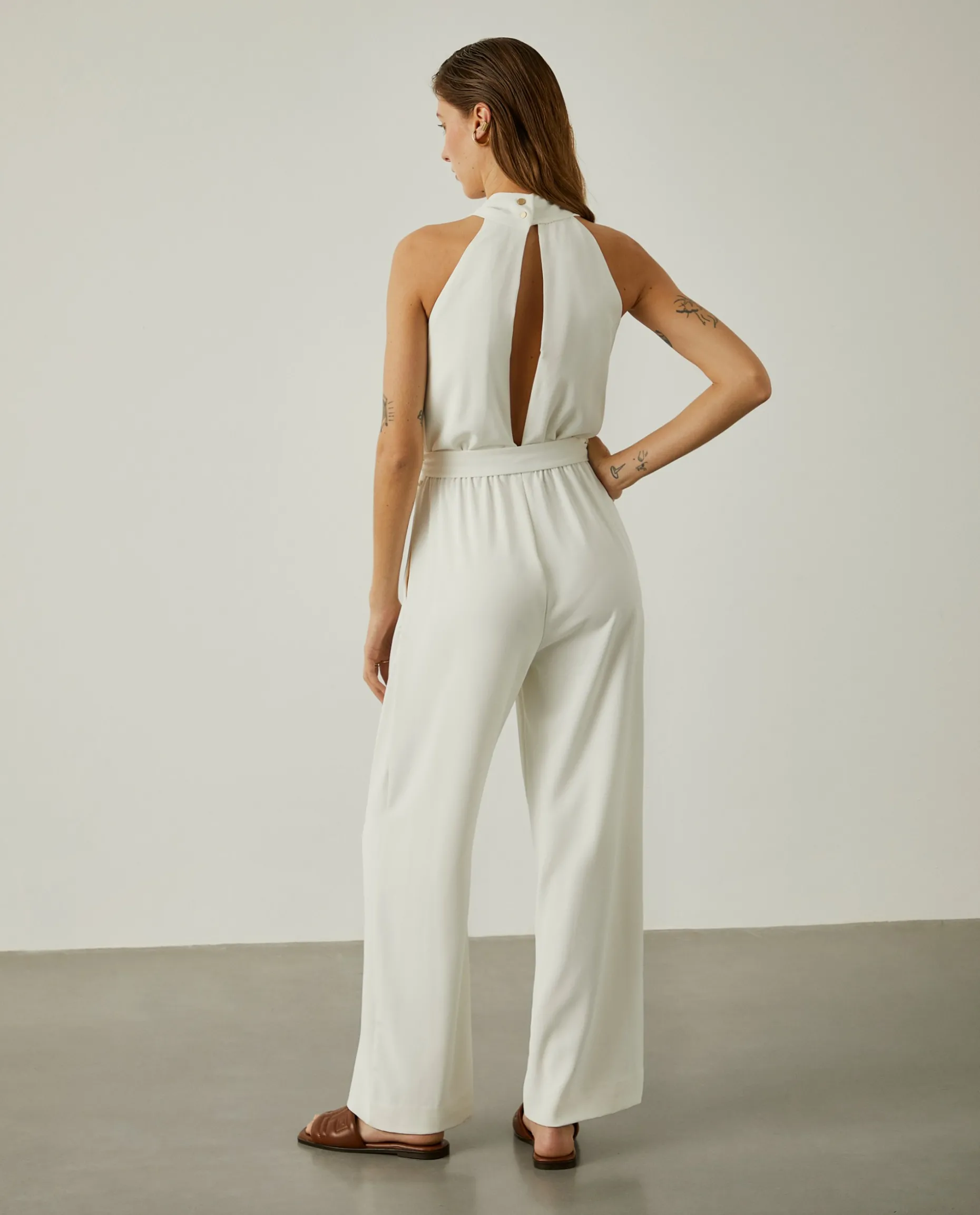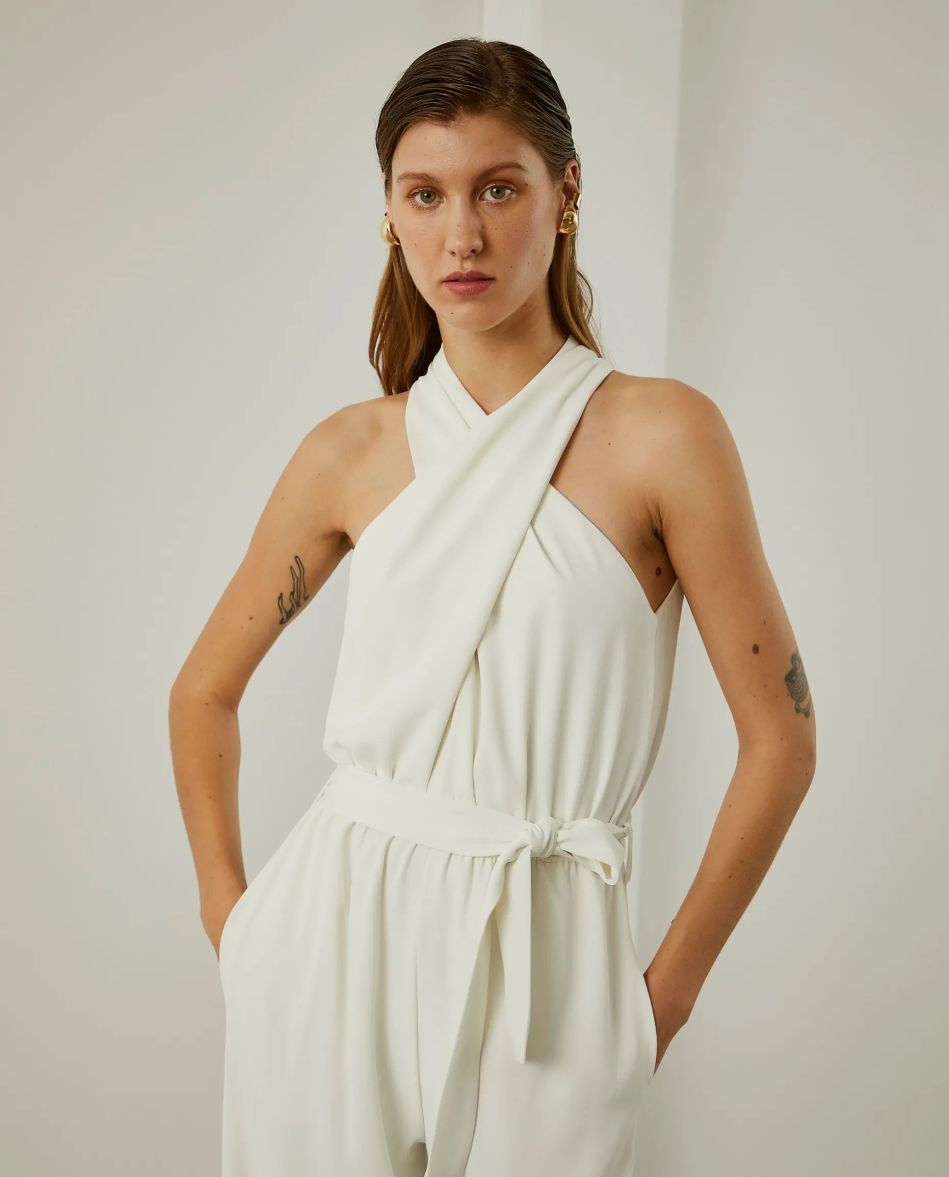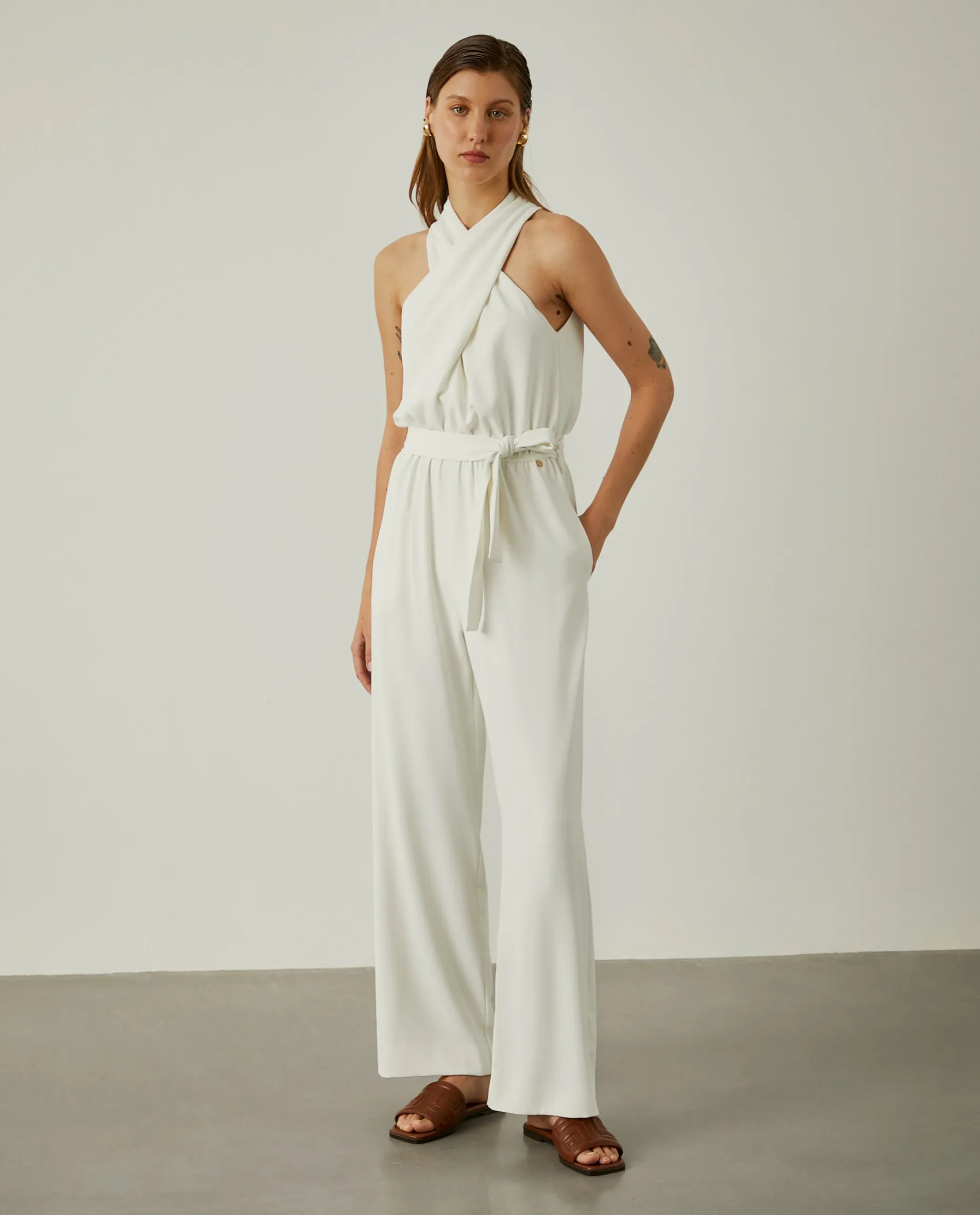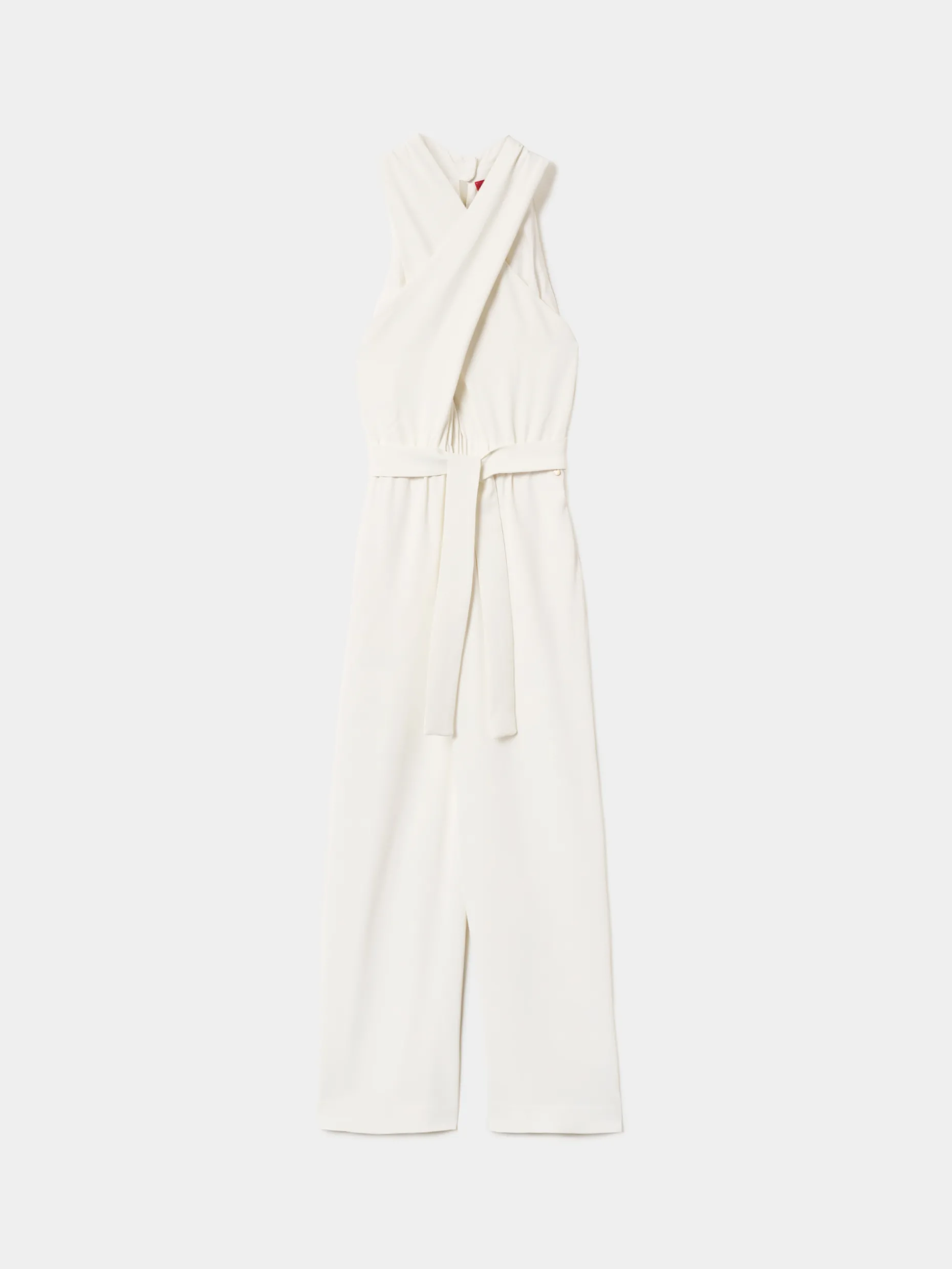 Revele toda a sua elegância com este macacão de perna larga, sem mangas e com decote cruzado a apertar atrás com botões. Com elástico e cinto ao tom na zona da cintura.