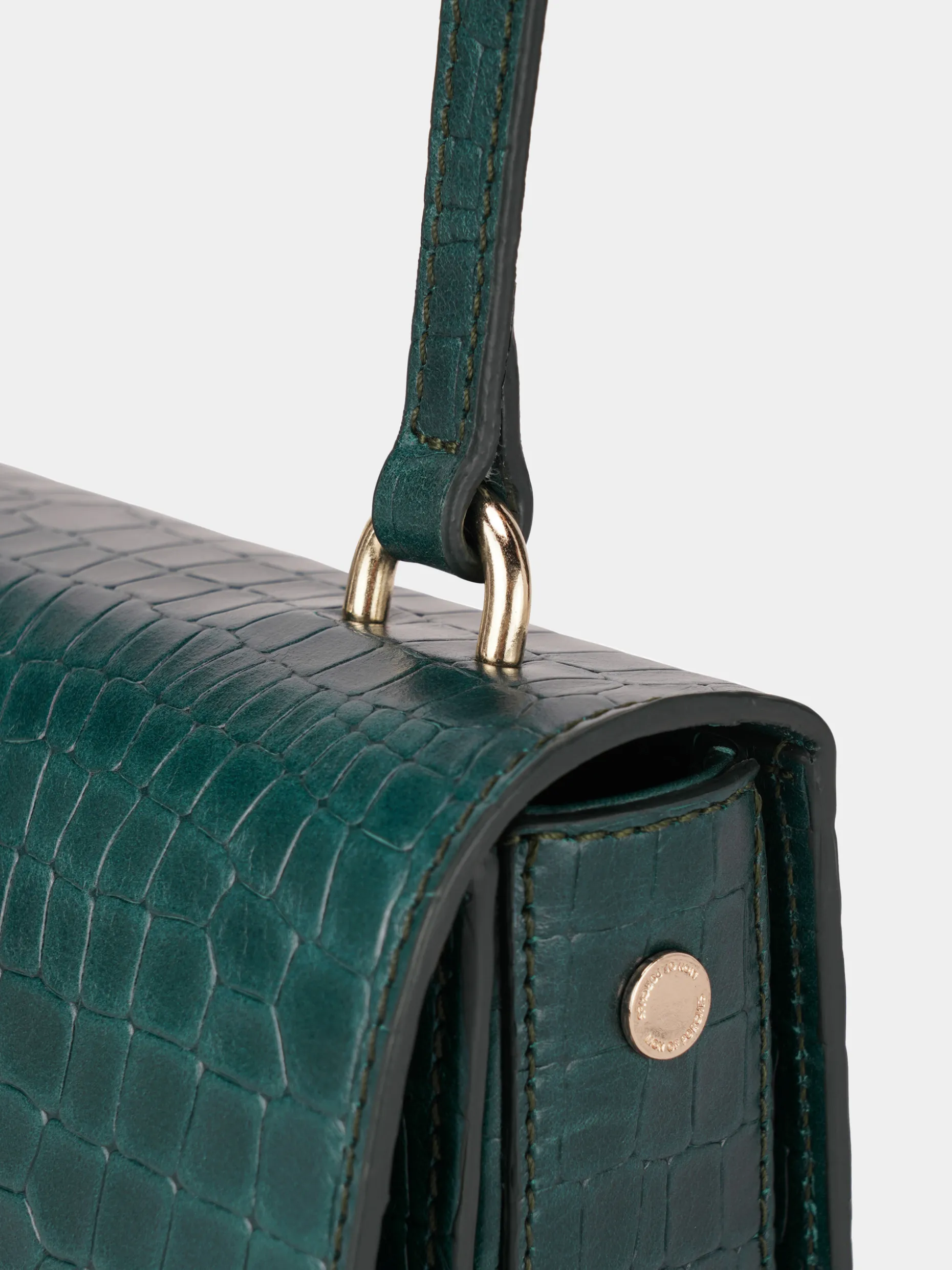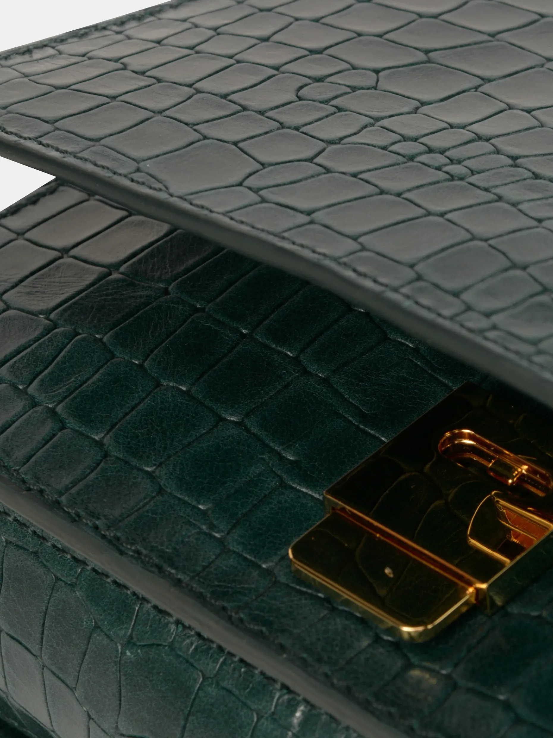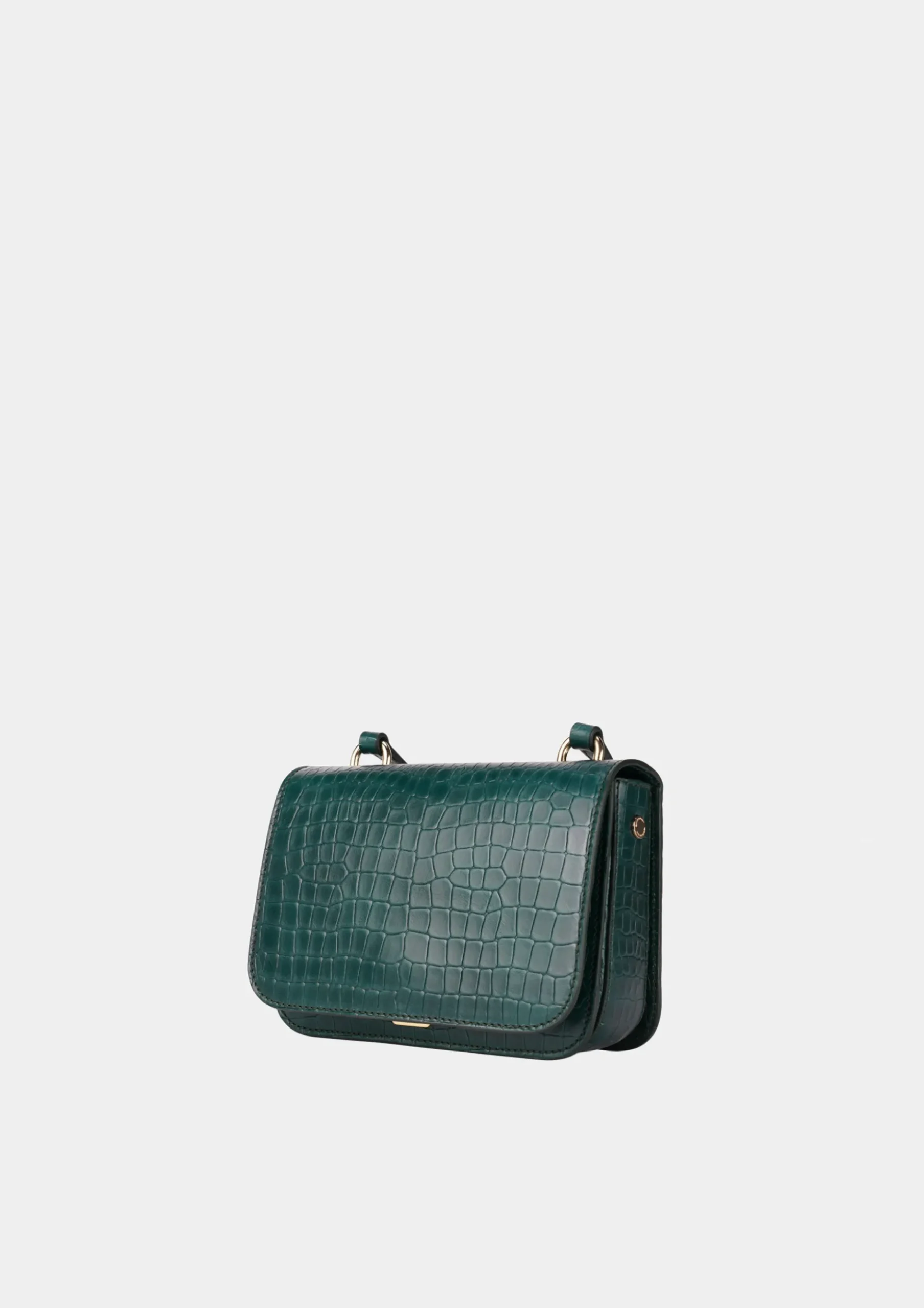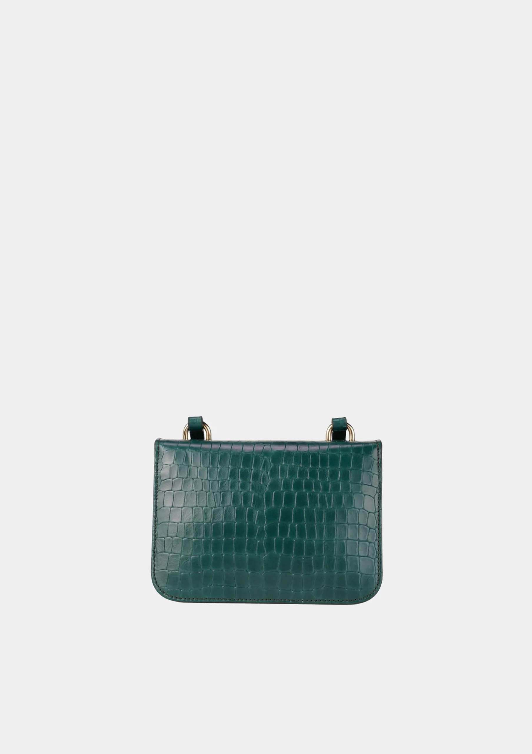 Mala pequena de formato retangular confecionada em pele. Alça a tiracolo ajustável. Finaliza com fecho metálico dourado.