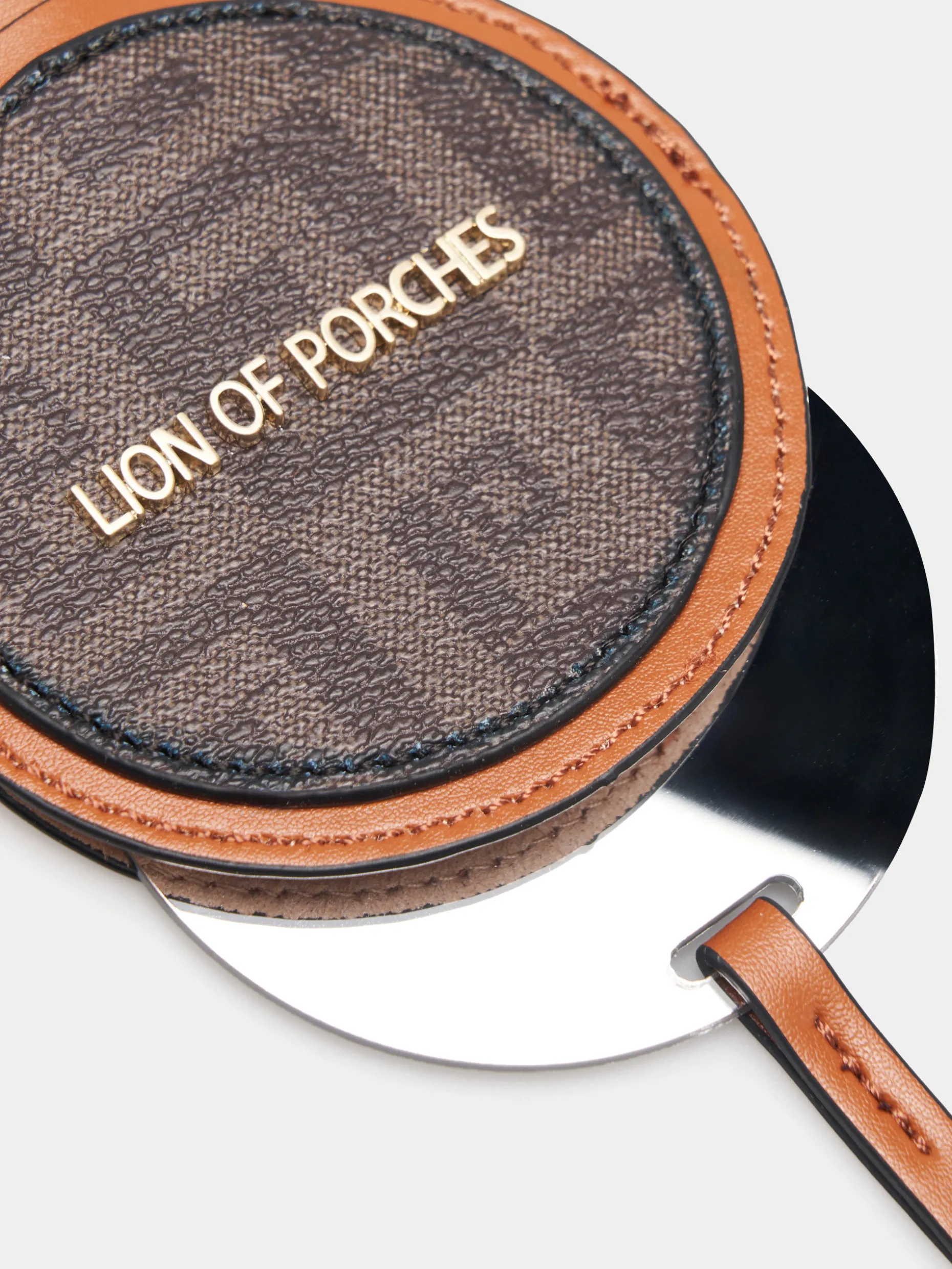 Garanta que está sempre no seu melhor com este pequeno espelho com penduro para colocar na carteira. Protegido com capa multicor de efeito pele com monograma da marca. Aplicação metálica dourada com logotipo Lion of Porches.