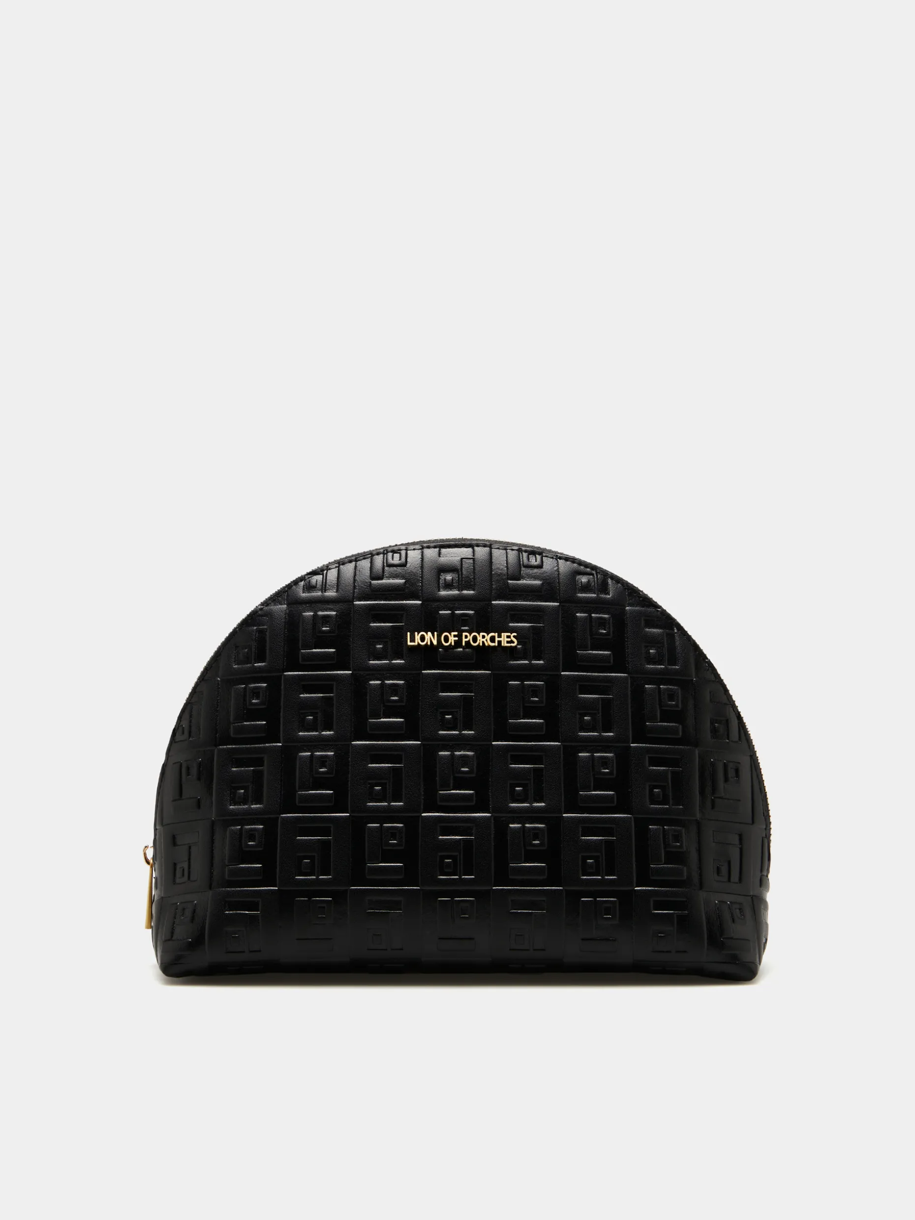 Necessaire preto, formato meia lua, com monograma gravado em relevo e logotipo dourado metálico aplicado na frente. Fecho de correr com zíper personalizado. Feito de matérias-primas vegan.