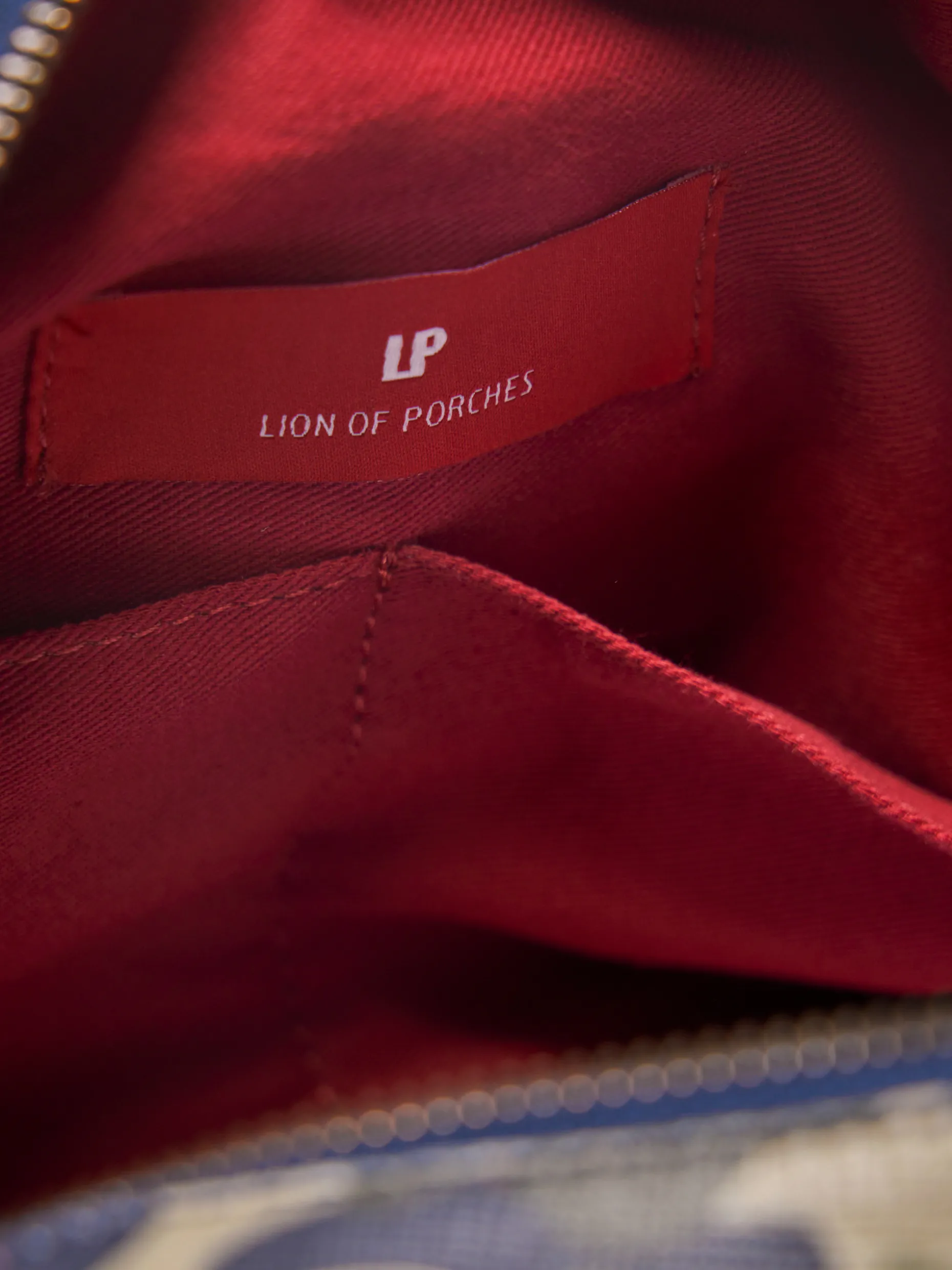 Necessaire com padrão. Em pele. Estampado personalizado na lateral. Fecho superior. Alça tricolor.
