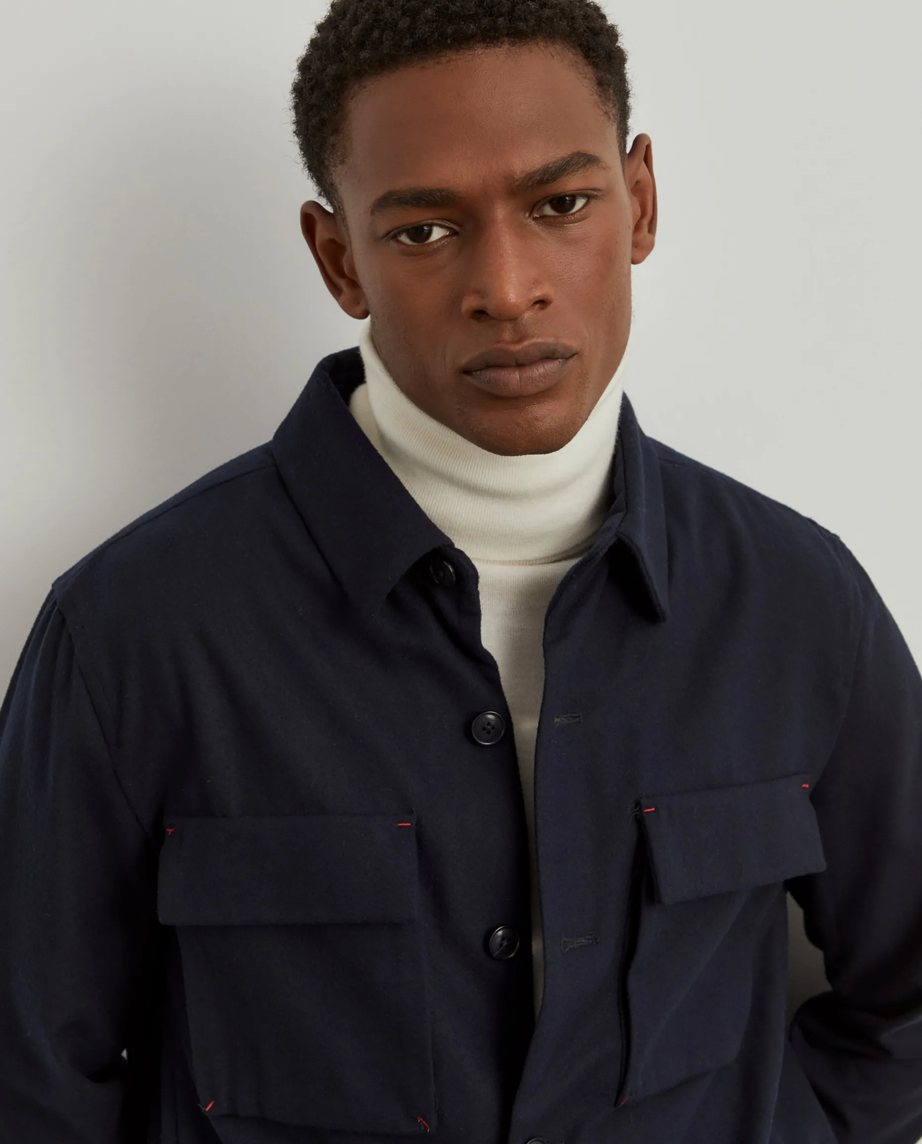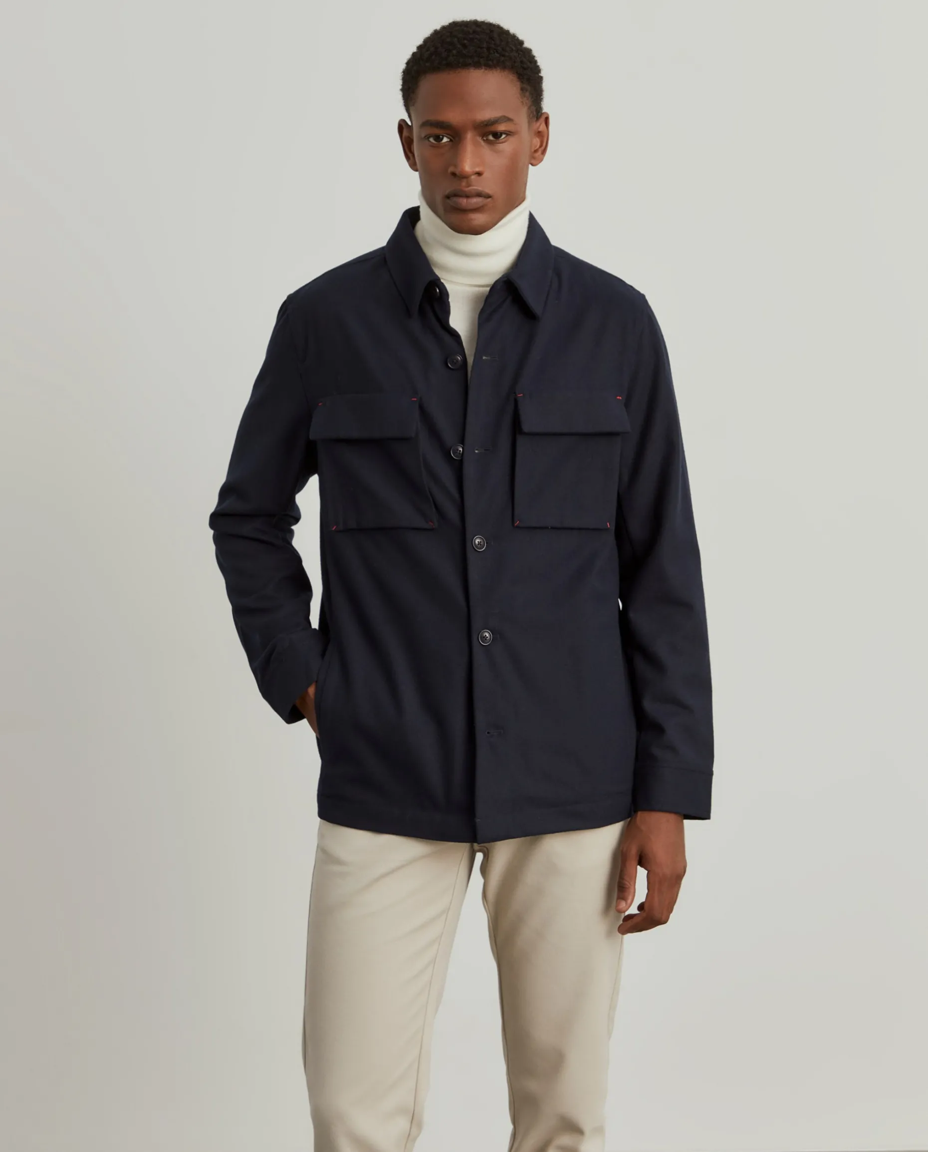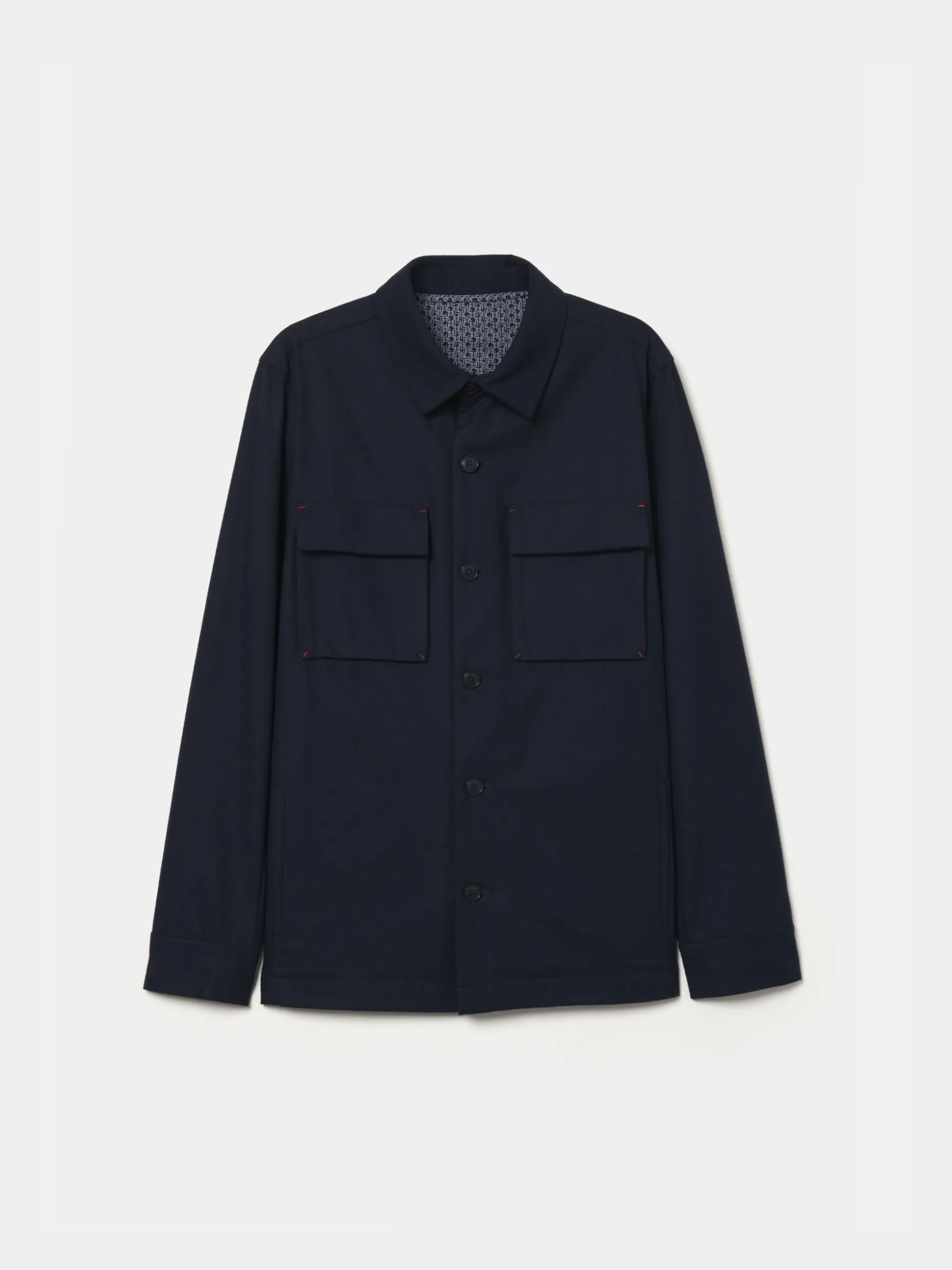 Sobrecamisa de manga comprida com bolsos de palas no peito. Bolsos na frente. Aperta com botões. Fita decorativa nos punhos. Fita decorativa no decote costas.