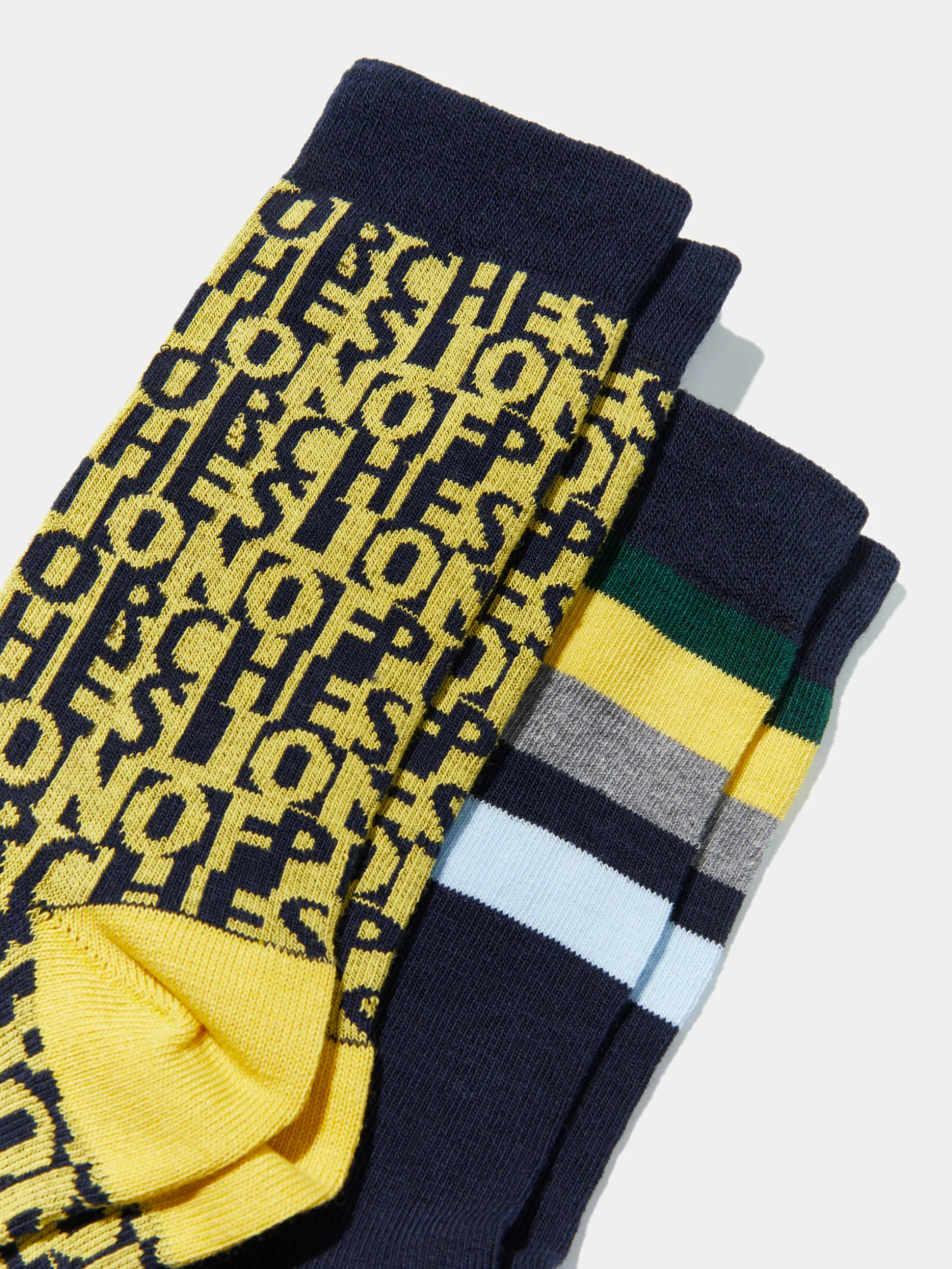 Em algodão elástico, este pack de dois pares de meias é o toque final perfeito em qualquer outfit. Um par conta com o jacquard Lion of Porches em contraste e o outro é liso com riscas multicolor.