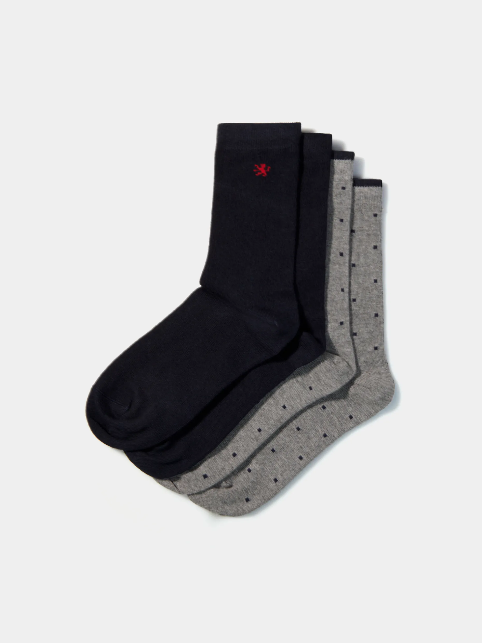 Pack de 2 pares de meias. Uma com quadradinhos e risca no topo em contraste e outra lisa com leão em contraste a meio.