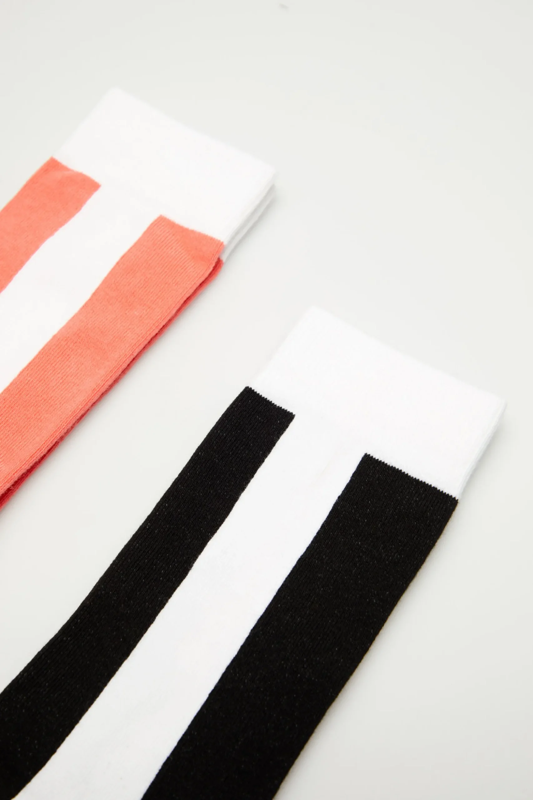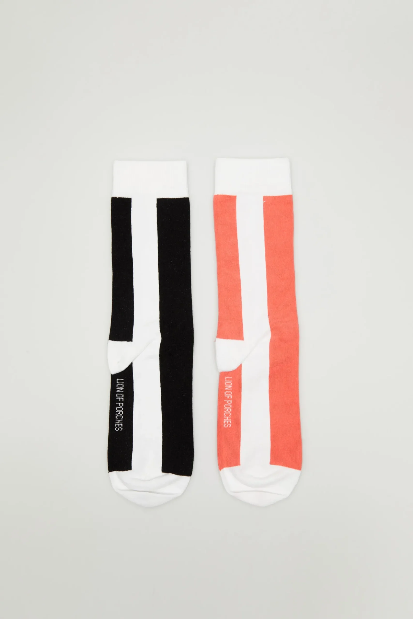 Pack de dois pares de meias com o mesmo padrão de barras verticais, mas de cor diferente. Personalização Lion of Porches na parte de baixo das meias.