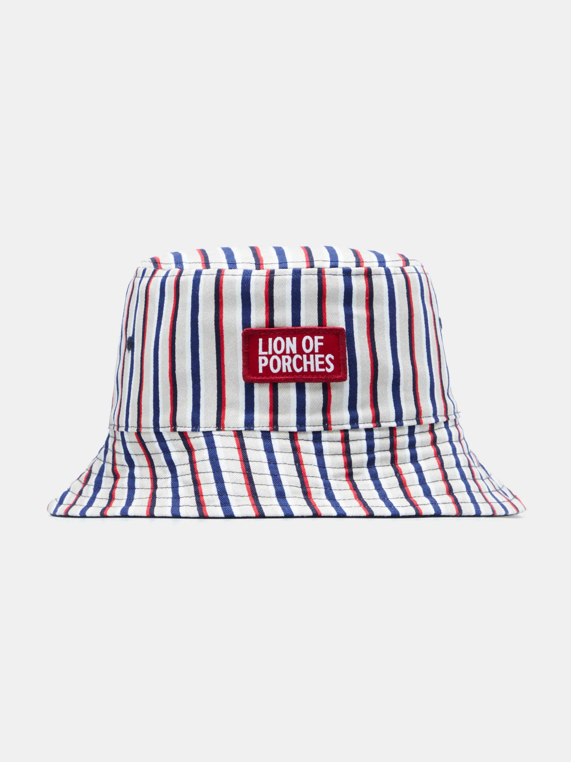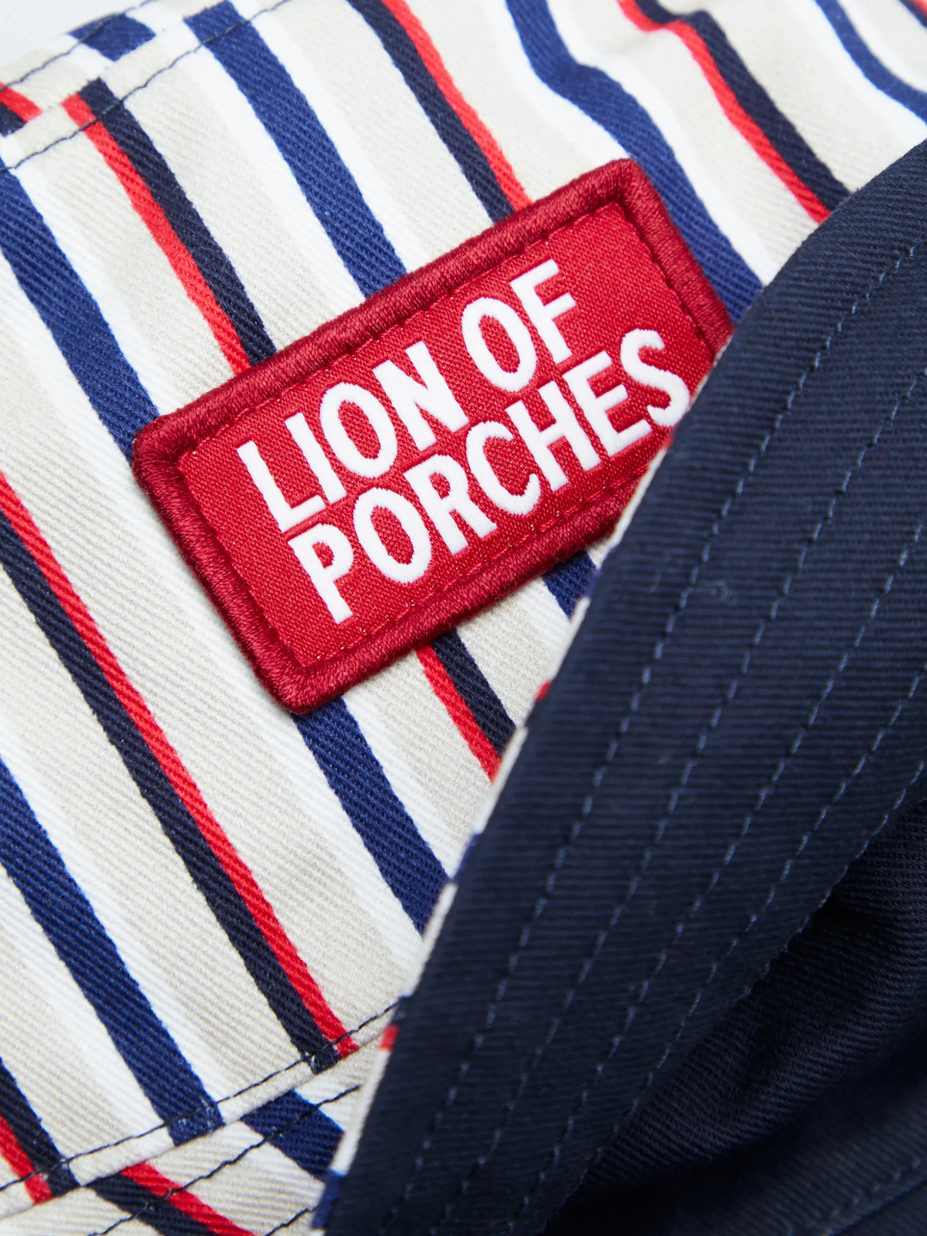 Panamá de algodão reversível. De um lado, liso, do outro com padrão de riscas. Ambos com etiqueta Lion of Porches em contraste.